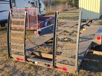 84 inch wide, 16 ft with 2 ft beaver tail deck, 60 inch stand up ramps, 2-5/16 inch ball hitch, spring suspension, jack, mobile home axles, spare, 8-14.5 axles