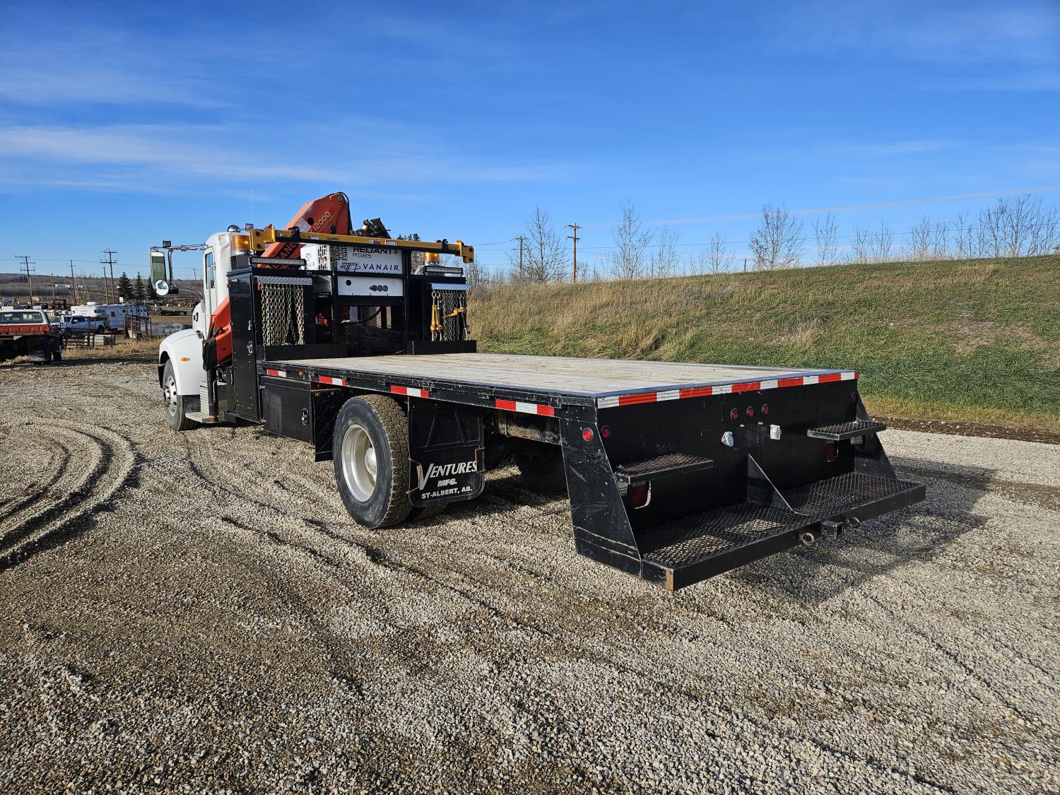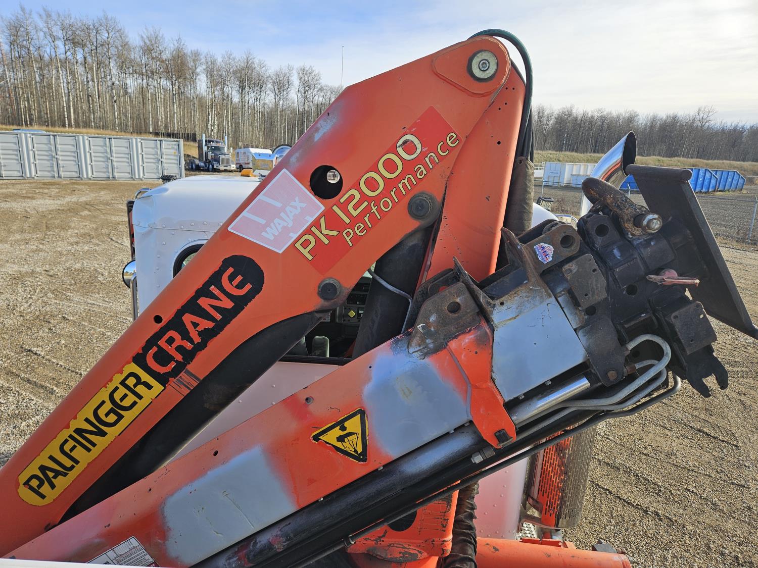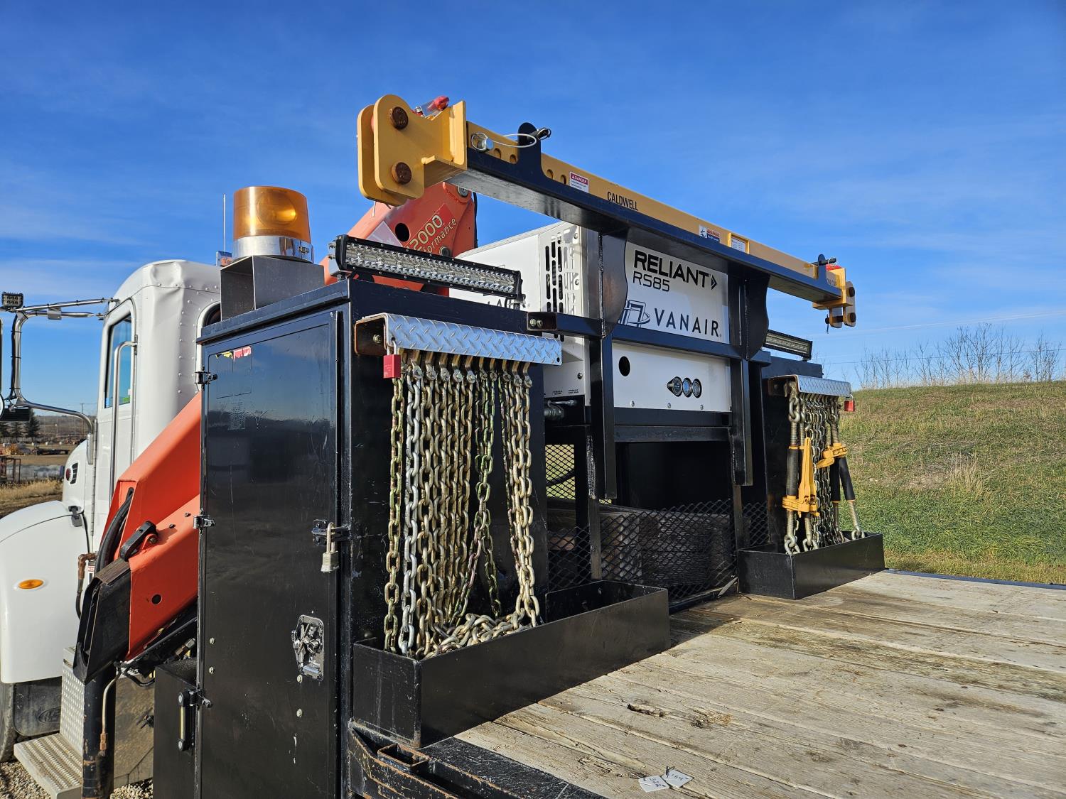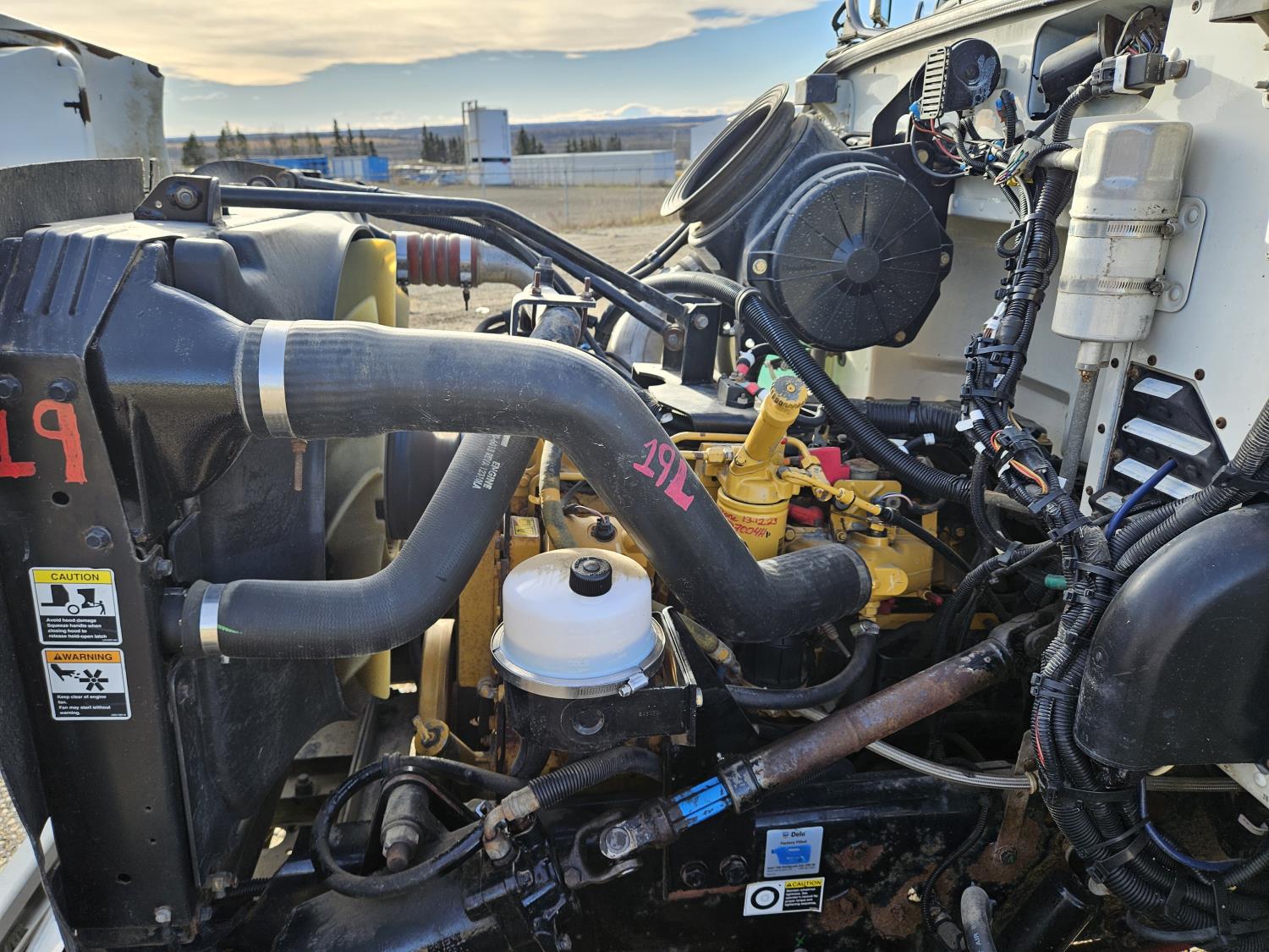 Caterpillar C7 6 cylinder engine, engine brake, engine block heater, positive air shutoff, 6 speed manual transmission, A/C, cruise control, air ride driver seat, radio, hydraulic wet kit, beacons, chain holders, steel tool boxes, 102" wide X 187" long deck, Palfinger PK12000 Knuckle boom crane, outriggers, 5000 lb Caldwell spreader bar, Reliant RS85 on board compressor, 20 gallon tank, Palfinger 12000 knuckle crane, outriggers, spring suspension, 12,000 lb front axle, 21,000 lb rear axles, diff lock, 11R22.5 tires