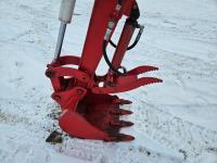 Enclosed cab, Lombardini 4 cylinder diesel engine, hydraulic automatic transmission, 70 inch toothed loader bucket, 18 inch dig backhoe bucket, manual coupler, hydraulic thumb, 1 front auxiliary hydraulics, 48 inch stick, outriggers, Q/A front bucket, radio, swivel seat, with (3) extra attachments, (1) 4 in1 loader tooth bucket, (1) 57" loader Fork Grapple, (1) 15" backhoe thumb bucket, 23.5/70-16 tires