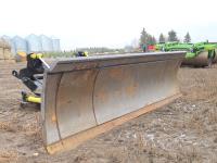 16 ft plus 1 ft bolt on extensions on each side making the blade 18 ft, Quick hook up hydraulic hose connection, the front of the blade is double face plated, has adjustable skid shoes, the mounts are on the Versatile 610DT tractor and will be removed if the tractor buyer doesn’t buy the blade