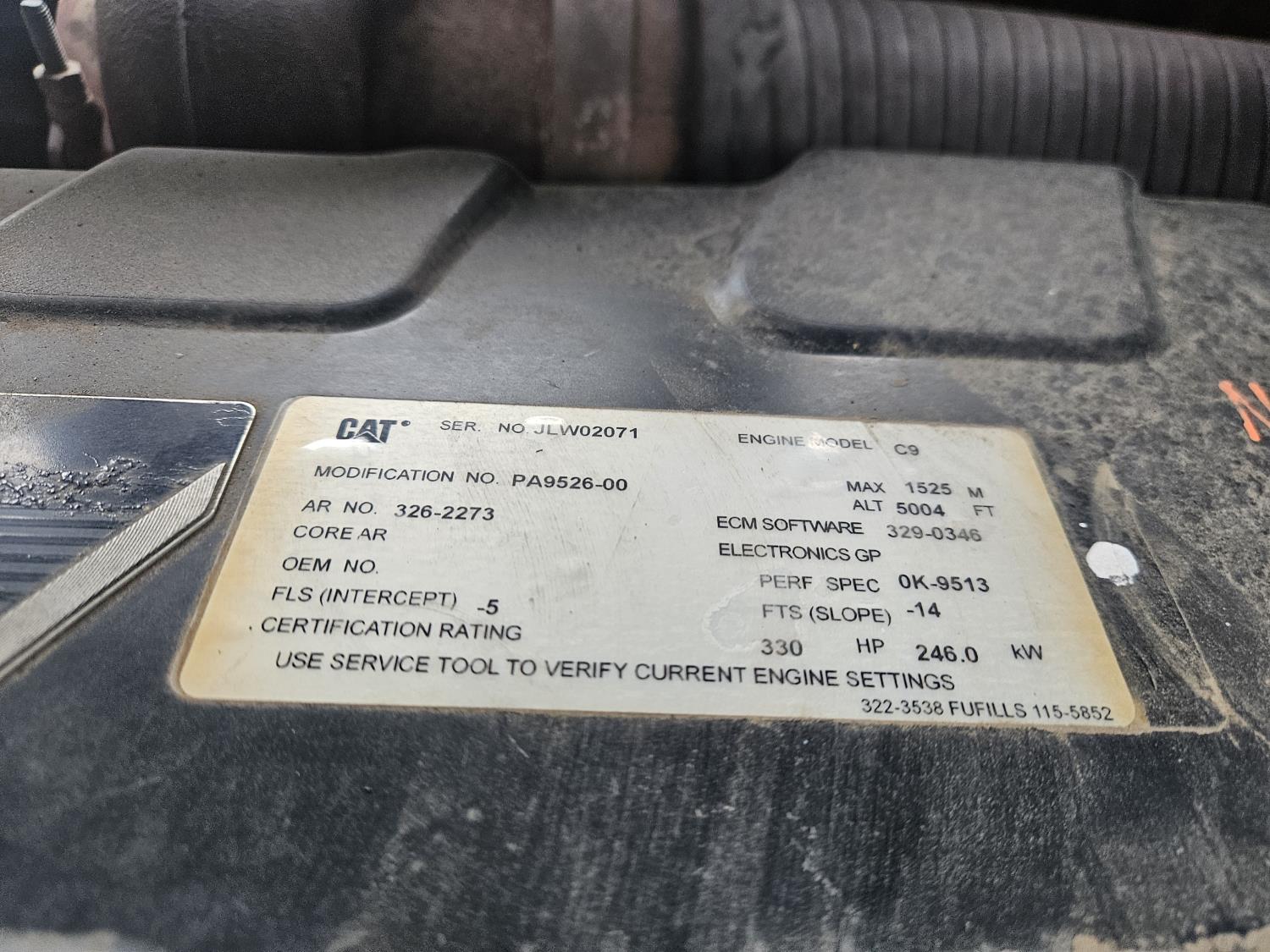 Caterpillar C9 8.8 L 6 cylinder 330 HP, diesel engine, 265 PTO HP, 16 speed power shift transmission, cab, A/C, radio, buddy seat, 16 front weights, Big 1000 PTO, 3 point hitch, 4 rear hydraulic outlets, (1) high flow hydraulic couplers, 25 inch tracks