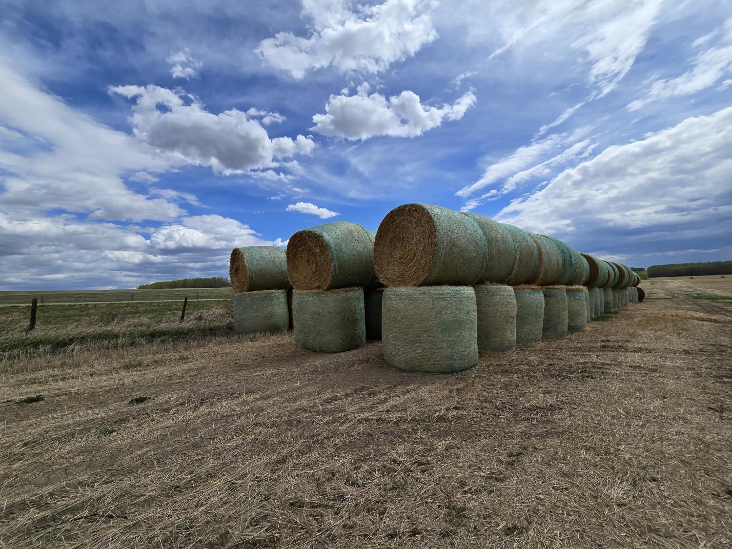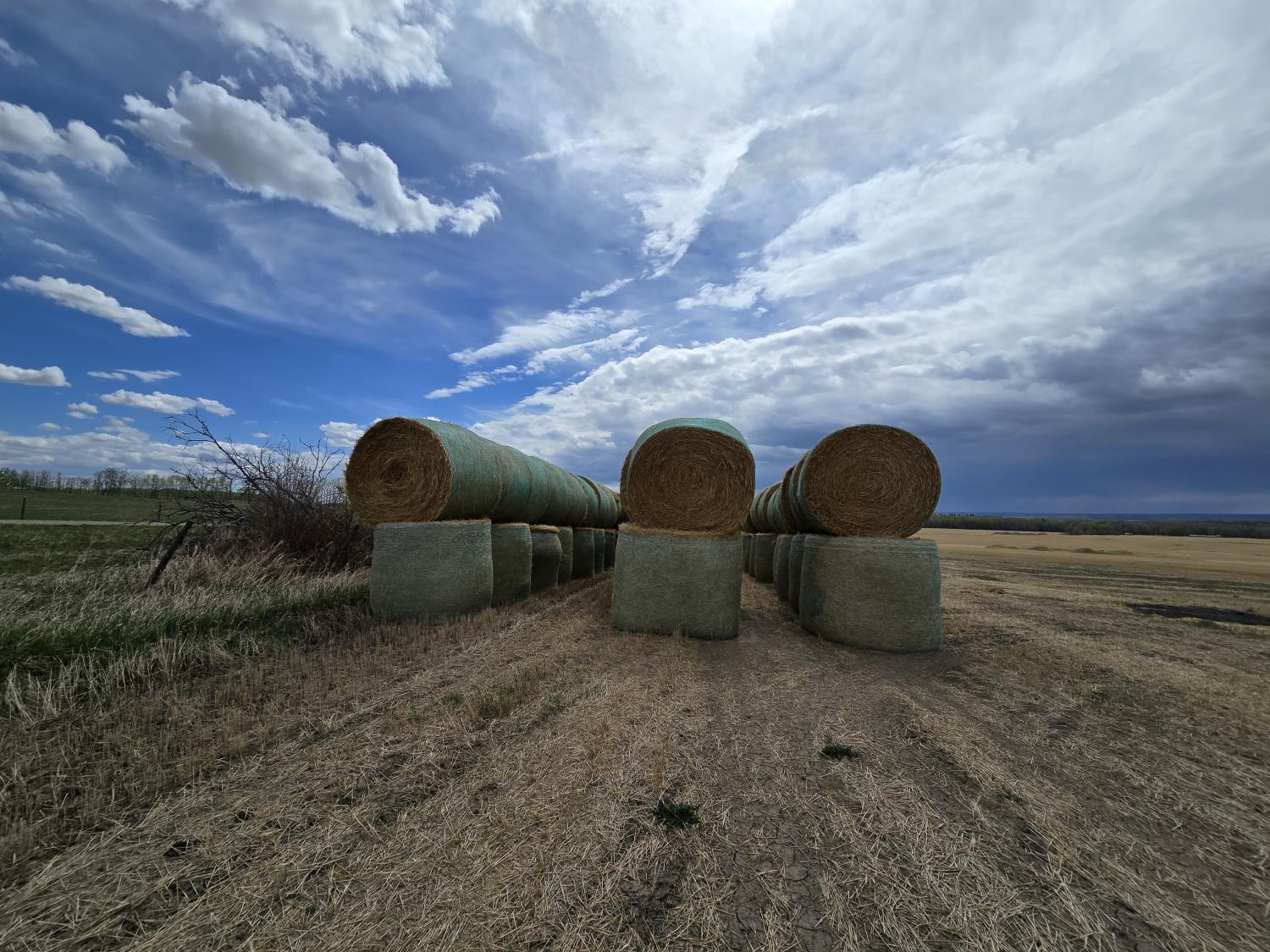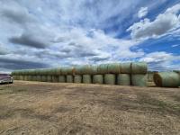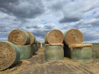 cut w/ conventional combine, baled w/ john deere 568 baler, triple mesh wrapped, mushroom stacked.