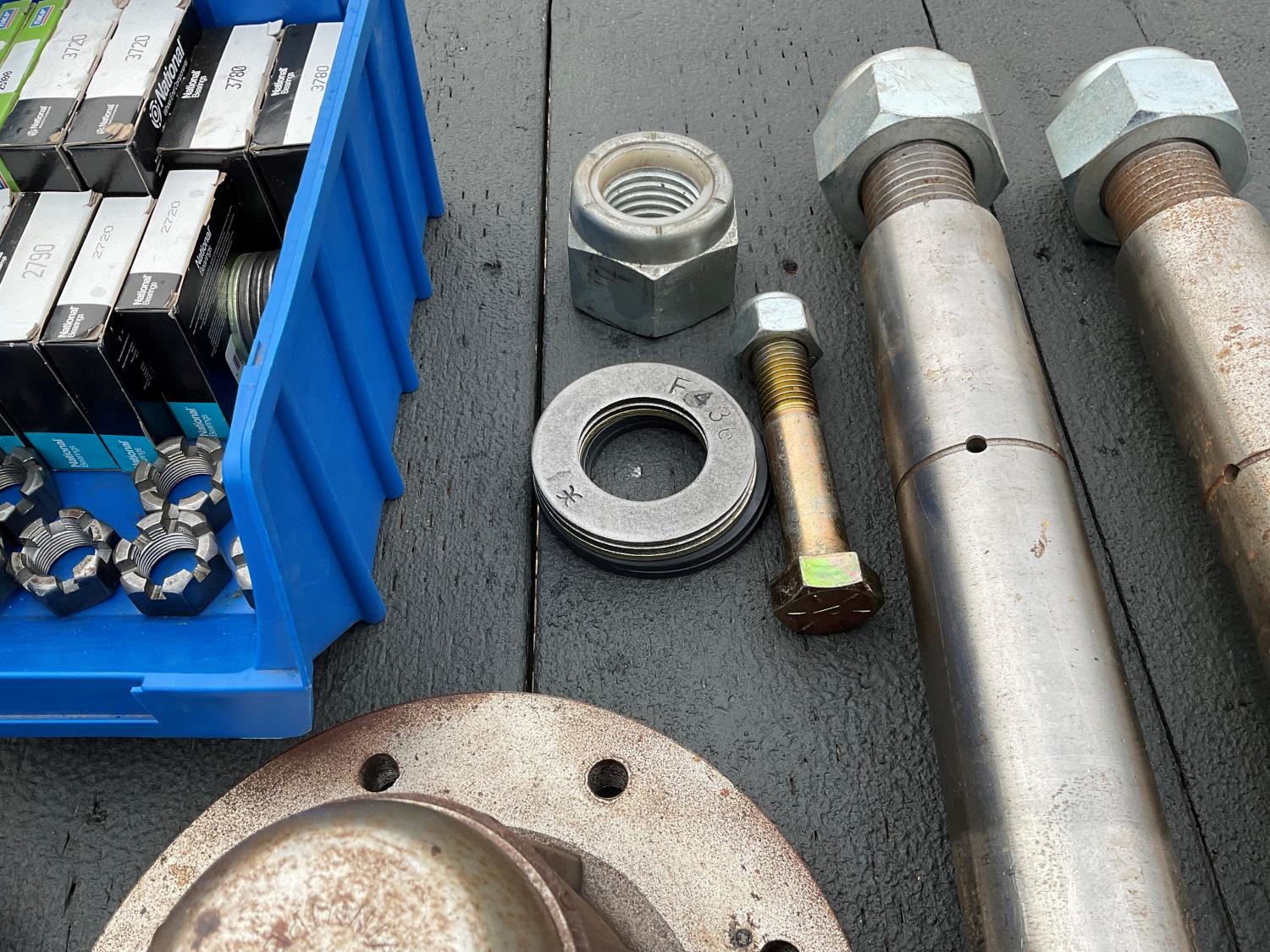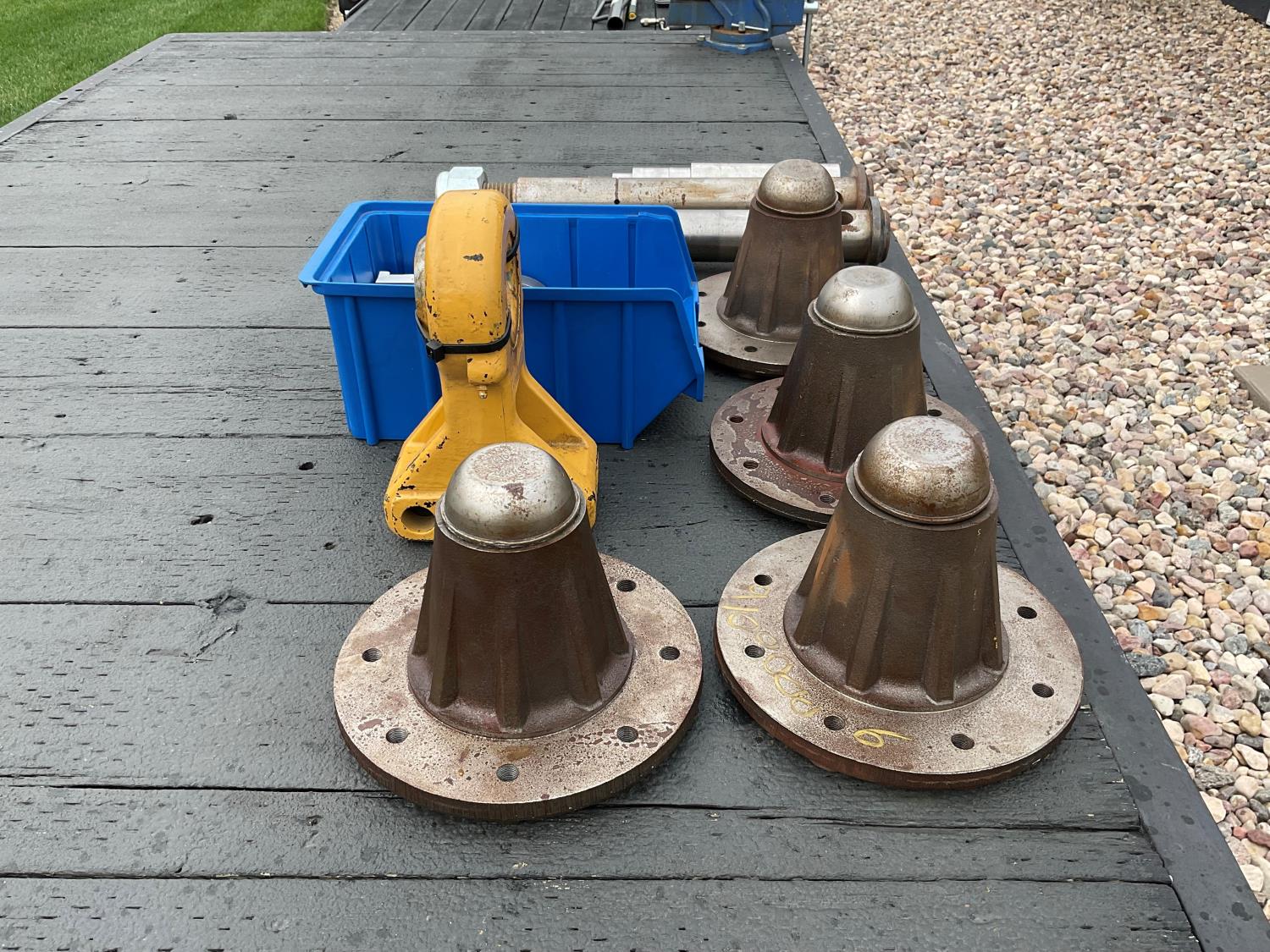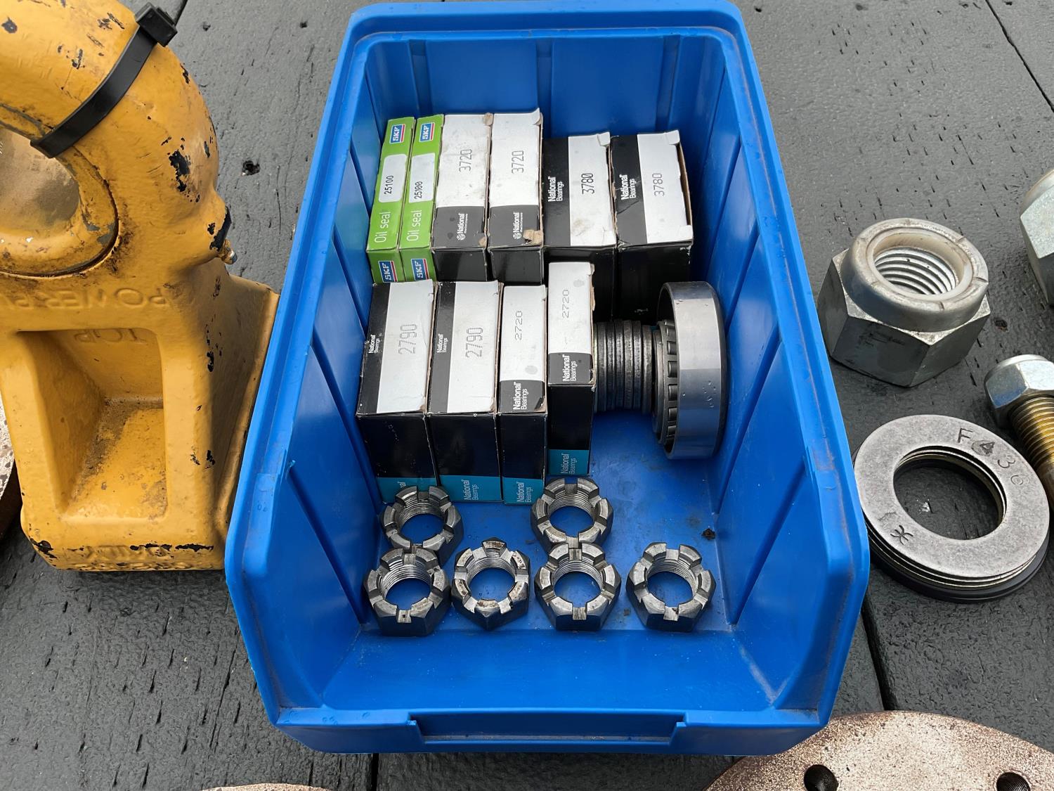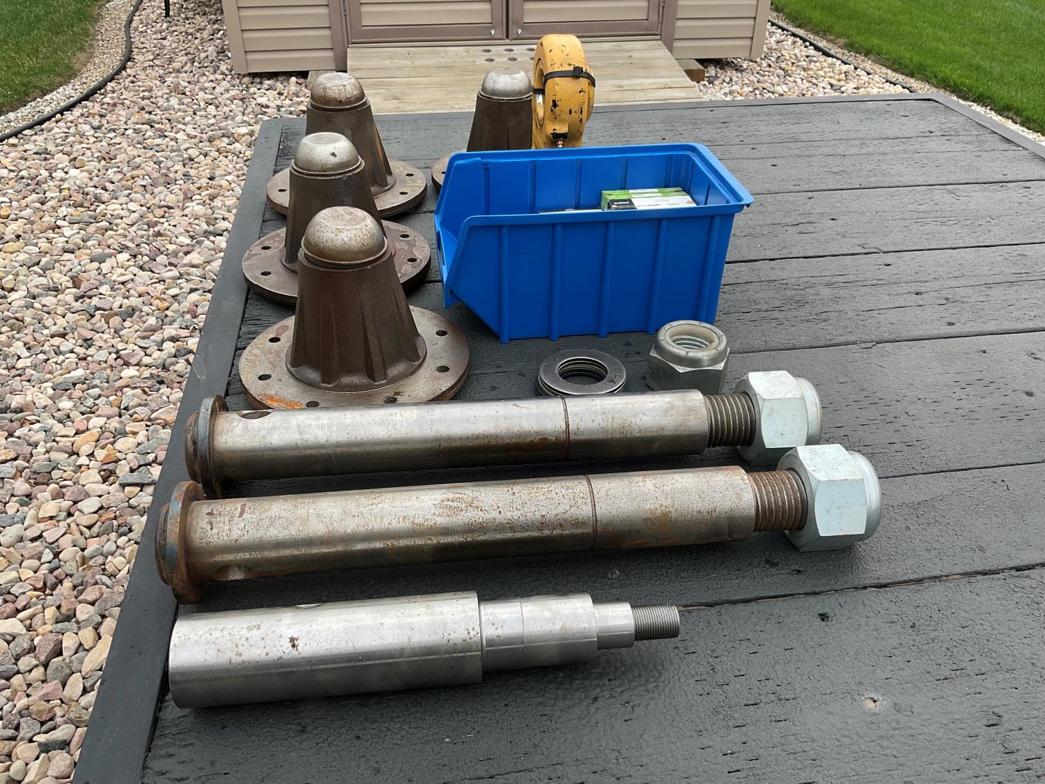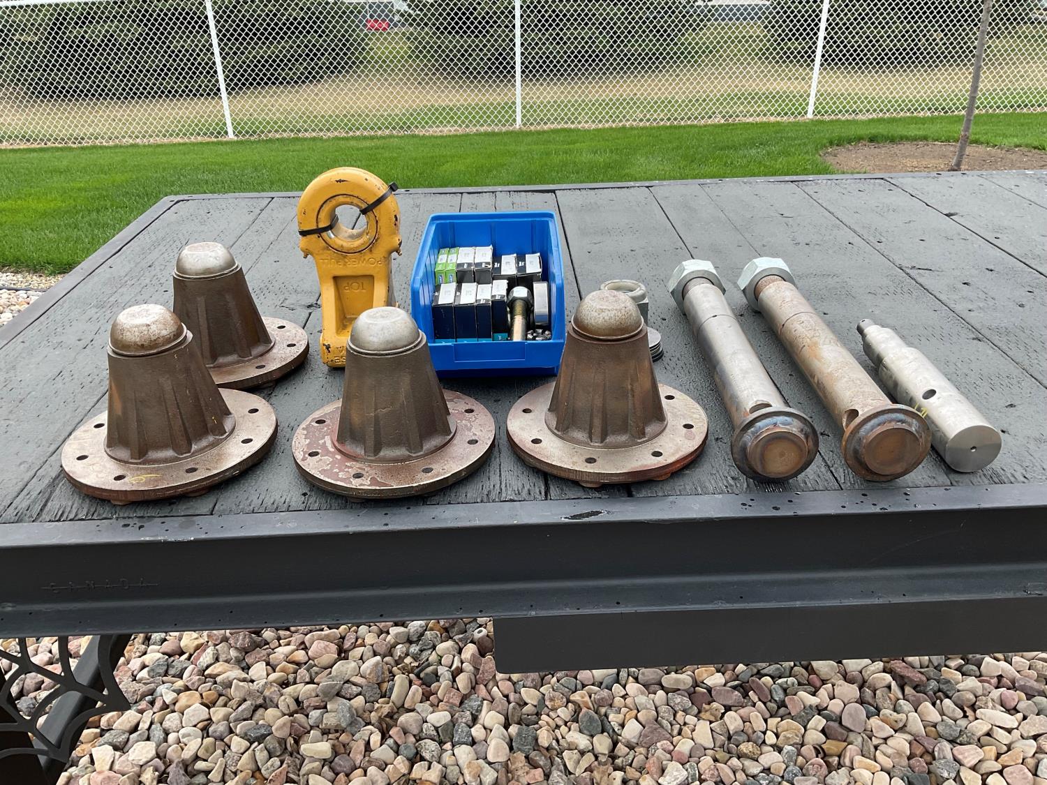 (4) wheel hubs #H812D, axle spindle, (2) rear pivot pins, bull pull cat 4 hitch, bearings, seals, washers