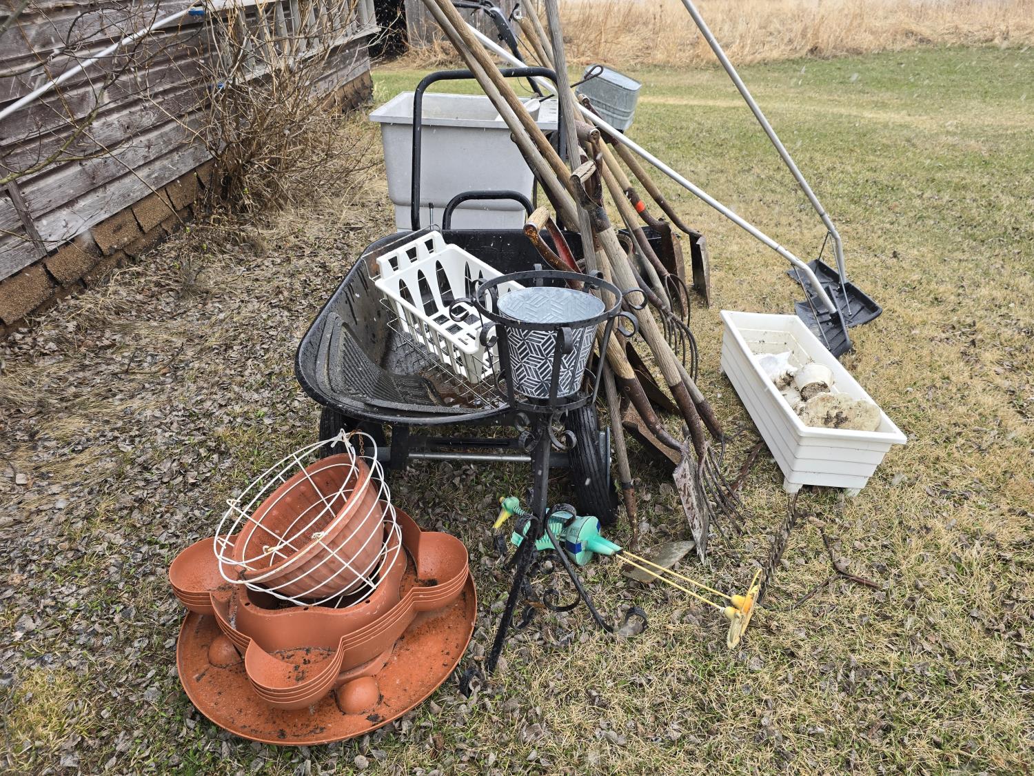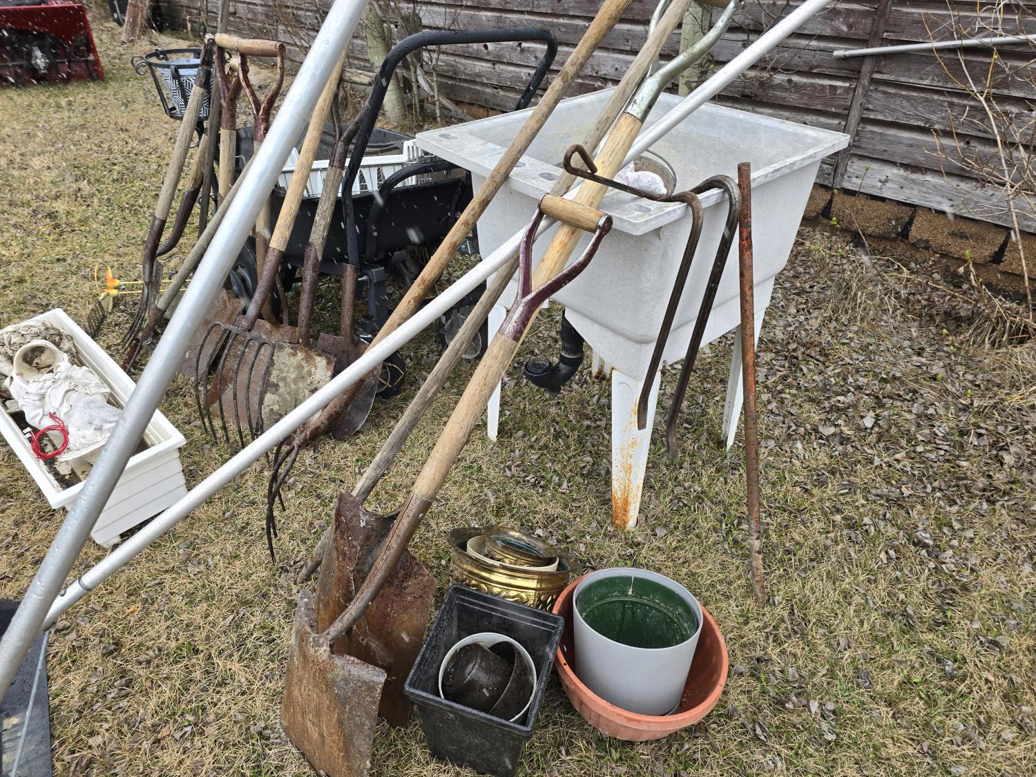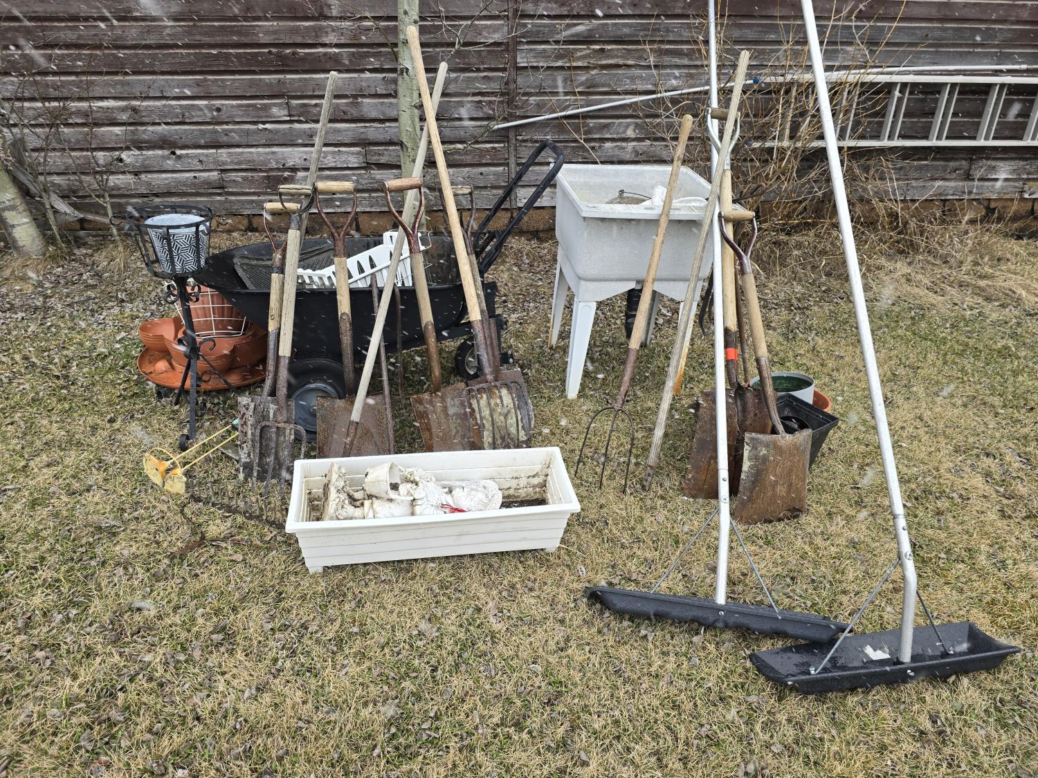 pots, tools, utility sink, wheelbarrow, snow scrapers