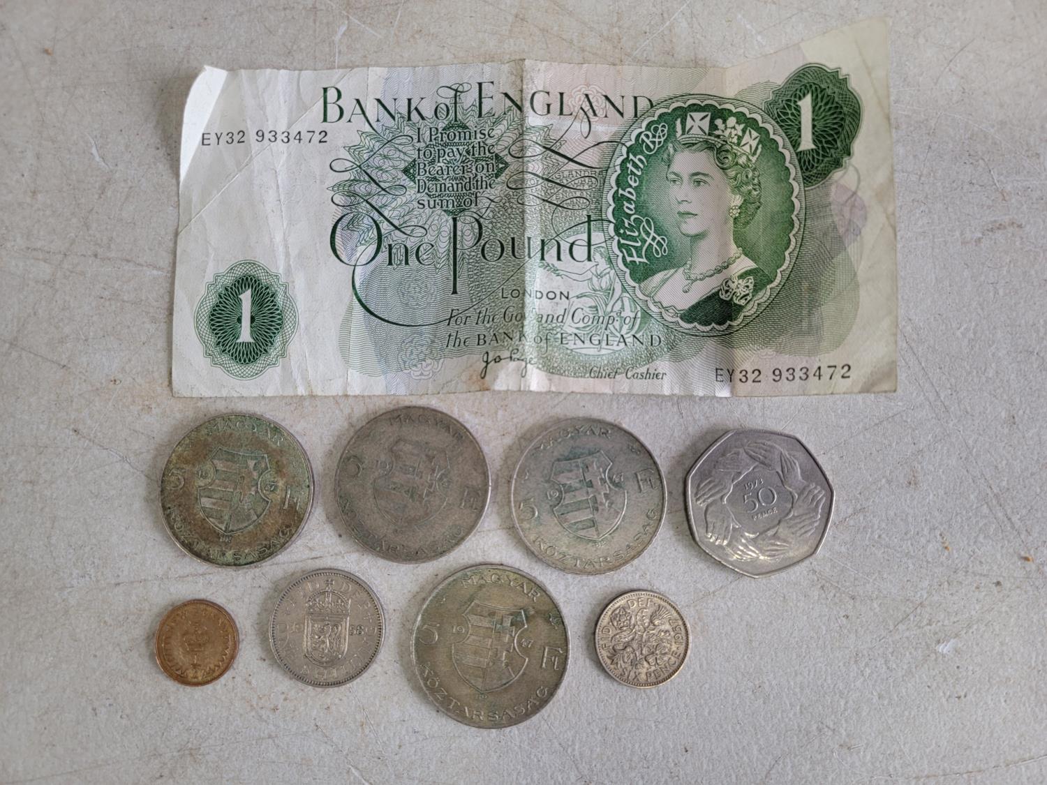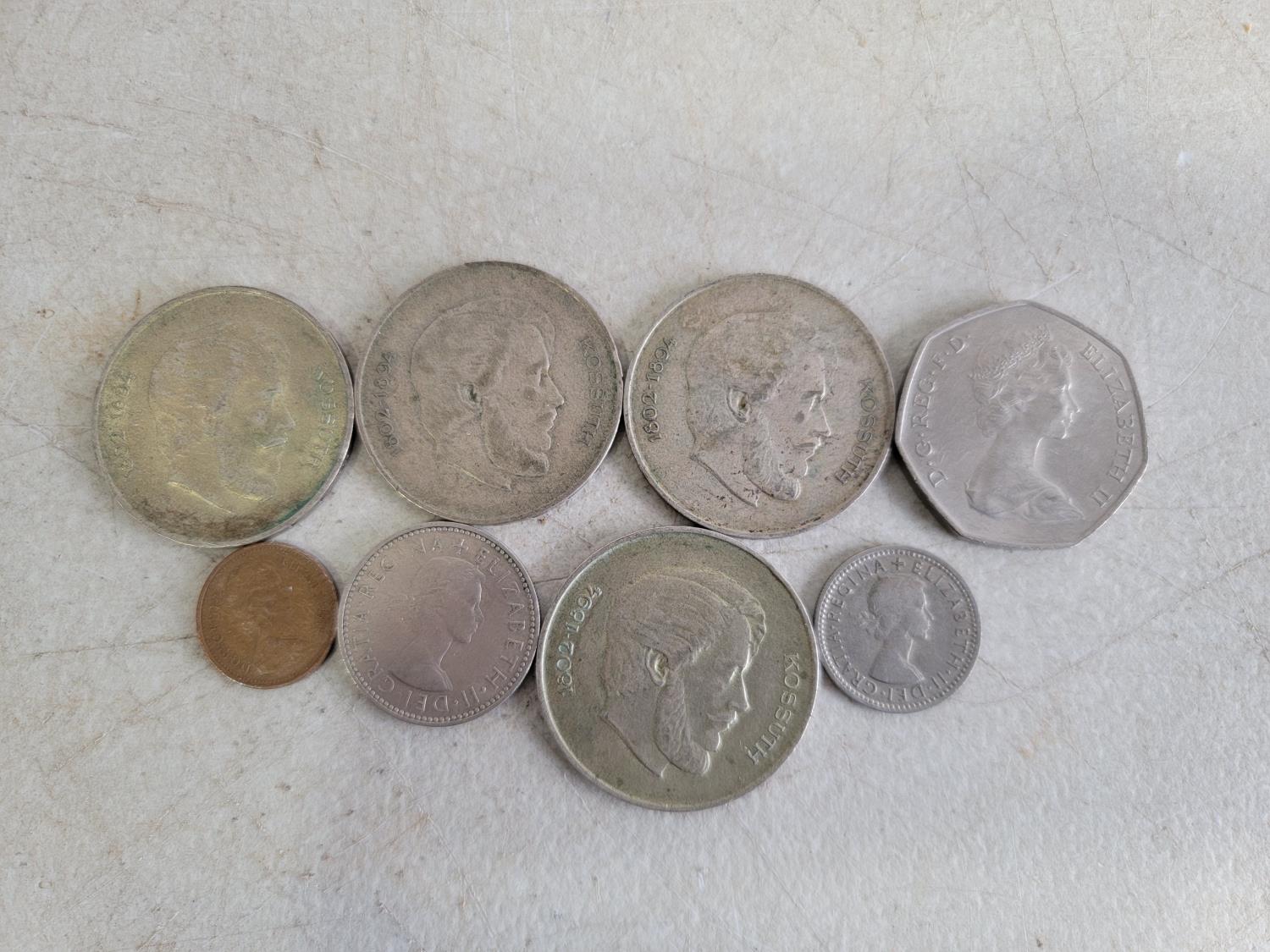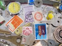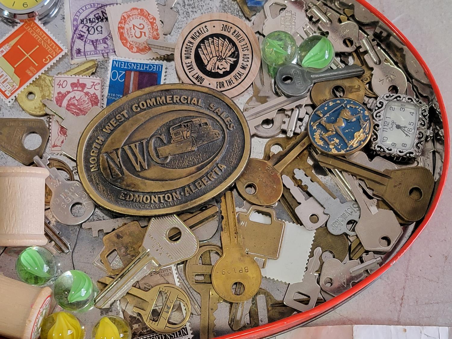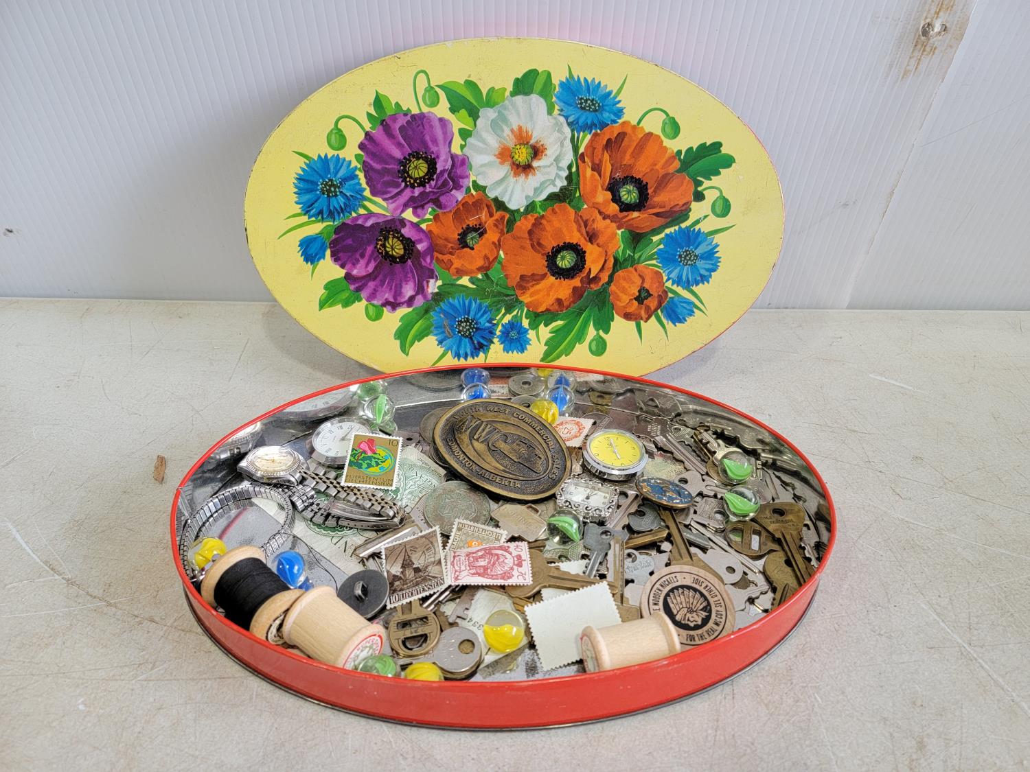 Vintage tin from England, coins, stamps, watches, keys, marbles