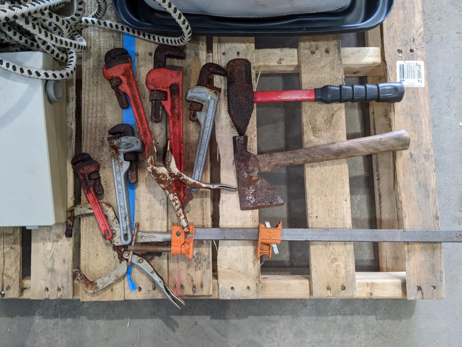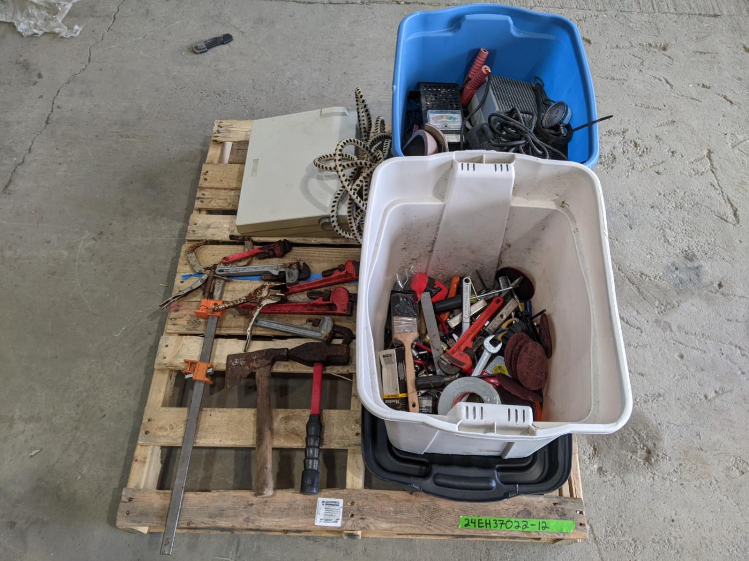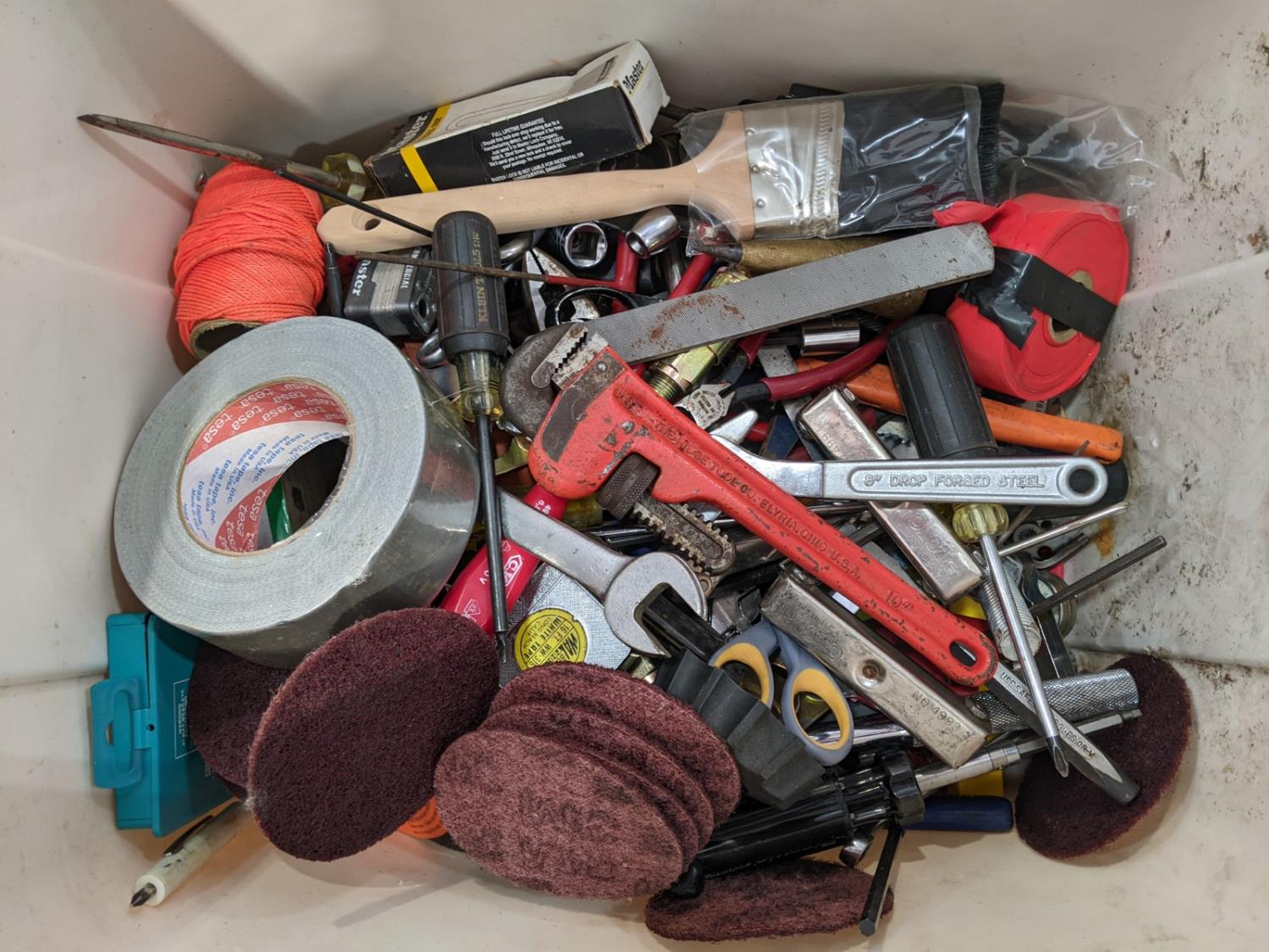 pipe wrenches, clamps, screw drivers, battery tester, drill bits