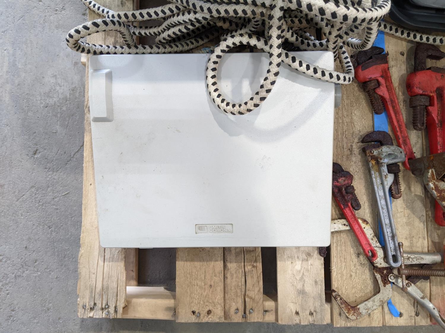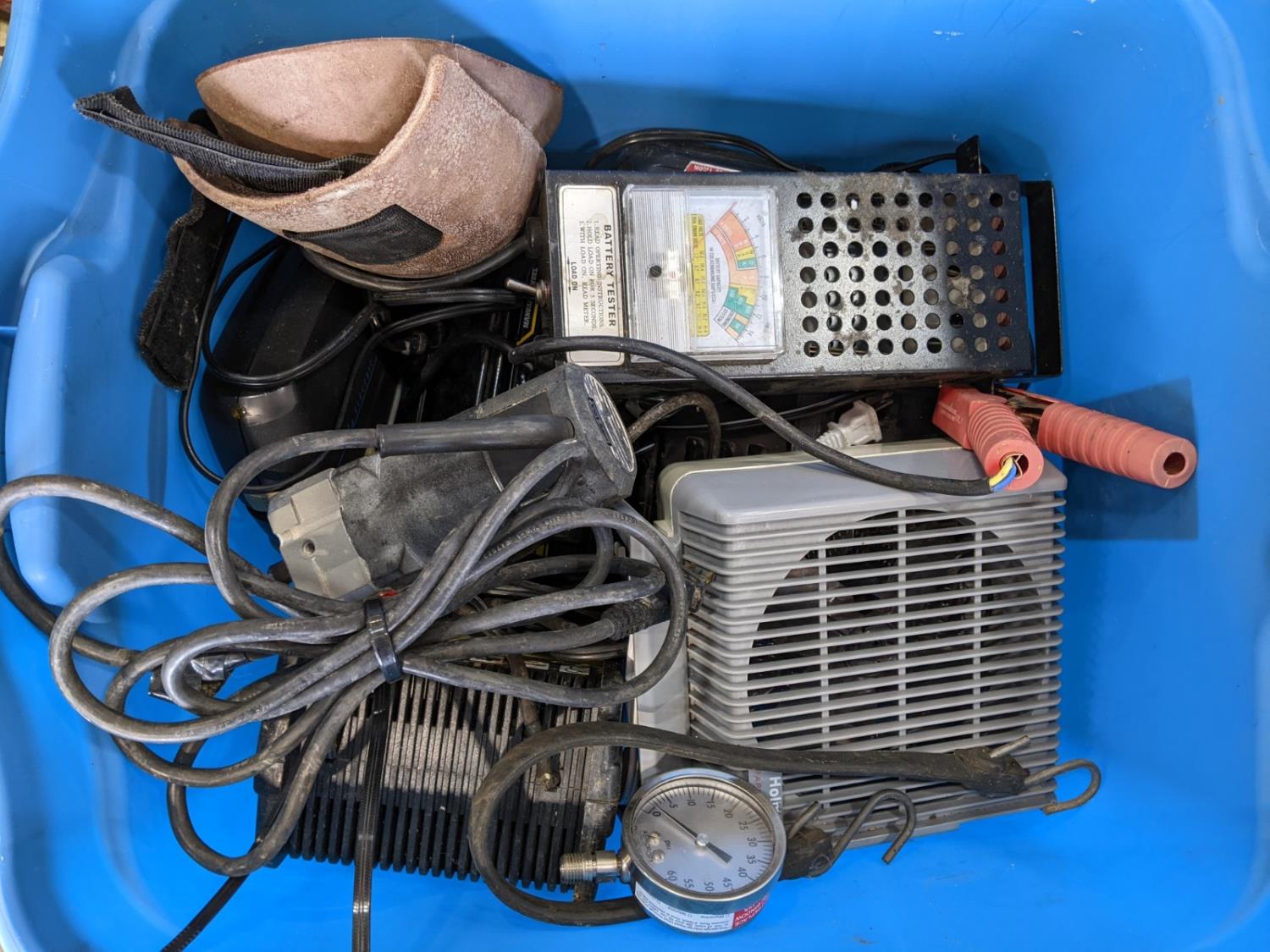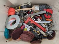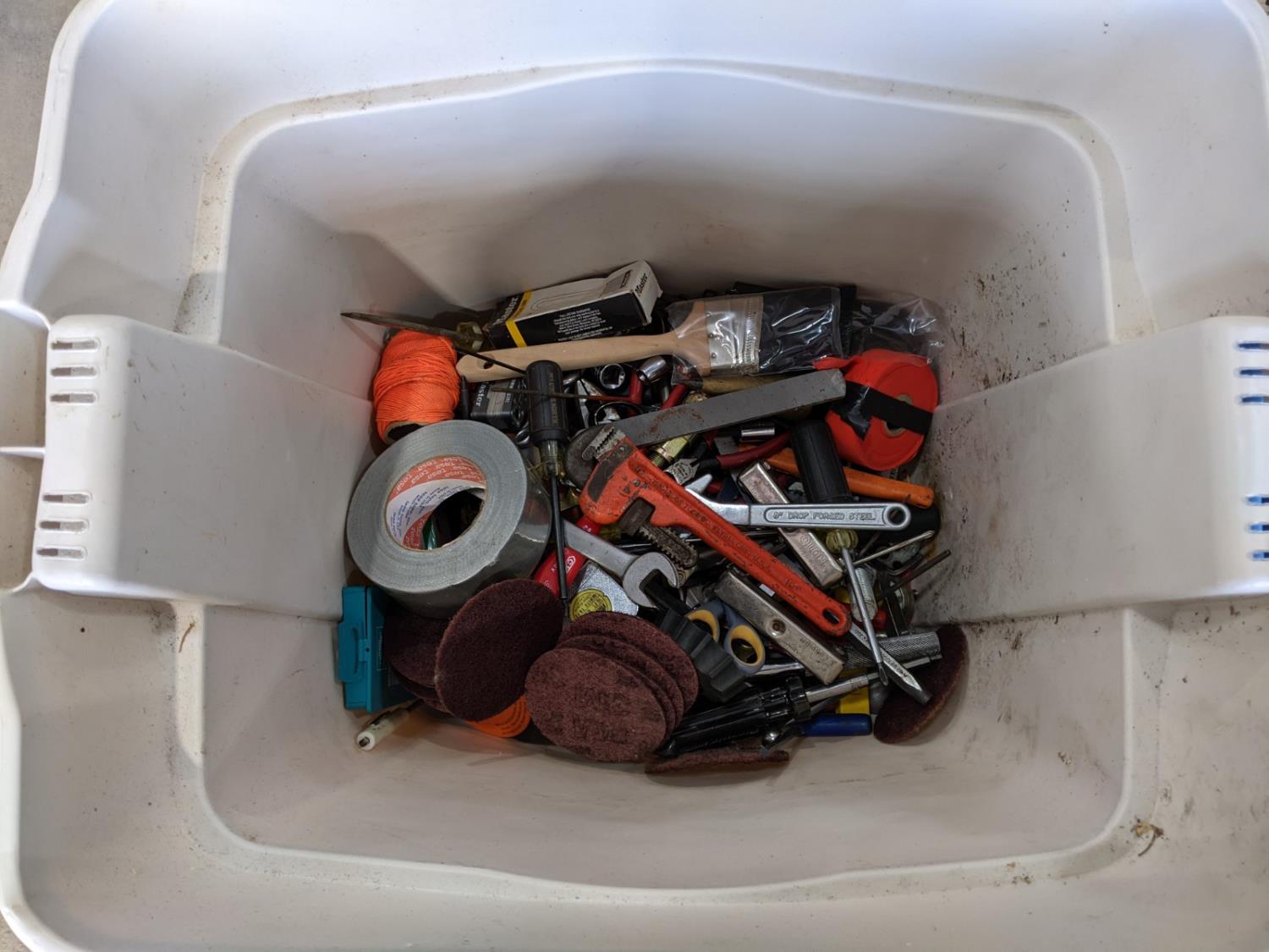 pipe wrenches, clamps, screw drivers, battery tester, drill bits