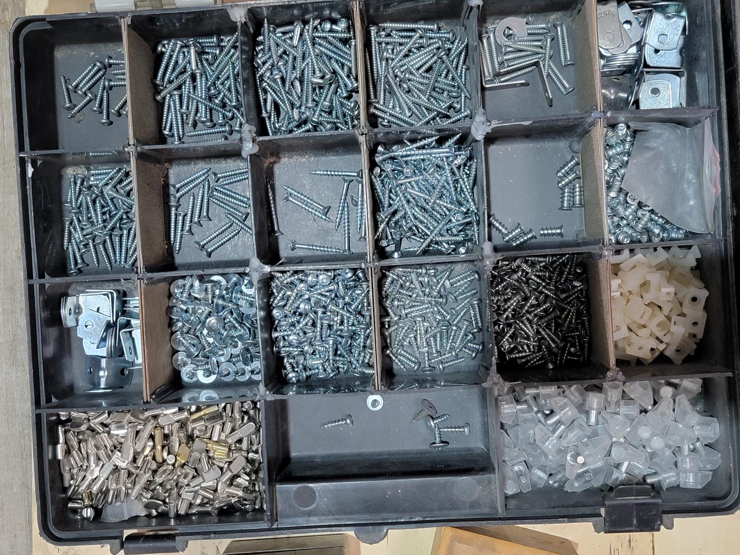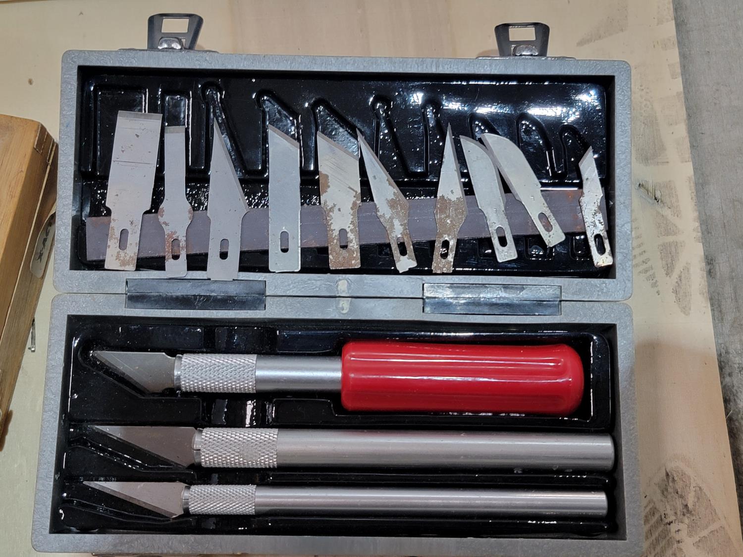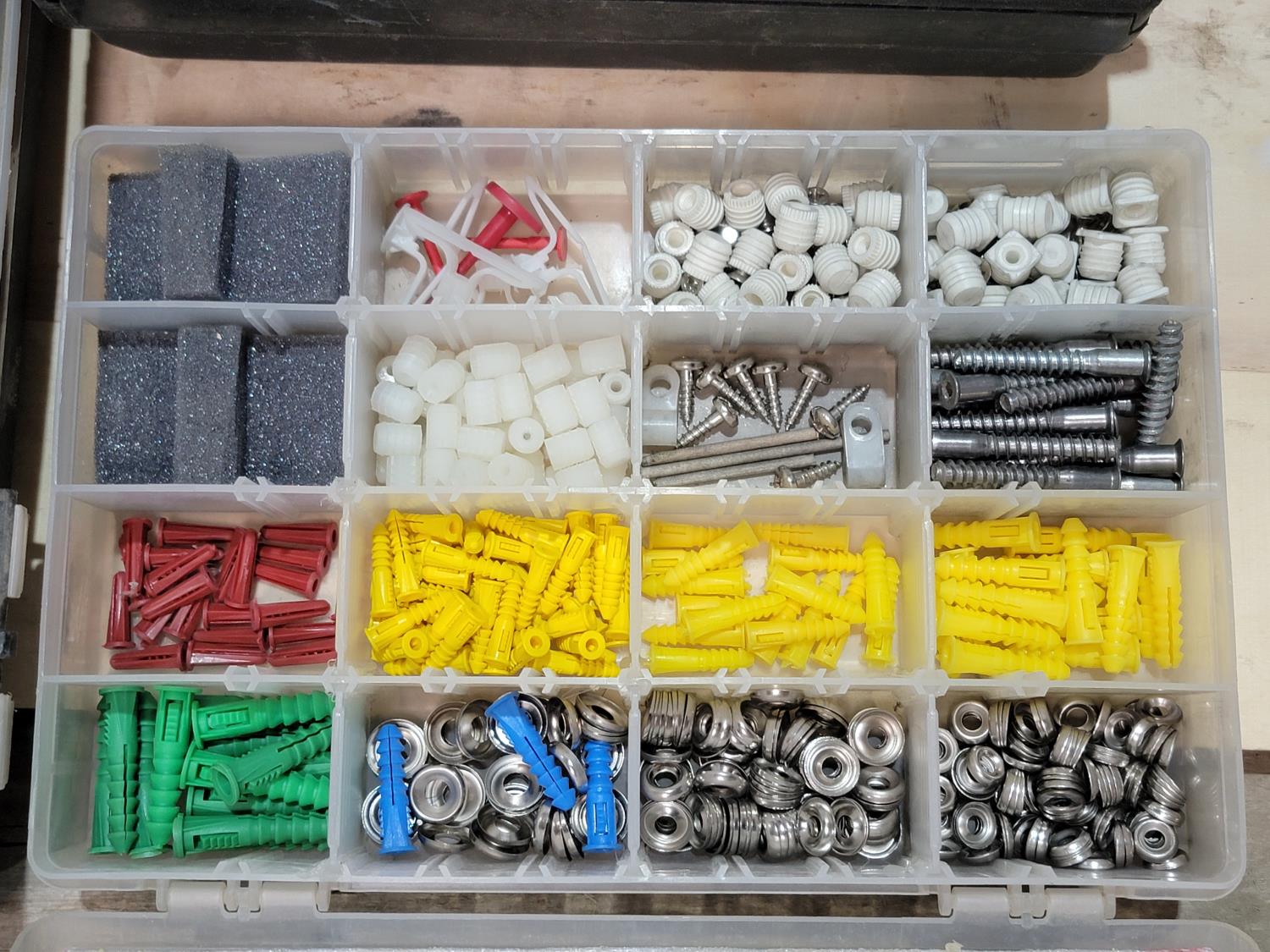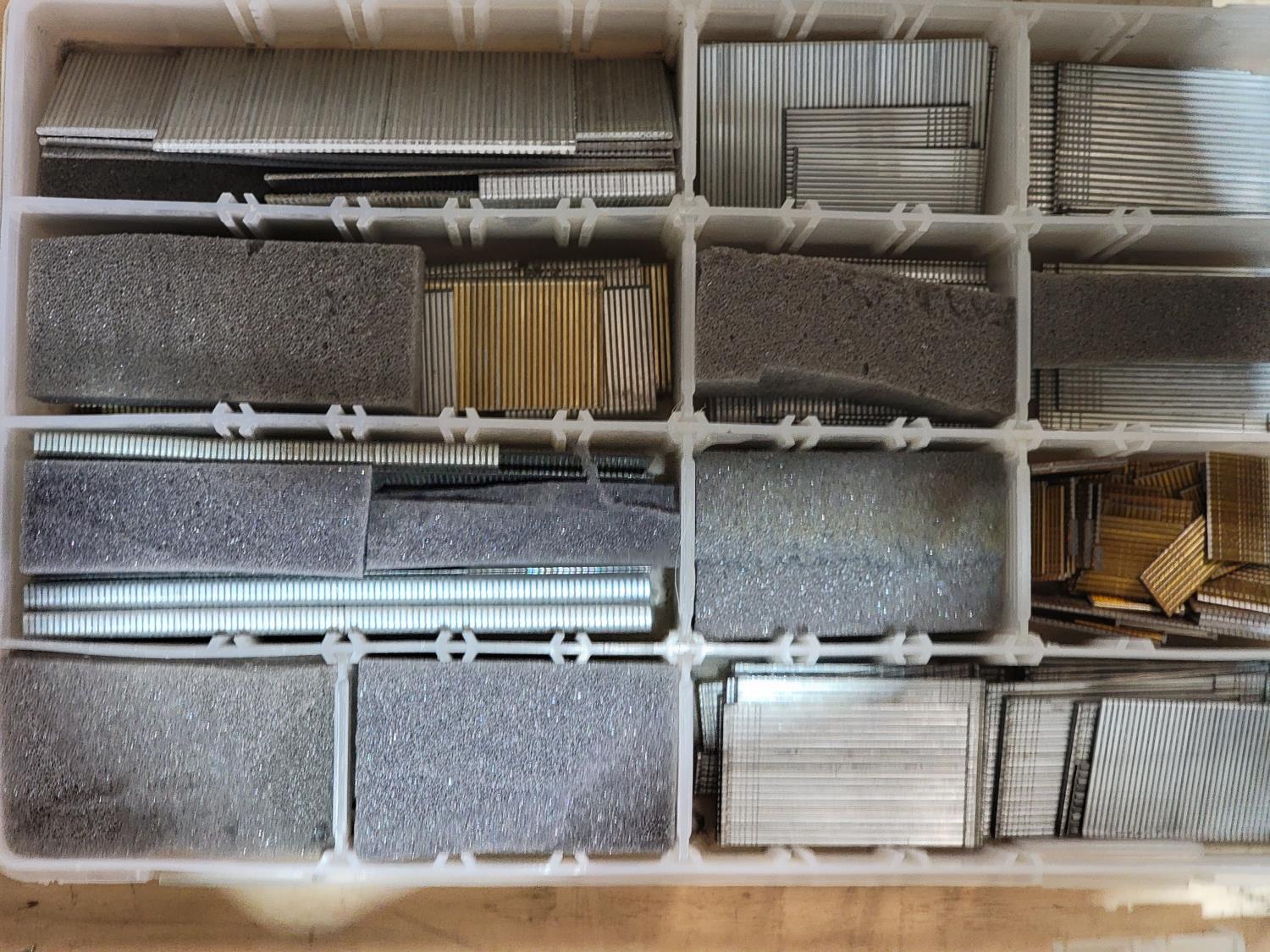 staples, screws, metric sockets, screw taping kit, computer mouse and controllers, knives with changeable blades