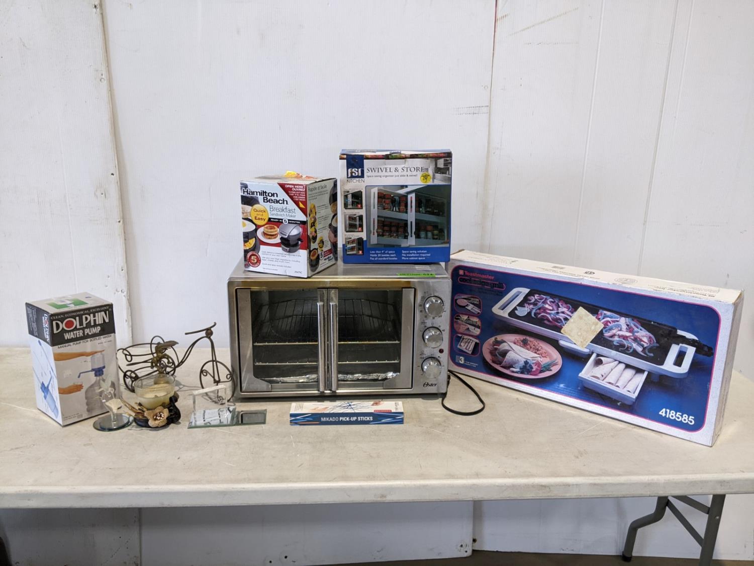 Toastmaster cool-edge grill, shelf organizers, Hamilton Beach breakfast sandwich maker, pick-up sticks, Dolphin water pump, mantle decorations, Oster french-door toaster oven