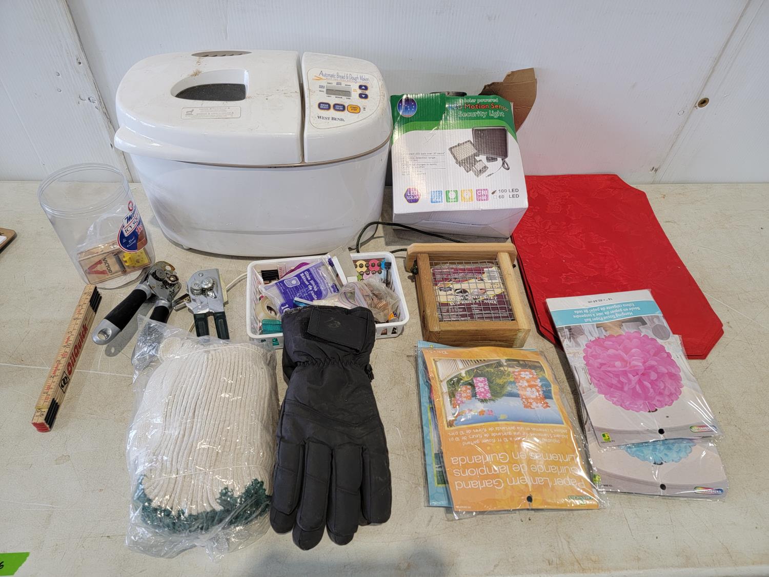 gloves, can openers, mouse traps, bird feeder, bread maker, placemats, LED motion sensor