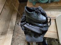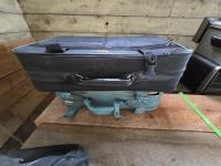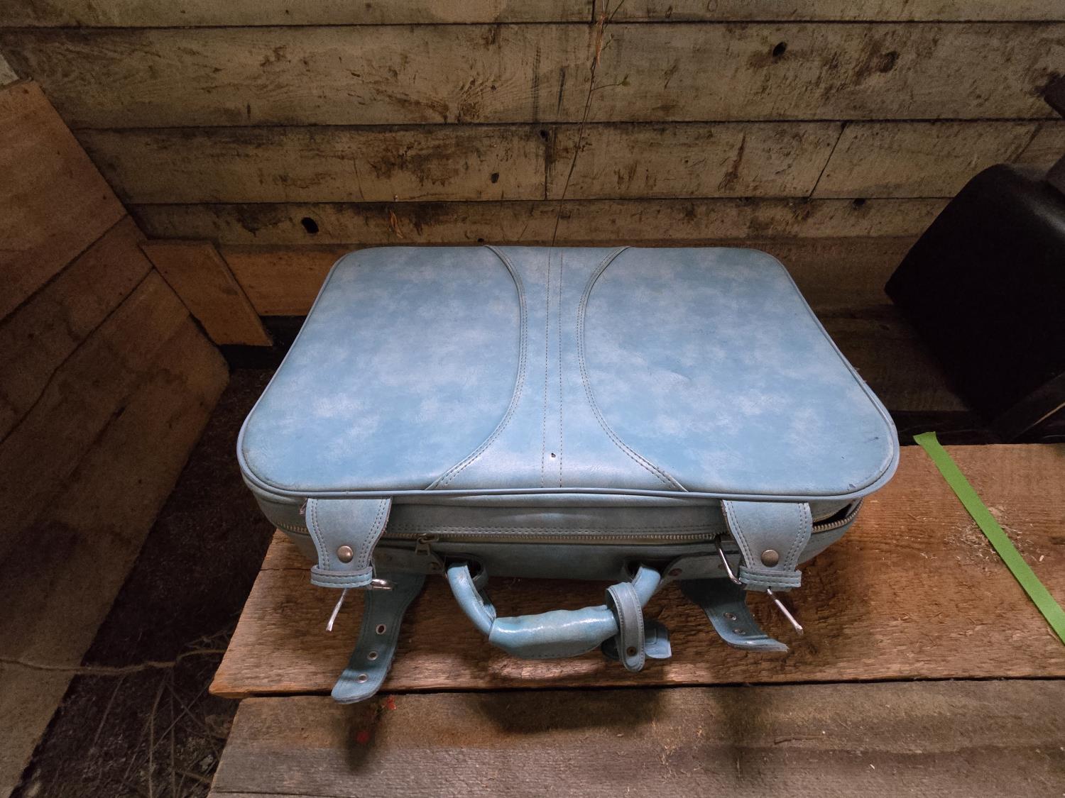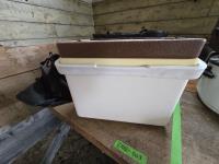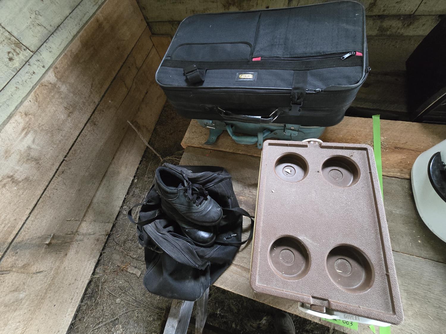 cooler, (2) vintage suitcases, curling shoes w/bag