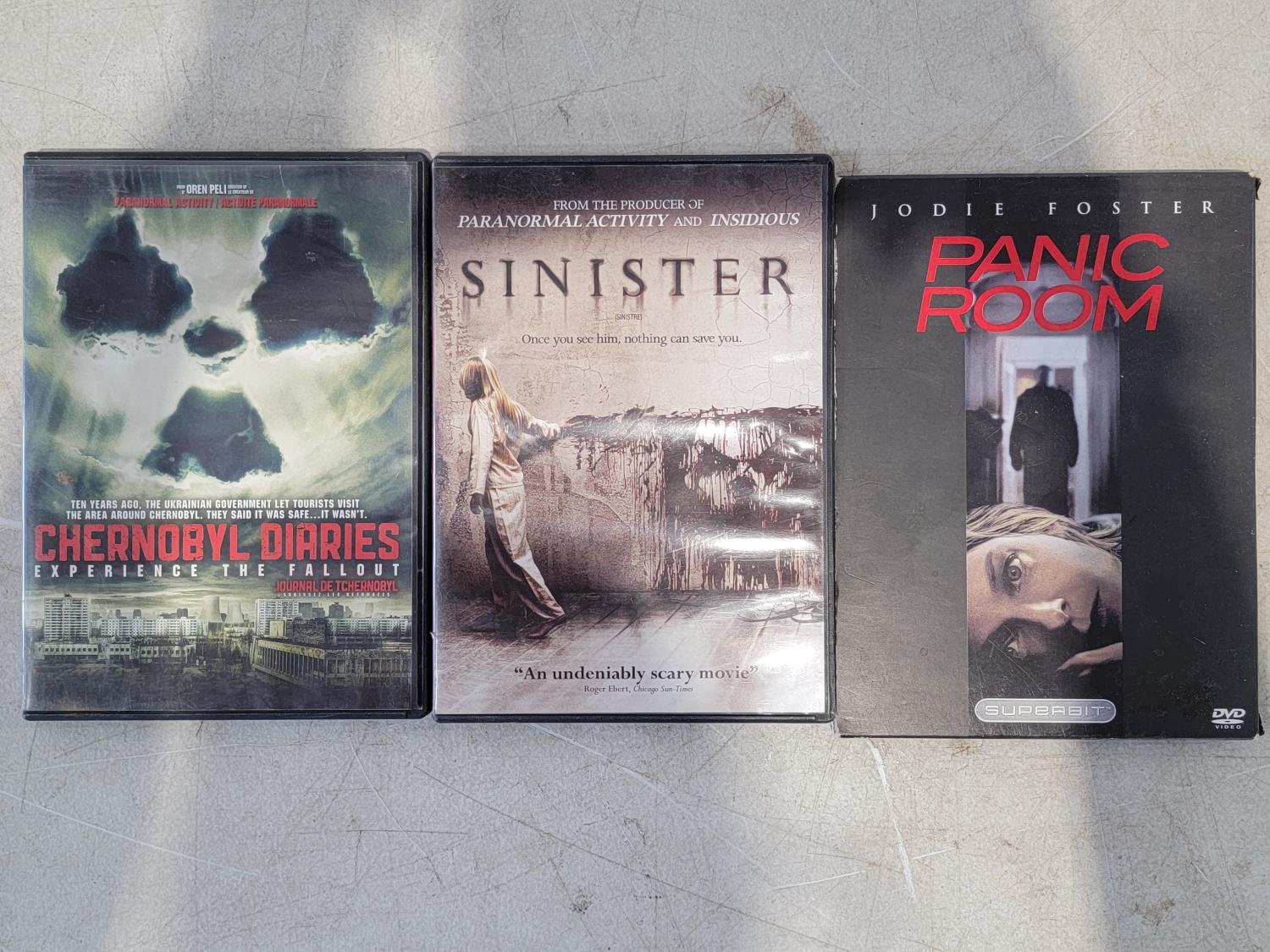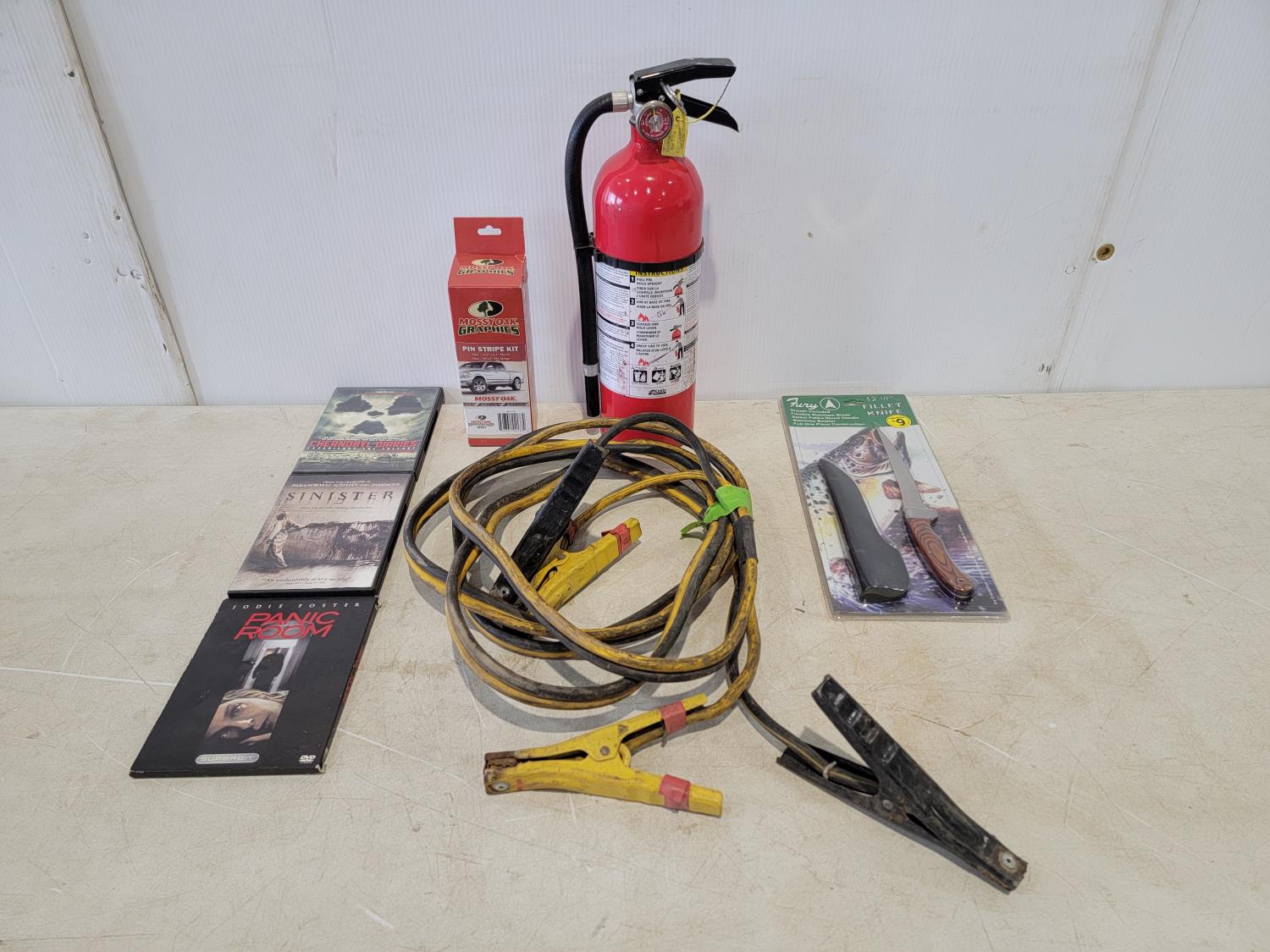 fire extinguisher, jumper cables, (3) movies, fillet knife, camo pin stripe kit