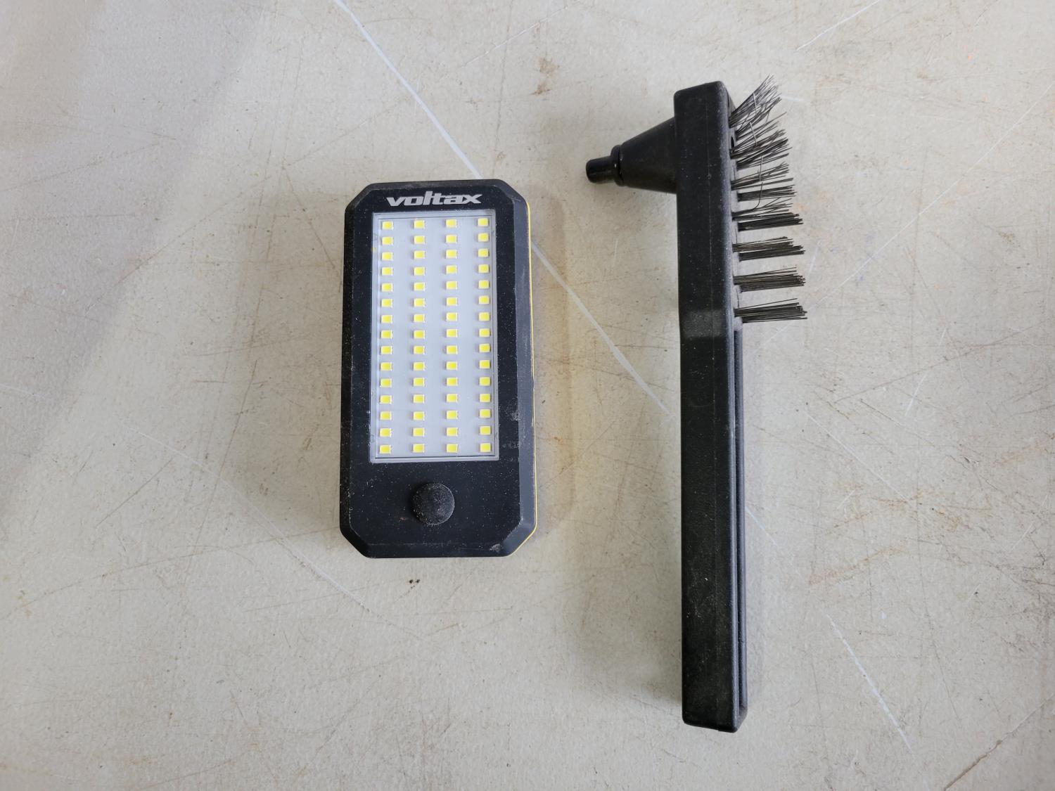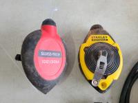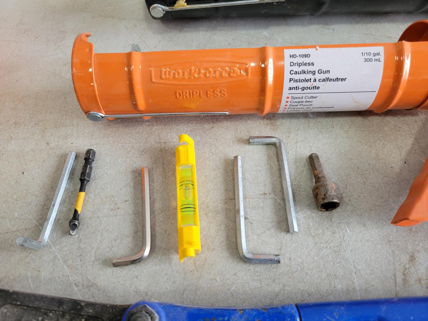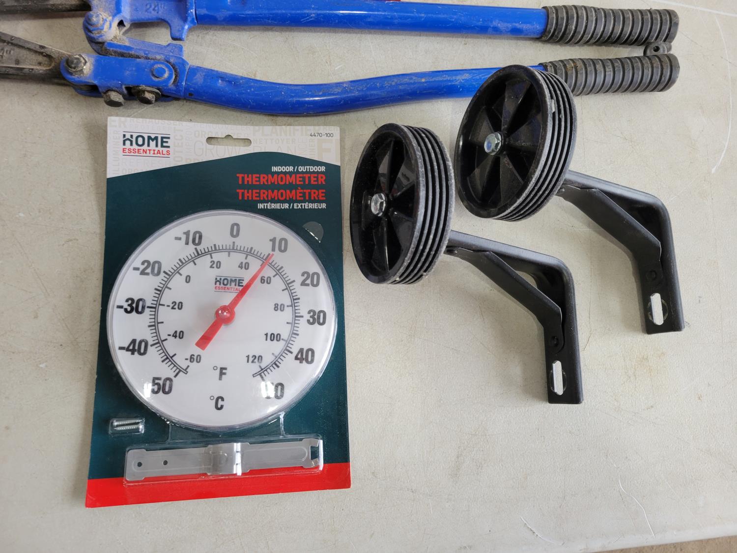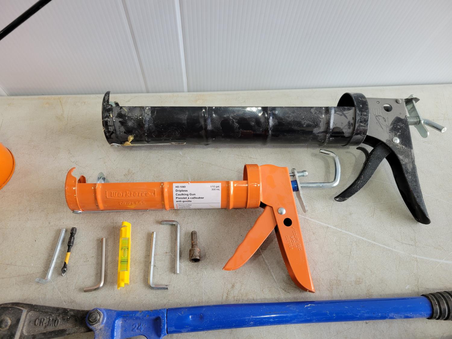 (2) caulking guns, (2) chalk lines, 24 inch bolt cutters, thermometer, power bar, flashlight
