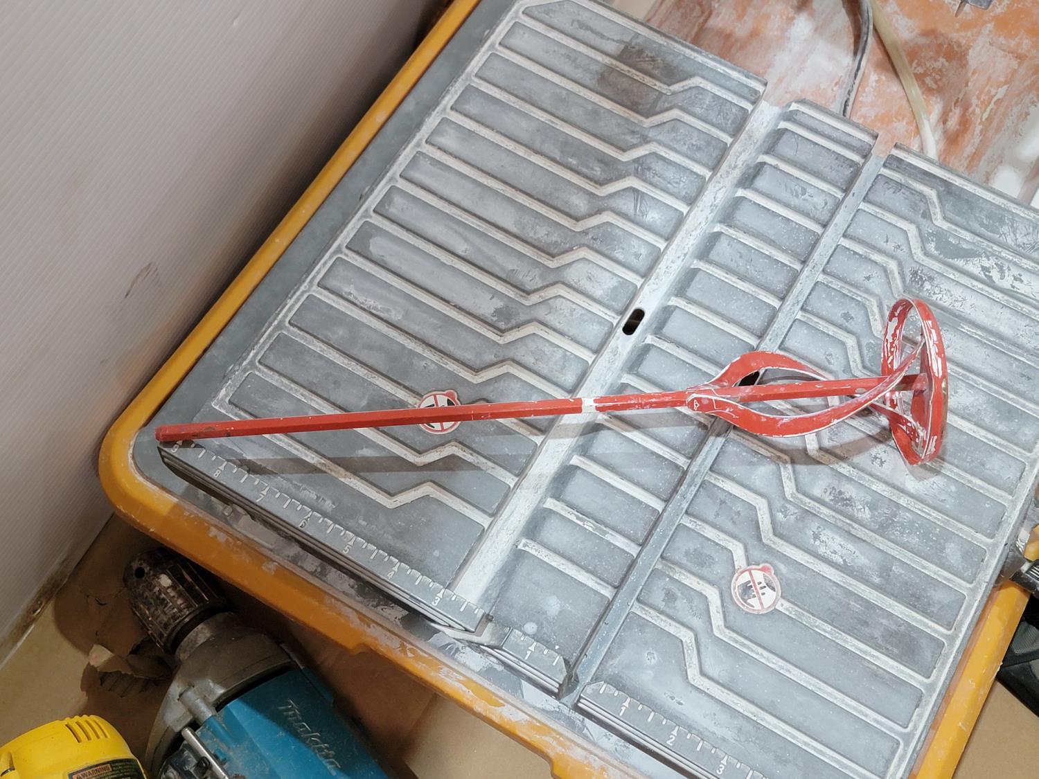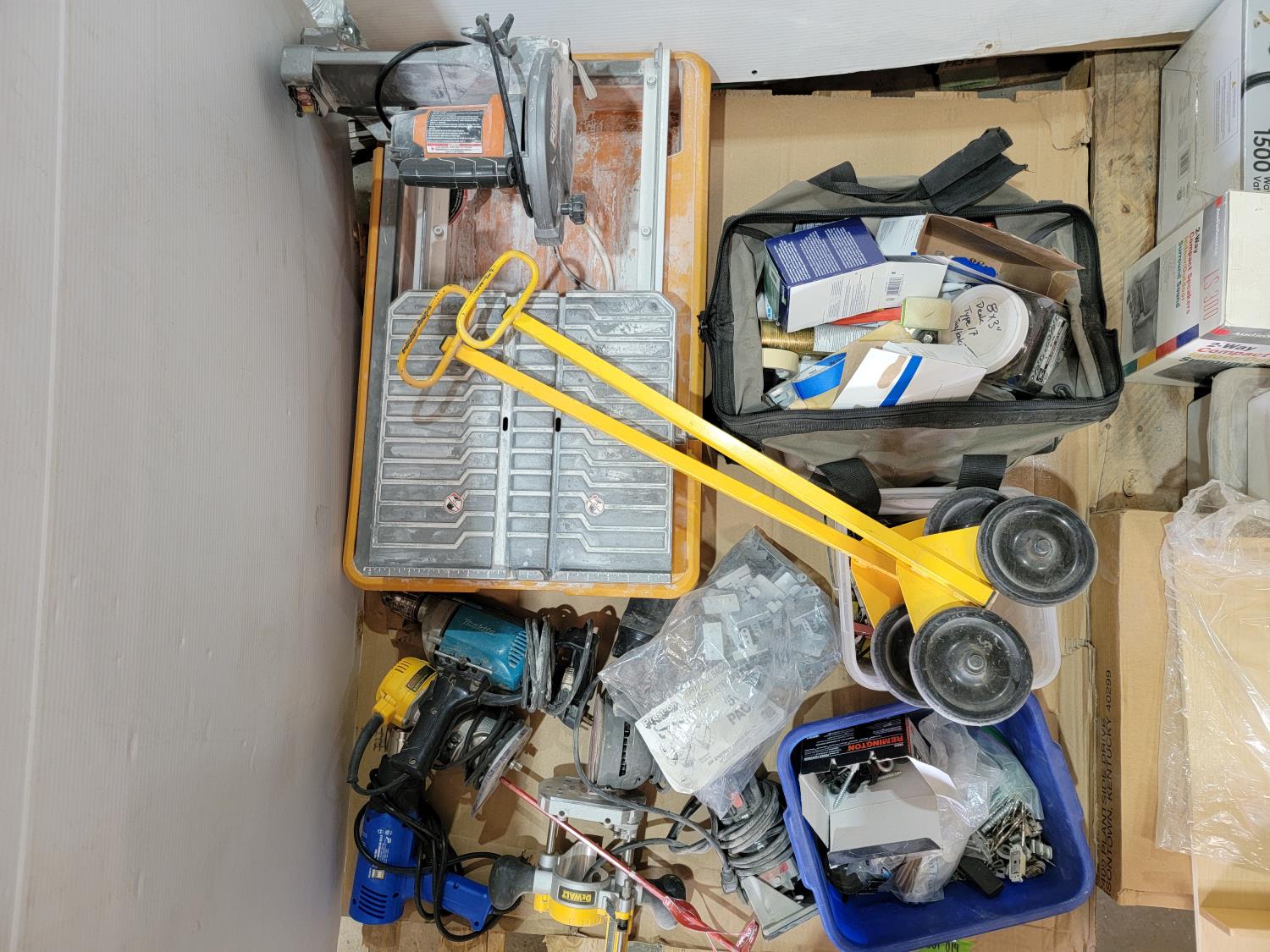 hardware, Ridgid tile saw, mixing bit, laminate trimmer base, orbit sander, Makita drill, Dewalt compact router, Powerfist heat gun