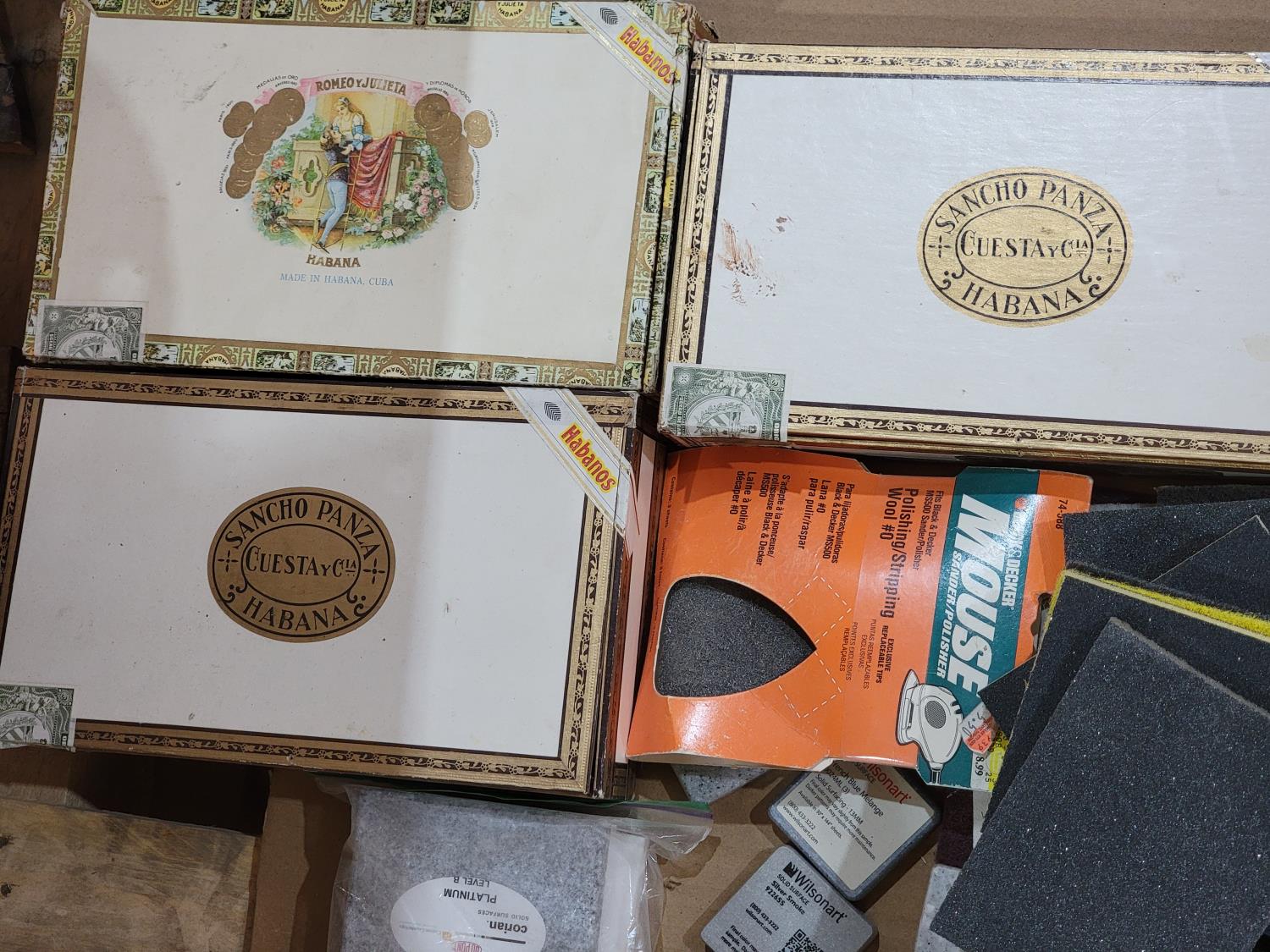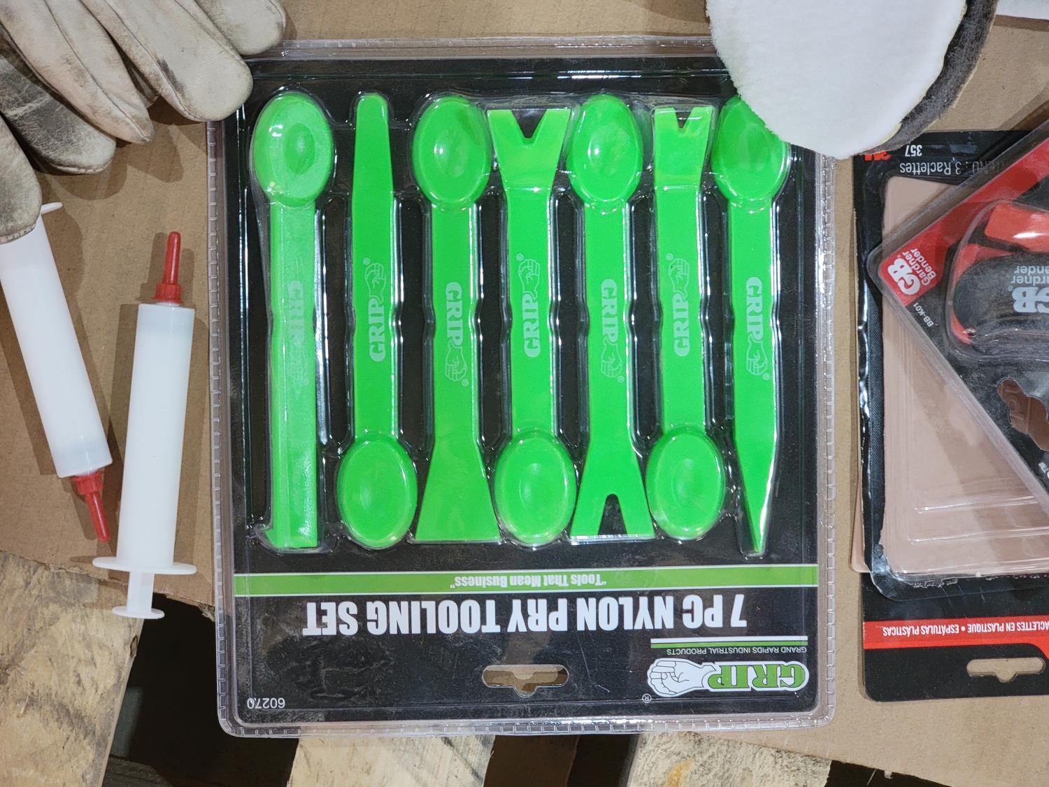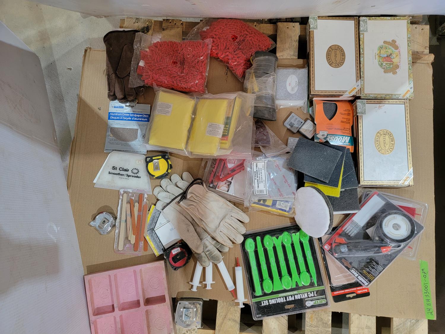 rubber molds, measuring tapes, pry tooling set, garden bender, paint supplies, sand paper