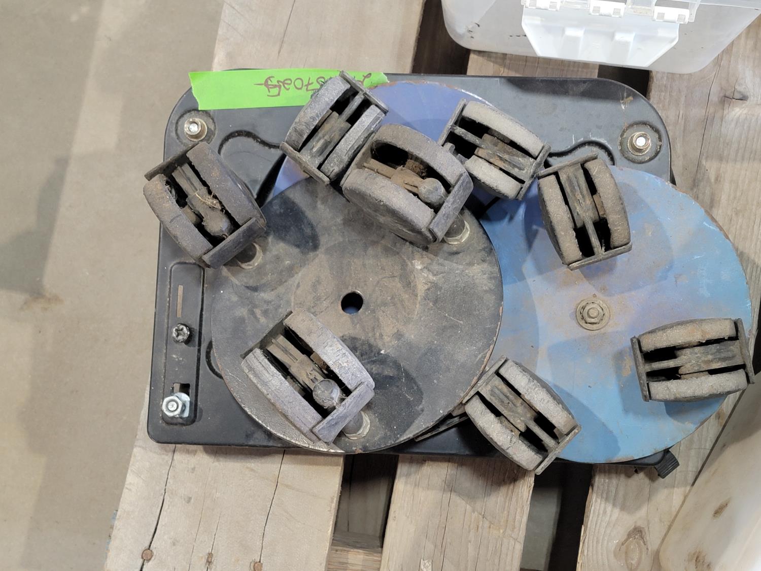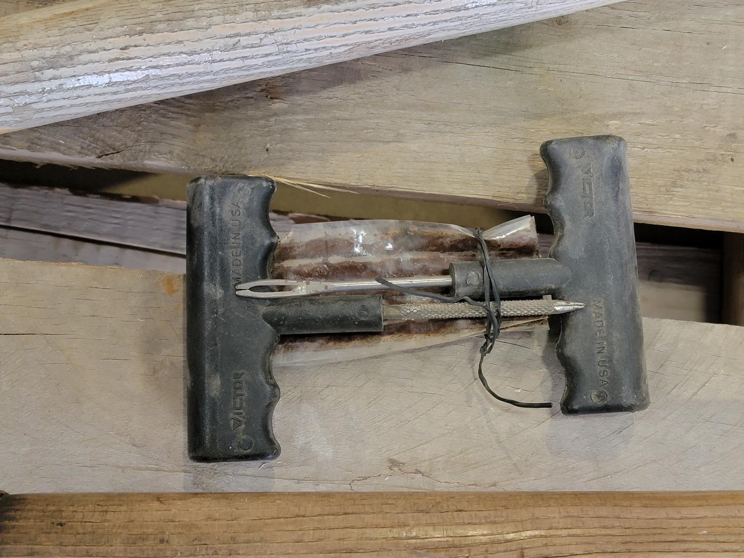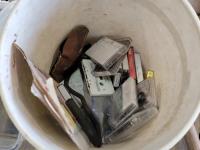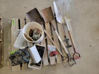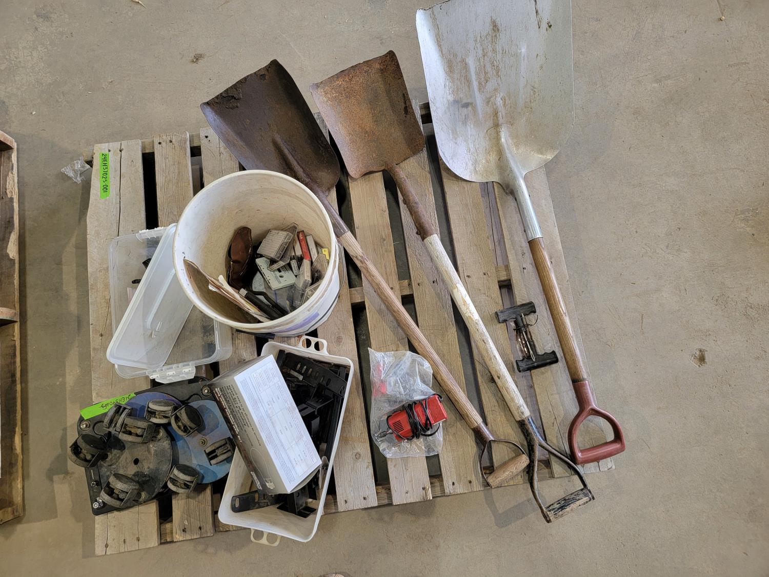 Snowmobile dollies, (3) shovels, chainsaw sharpener, cassette tapes