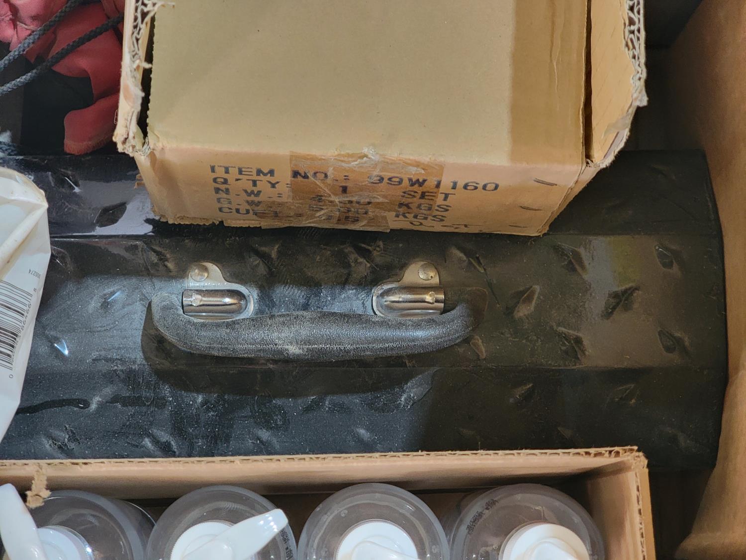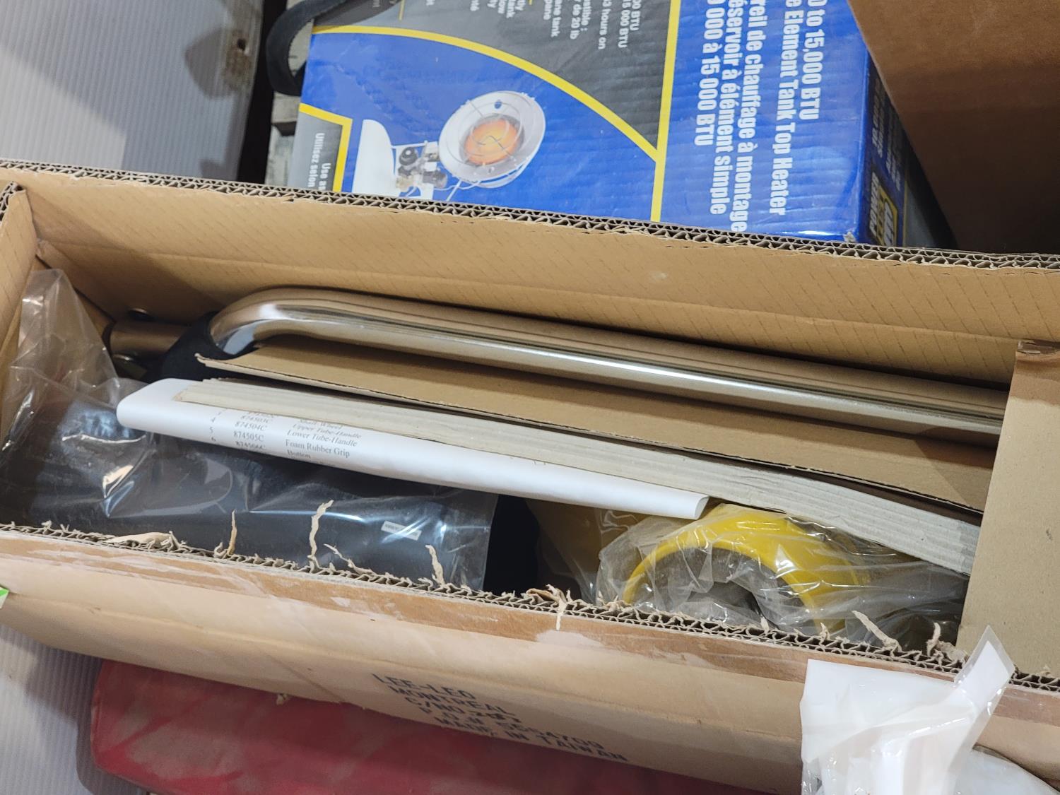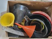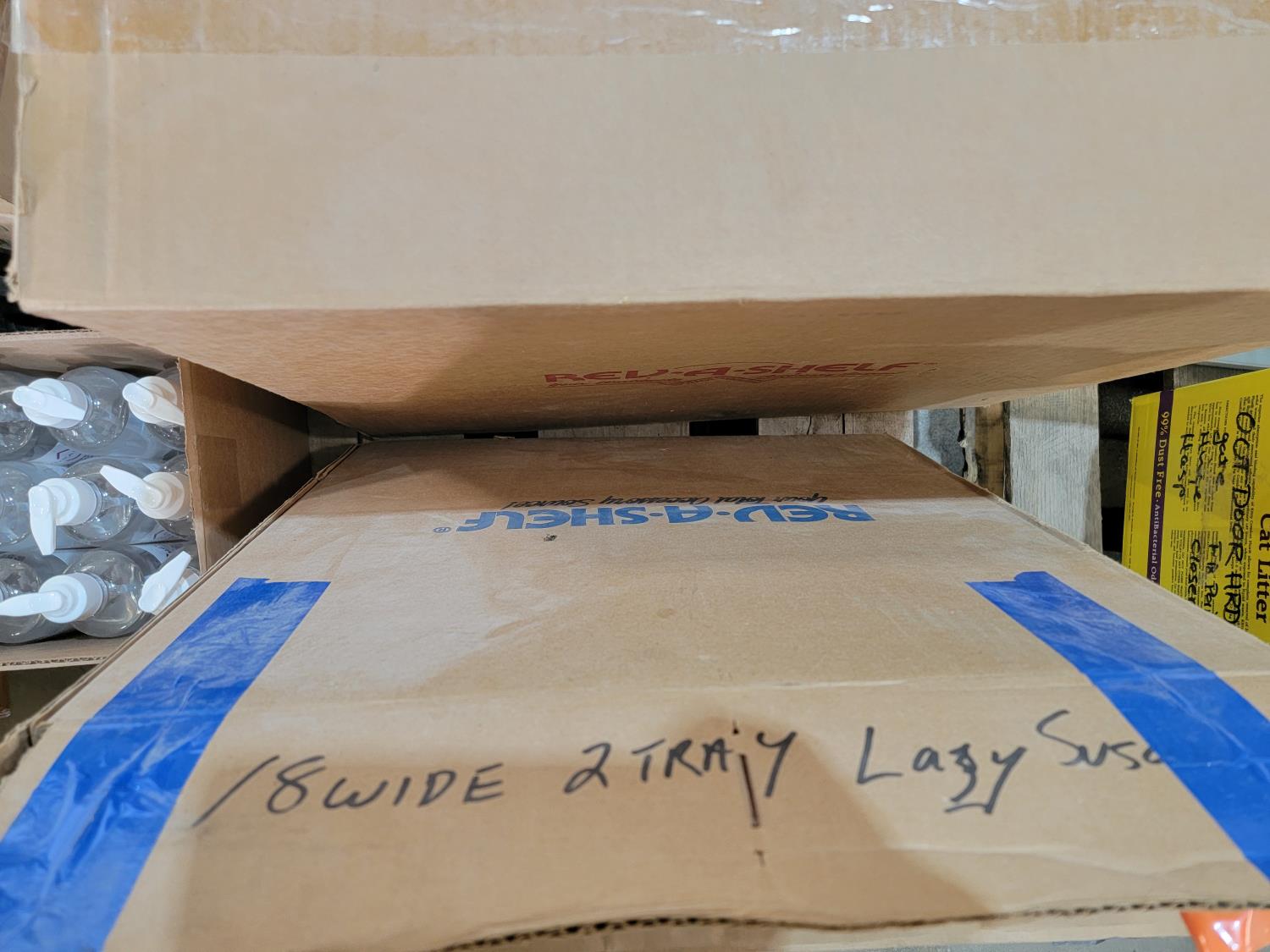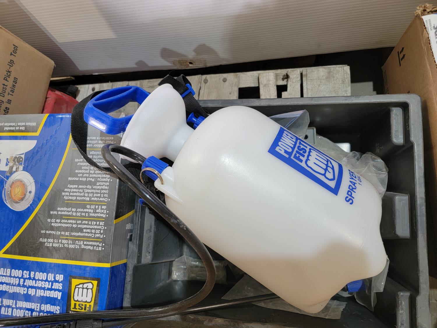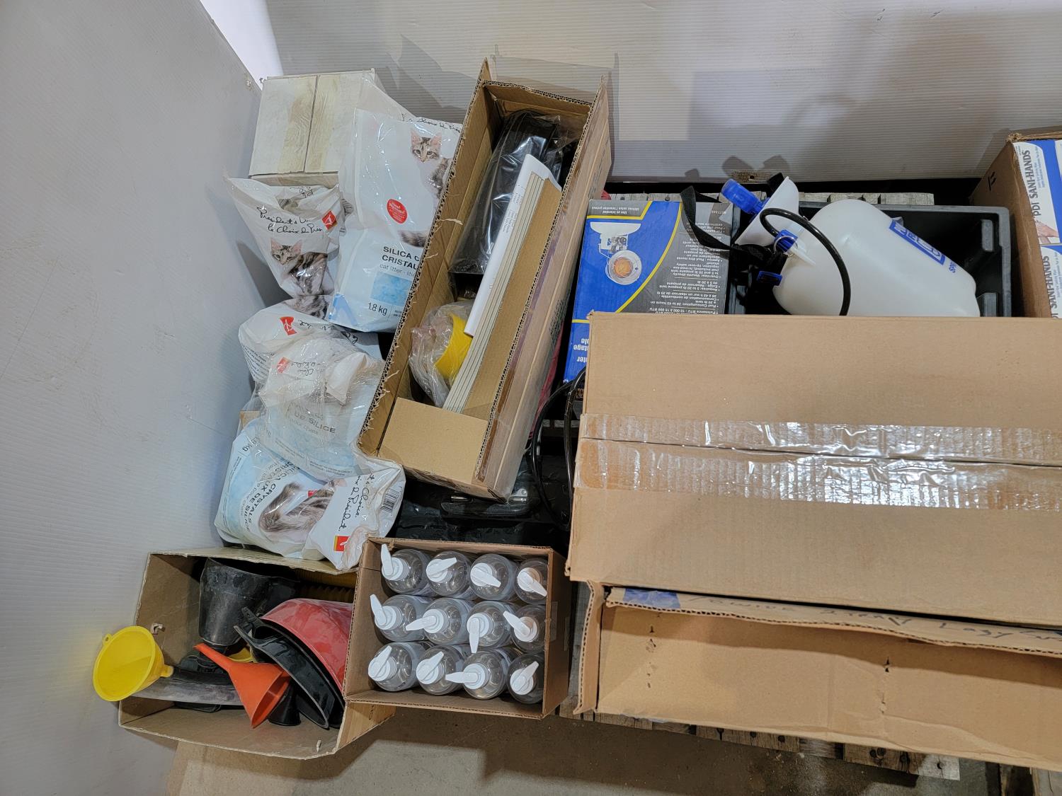 lazy susan, waste bin, powerfist hand pump sprayer, single element tank top heater, silica crystal cat litter, funnels, hand sanitizer,