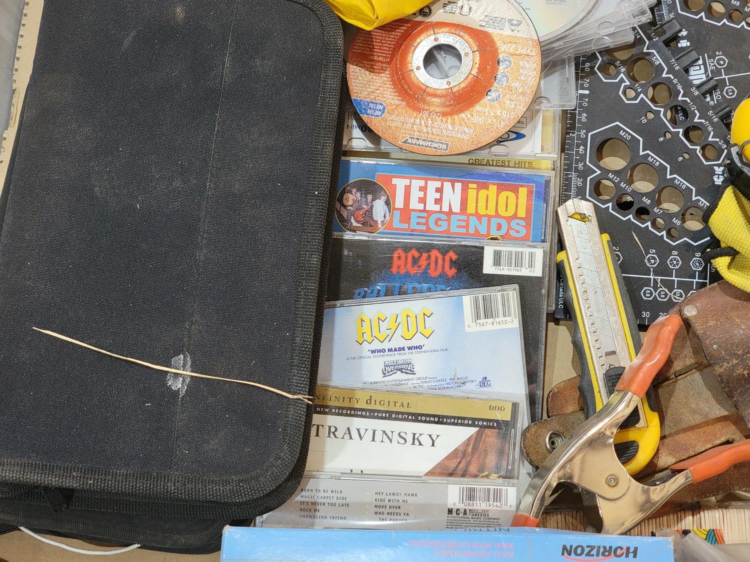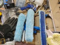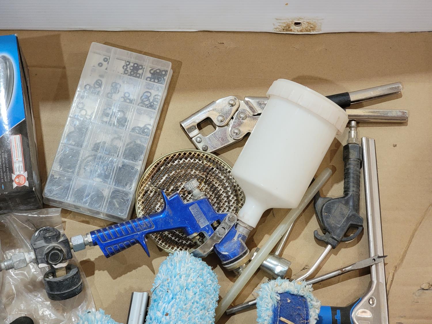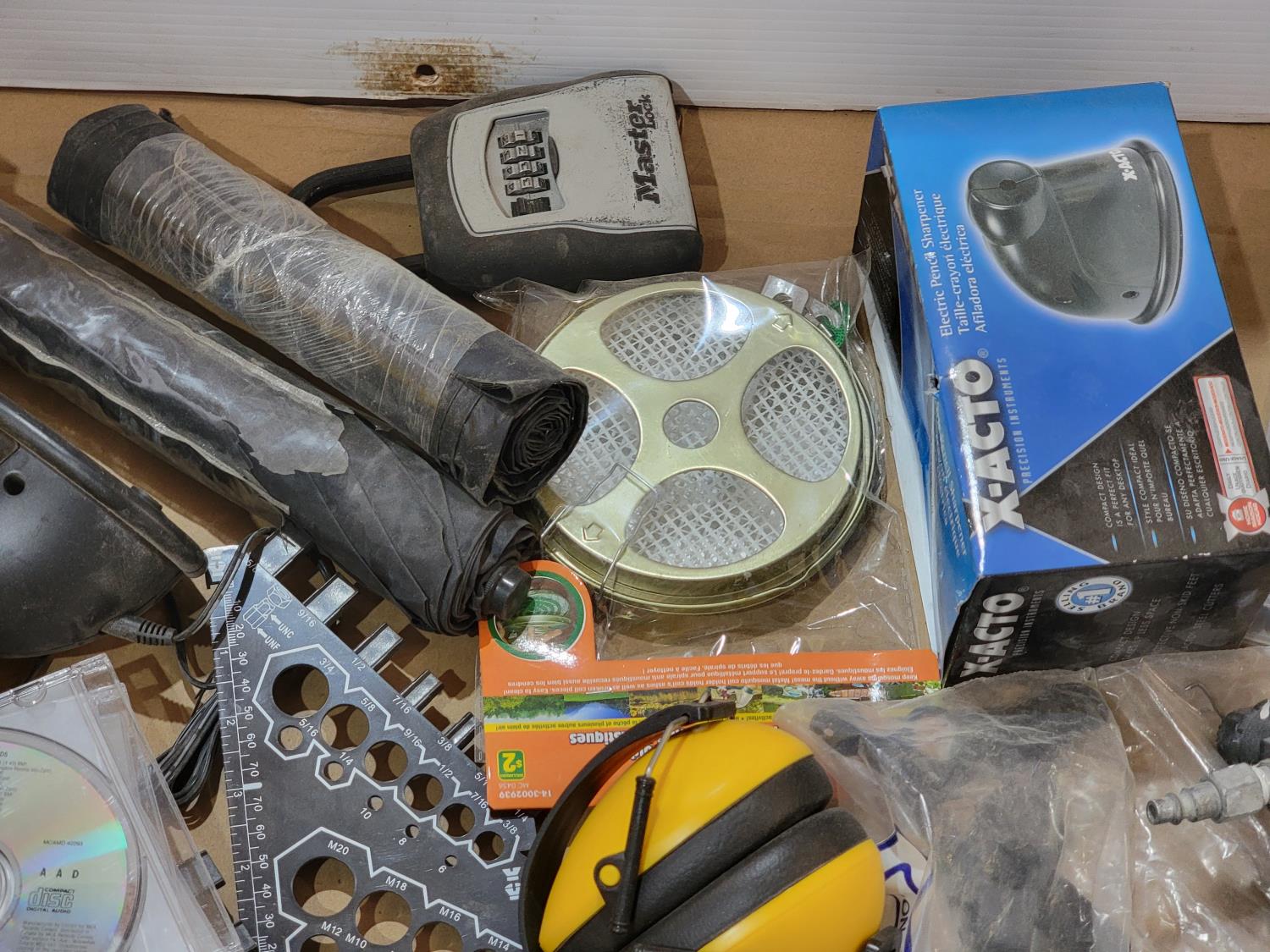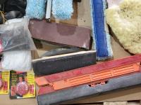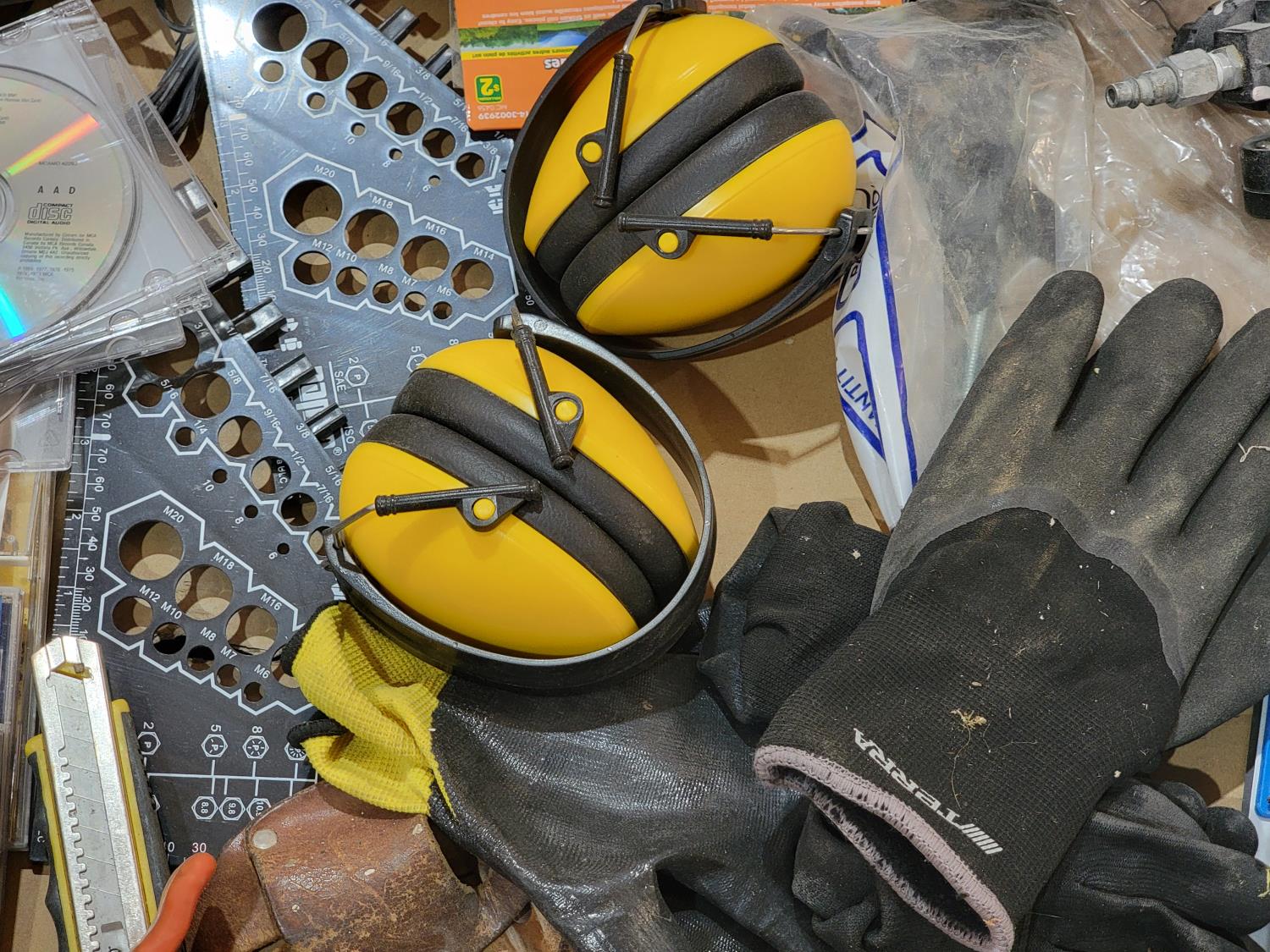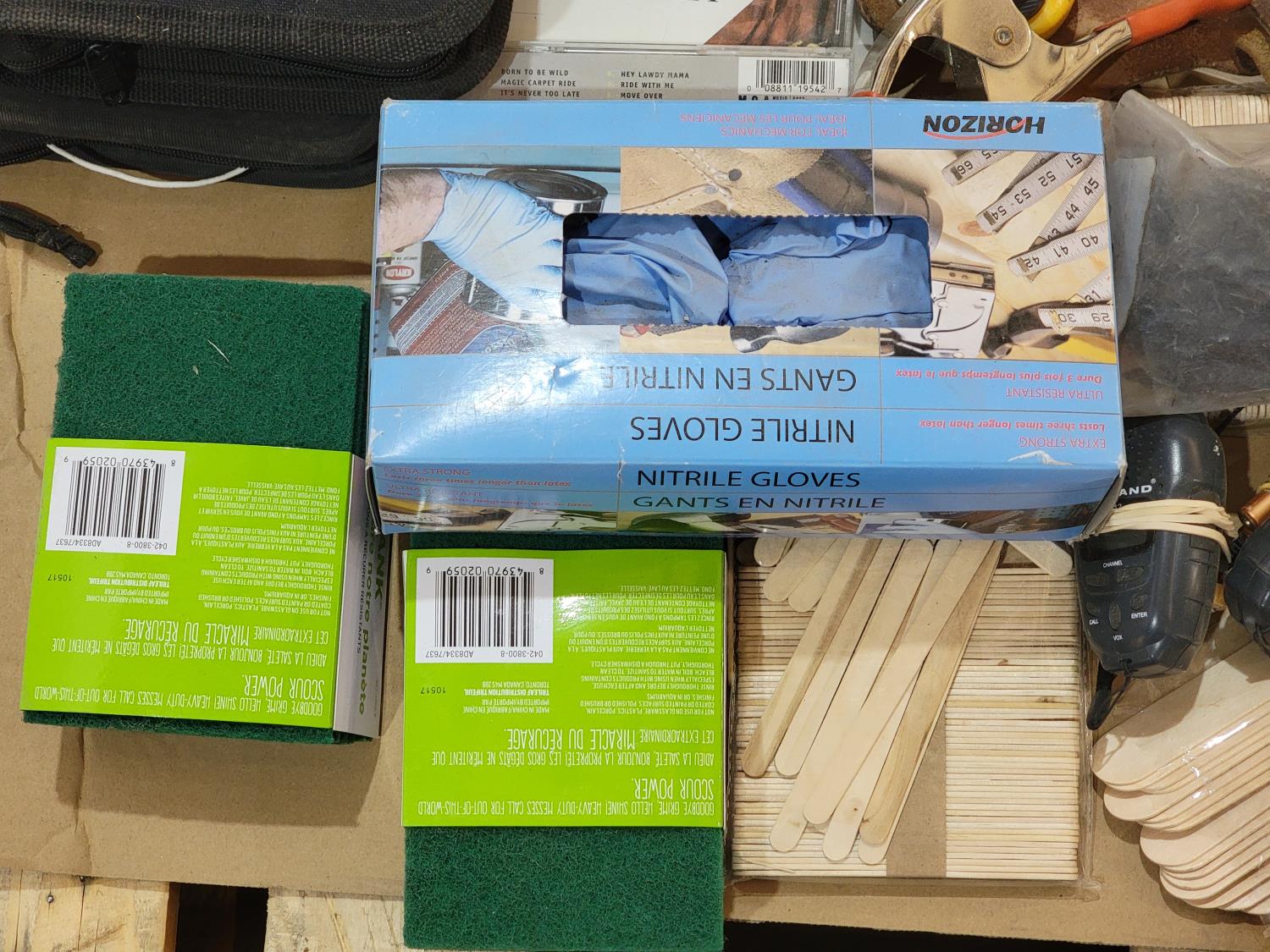 ear protection, back brace, utility knife, gloves, pad lock, popsicle sticks, scrub pads, hazard sign, sand paper, squeegees, airbrush
