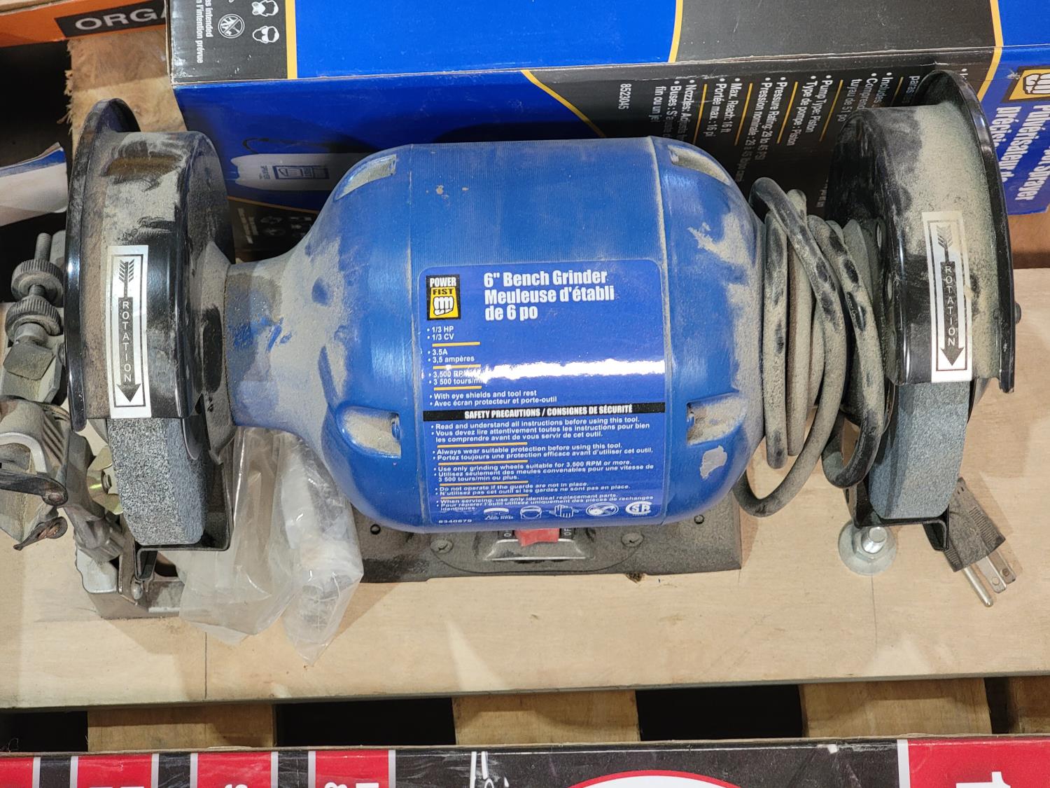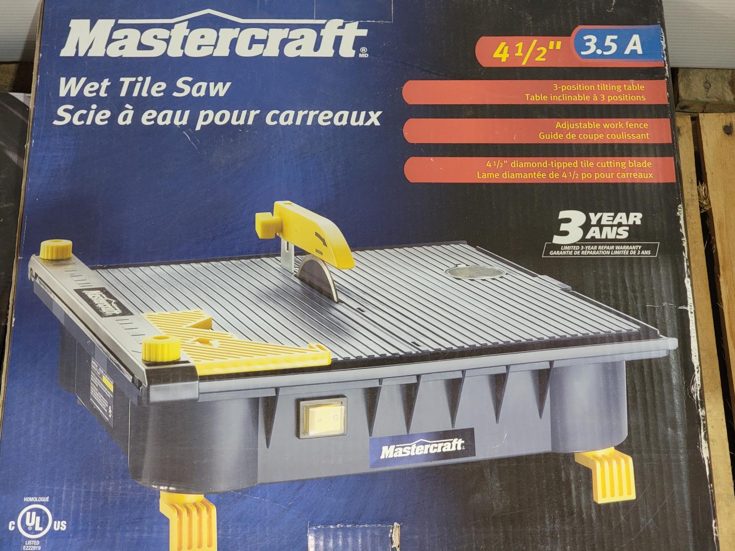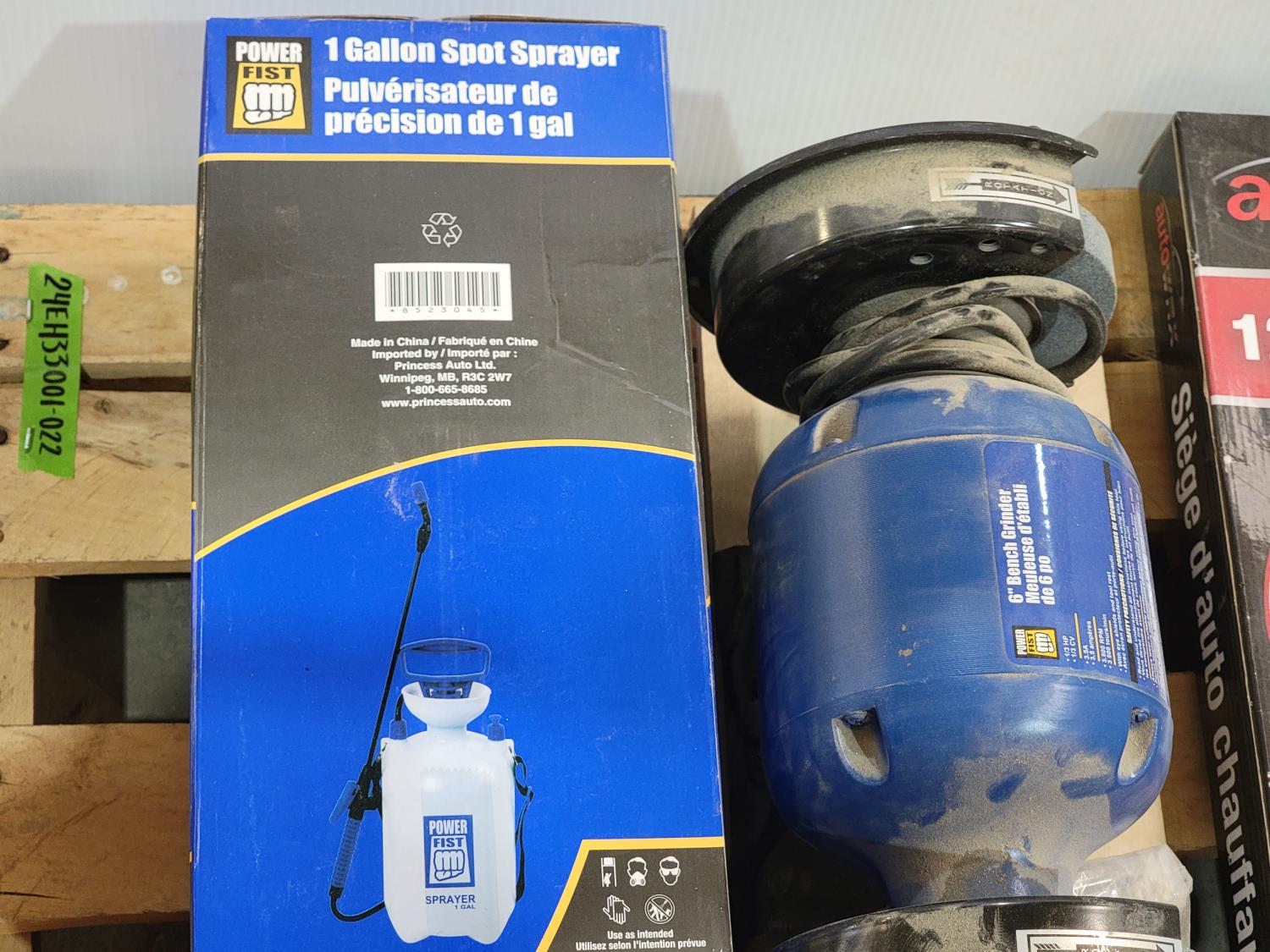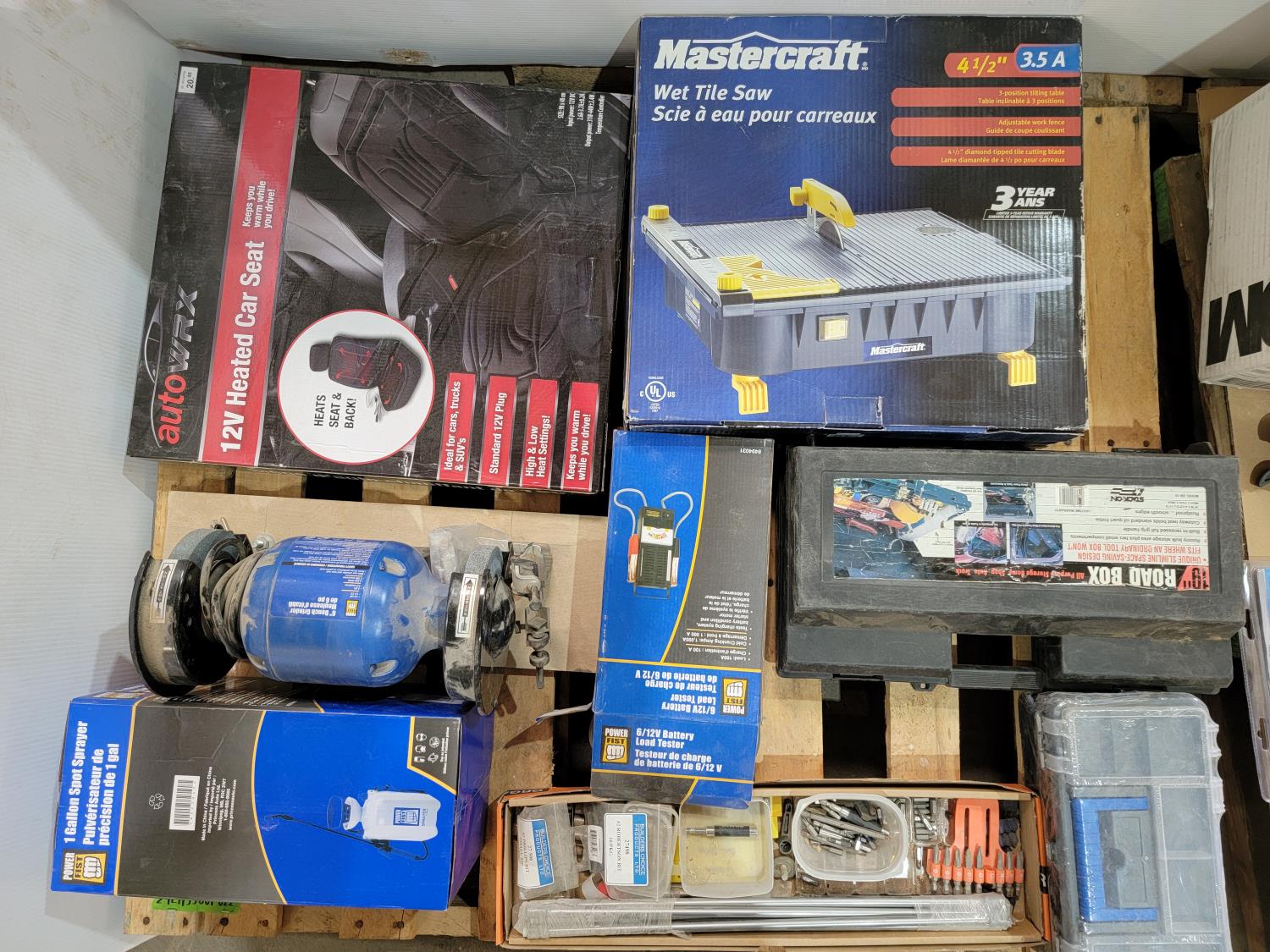 12v heated car seat, Mastercraft wet tile saw, Powerfist 1-gallon spot sprayer, Powerfist 6 inch bench grinder, battery load tester, screwdriver bits, 12-1/2 inch plastic toolbox