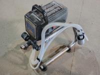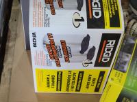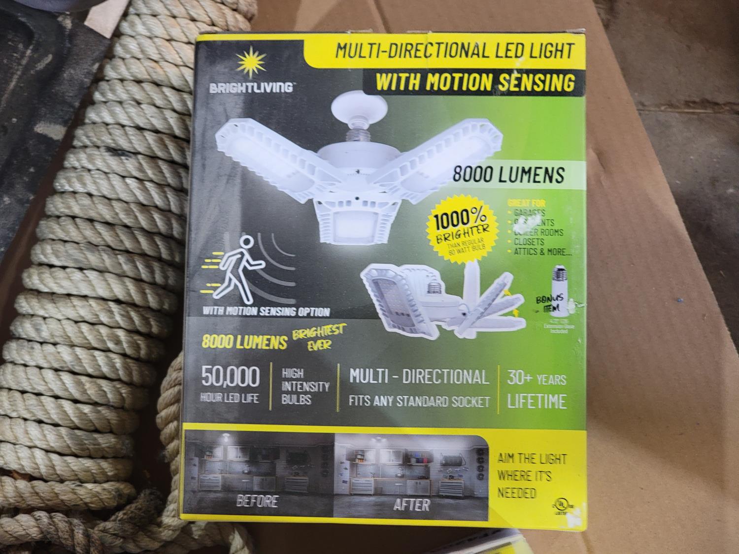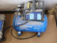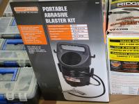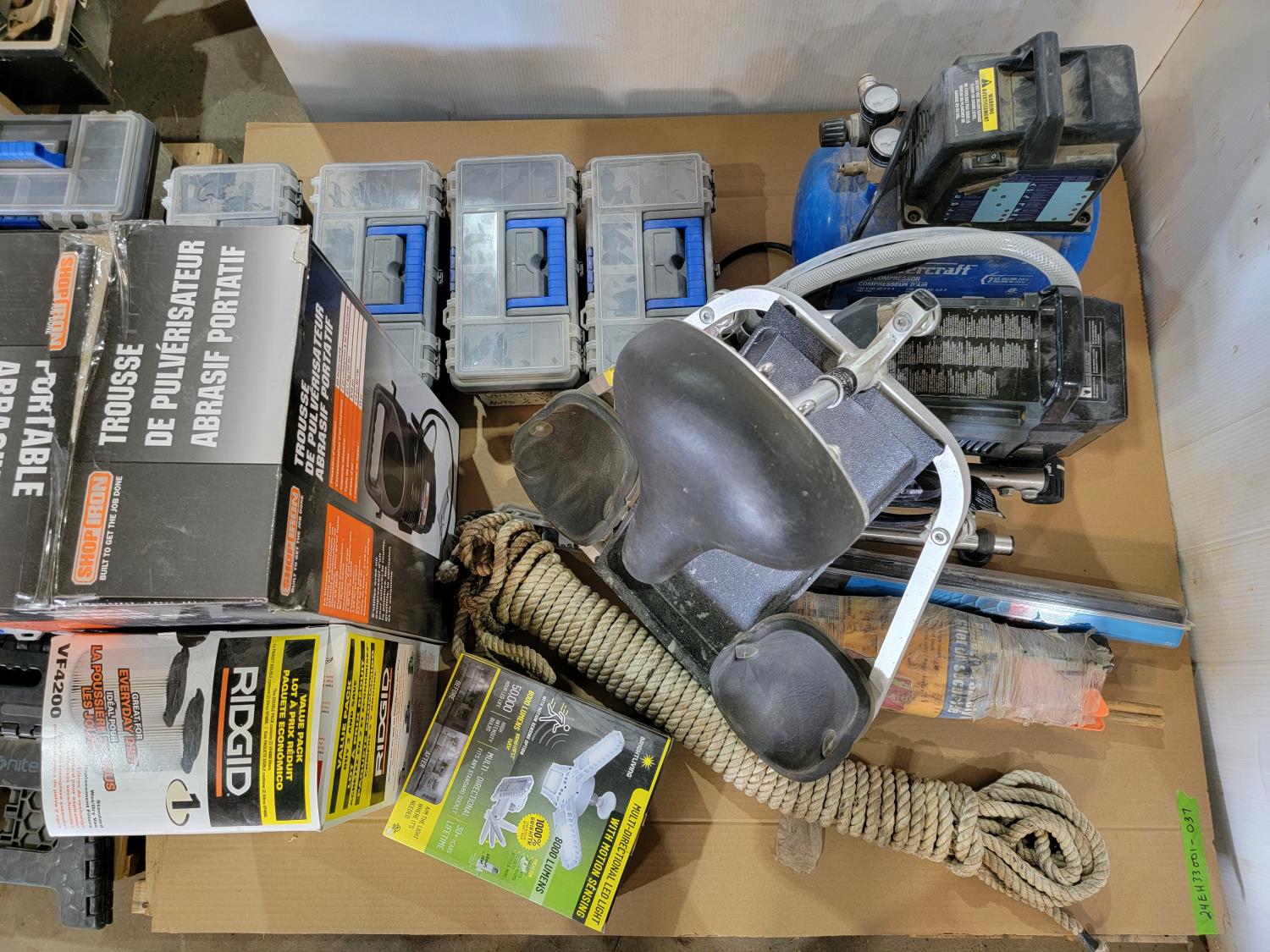 multi-directional LED light, wet/dry vac replacement filters, portable abrasive blaster kit, rope, airless piston paint sprayer, mastercraft air compressor, mechanics chair