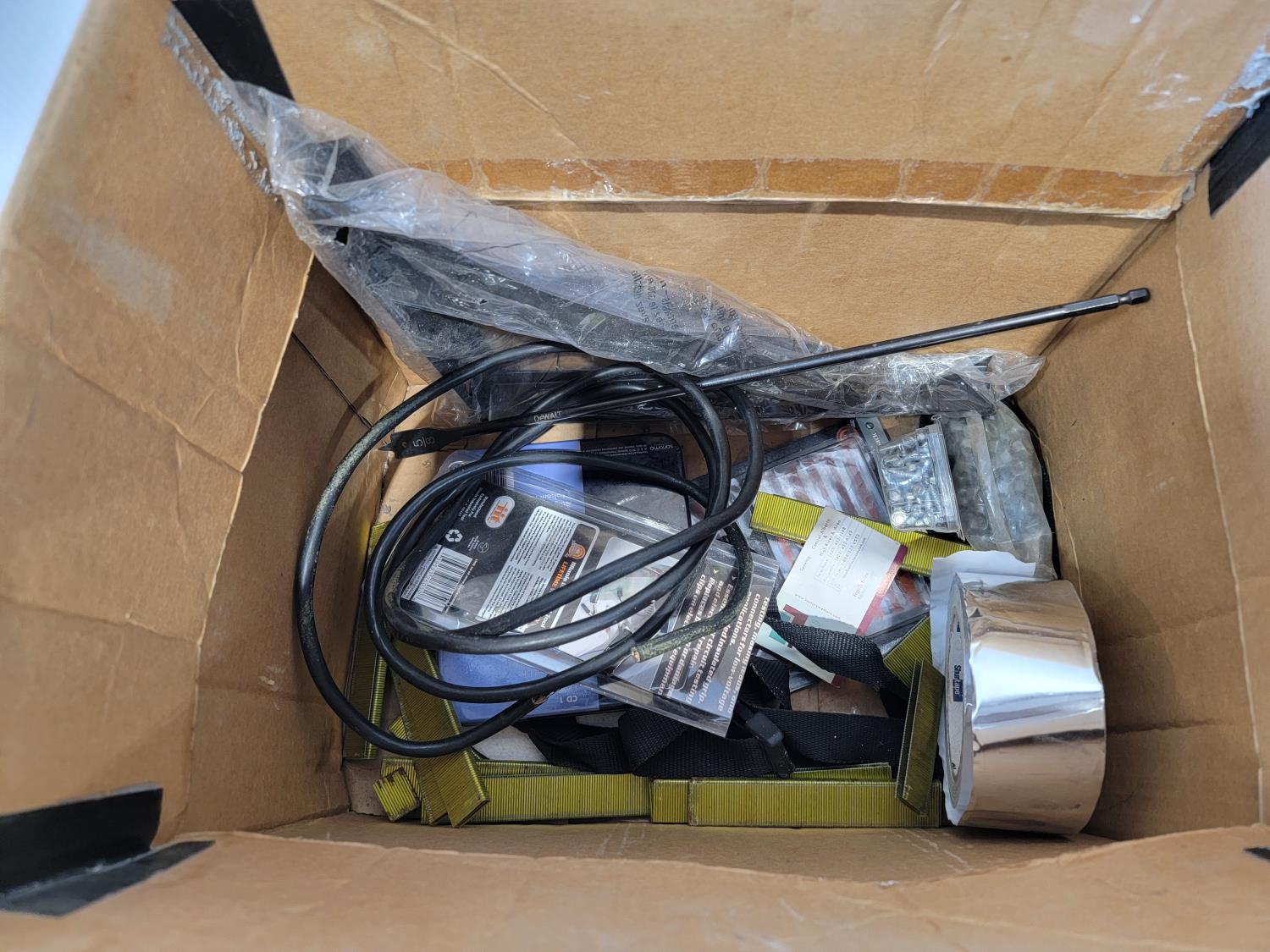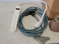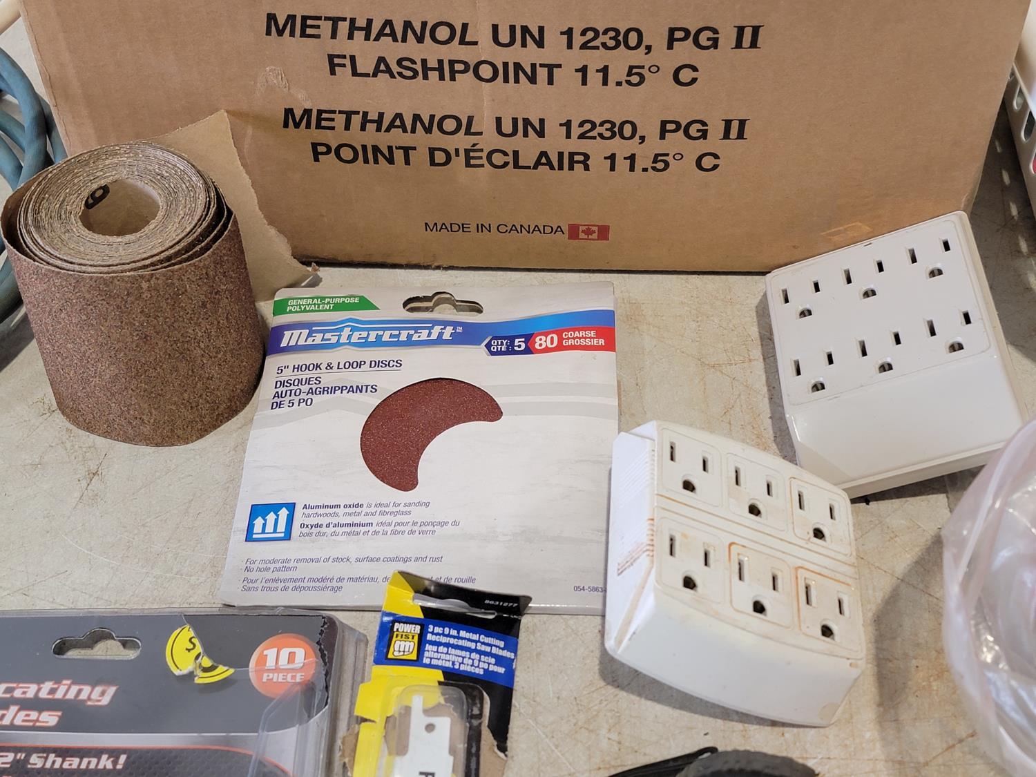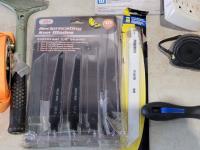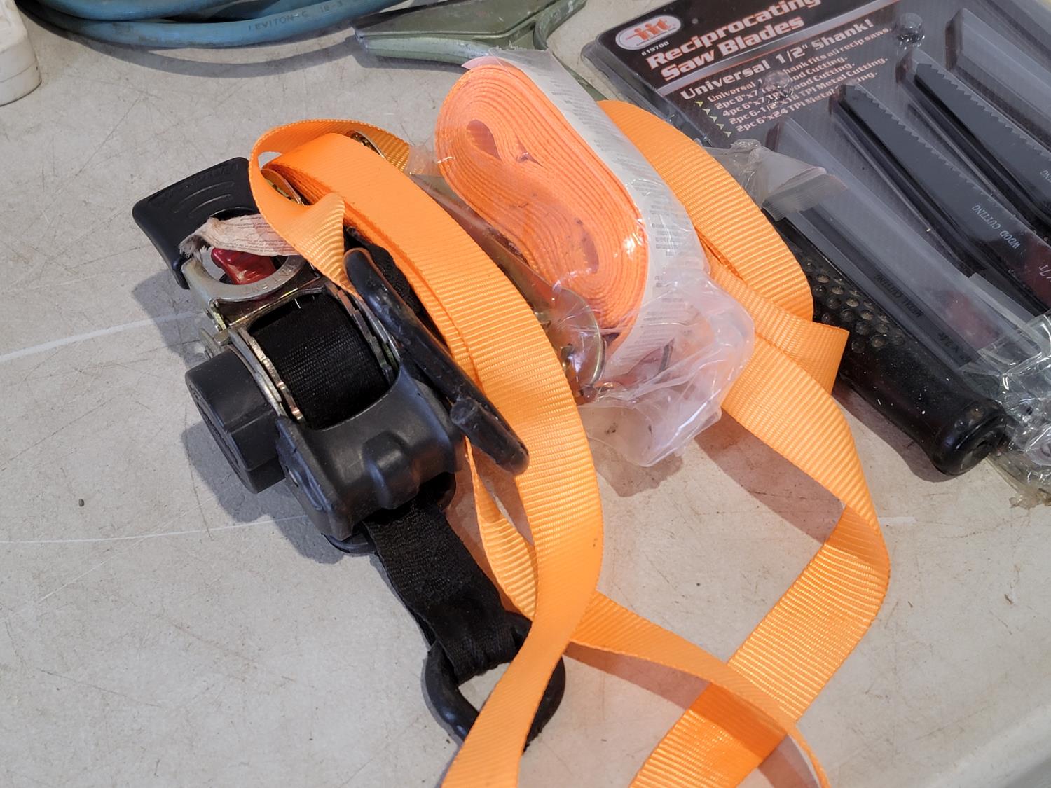 extension cords, sand paper, vehicle lights, reciprocating saw blades, ratchet straps, file, staple