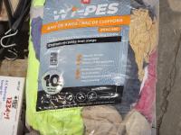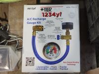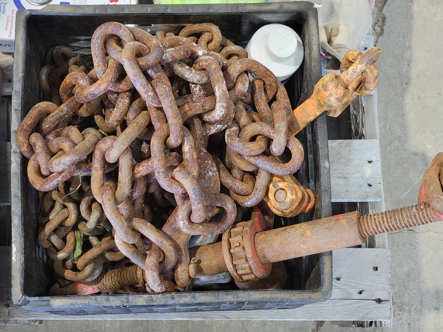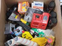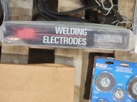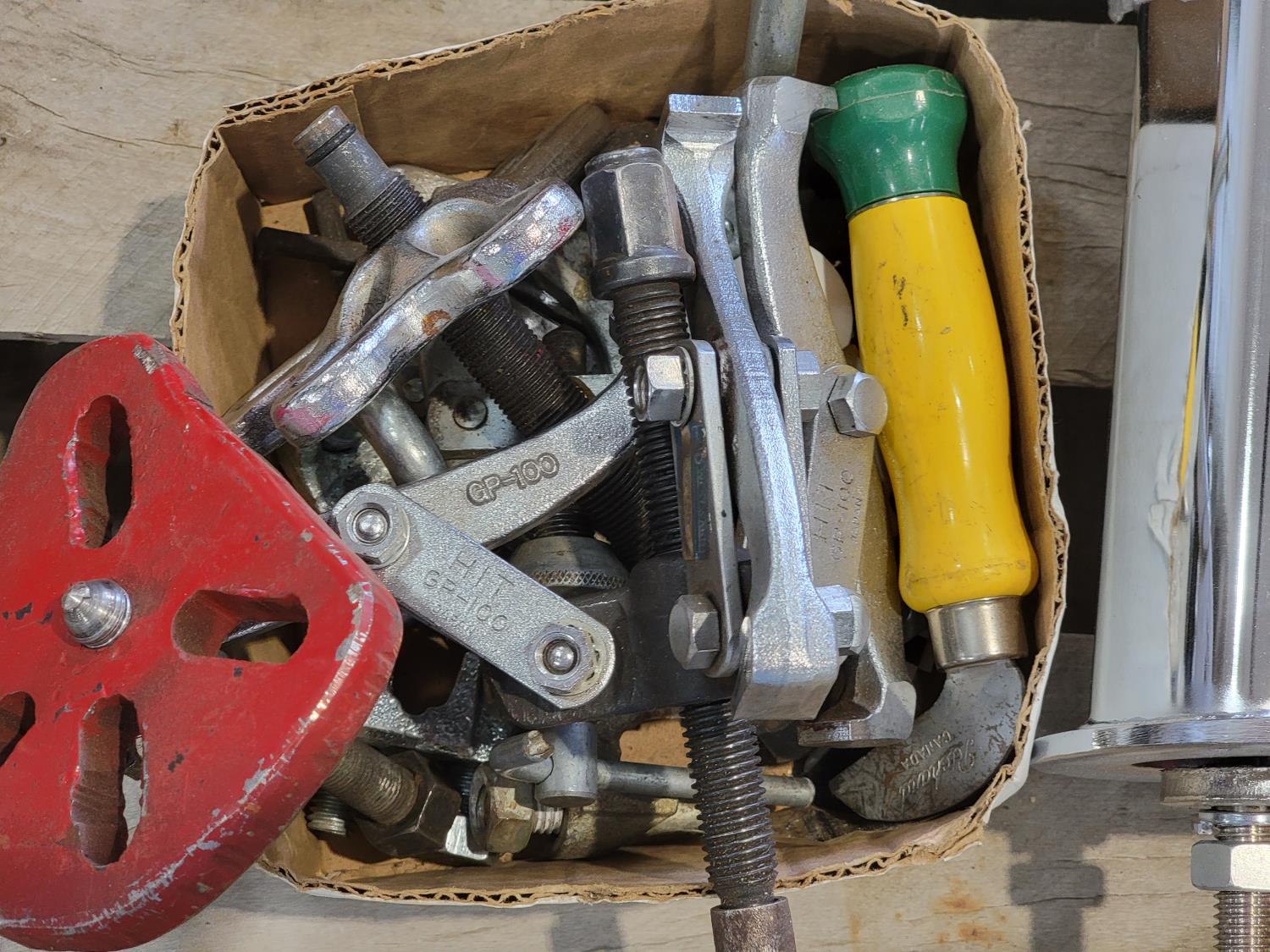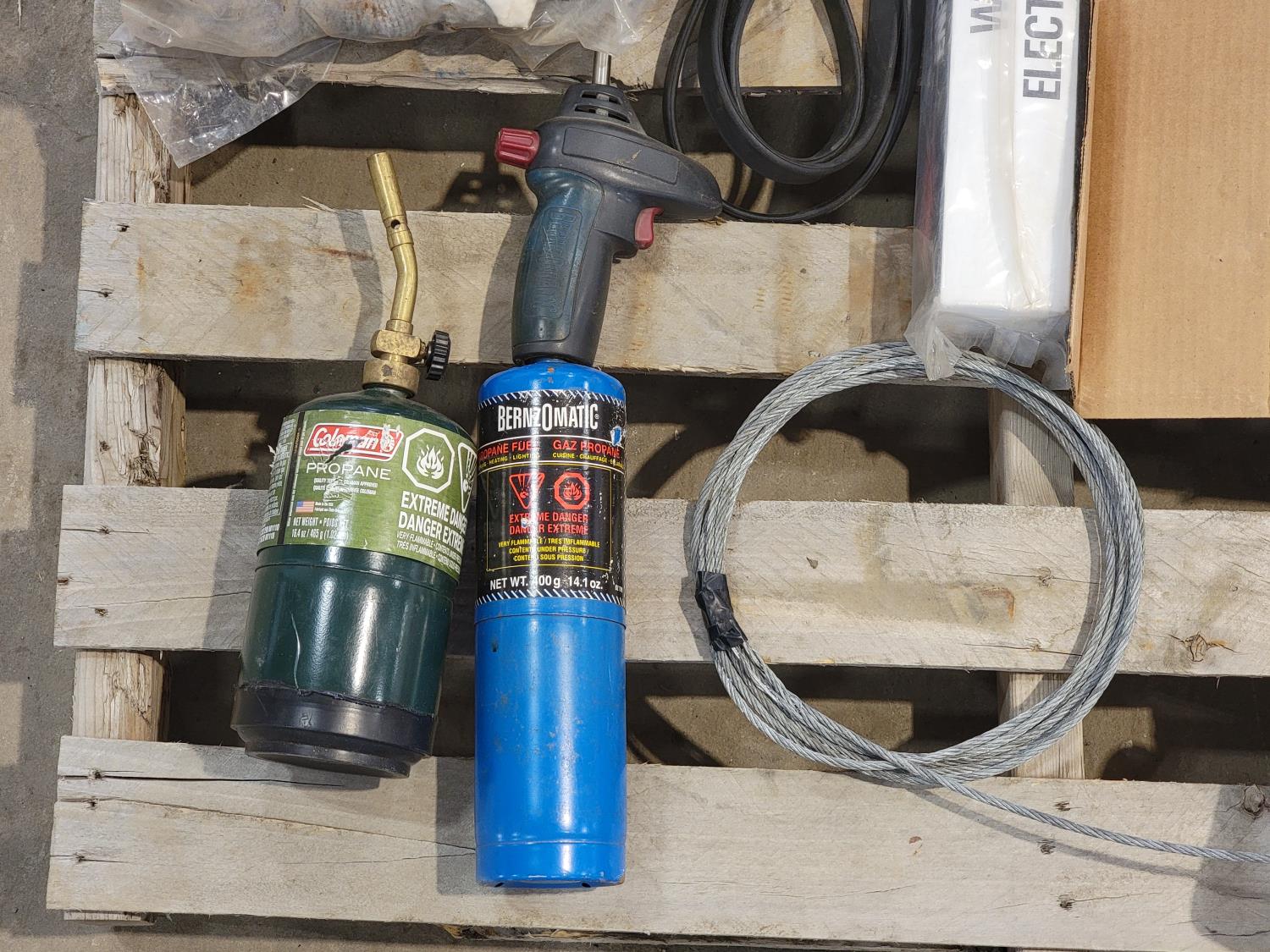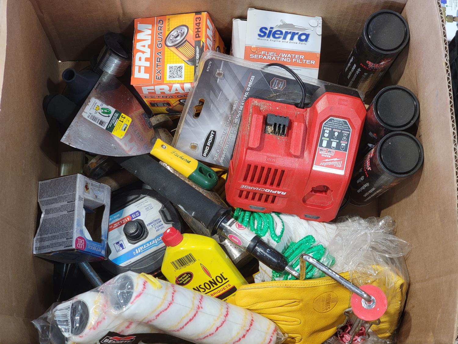 paint supplies, grease, fuel/water separating filter, gloves, boomer, chain, rags, propane torches, metal cable, pullers, welding electrodes, brake pads, A/C recharge gauge kit