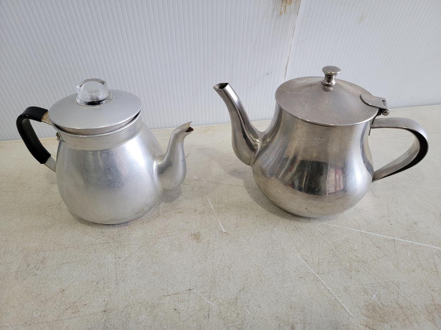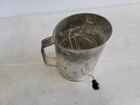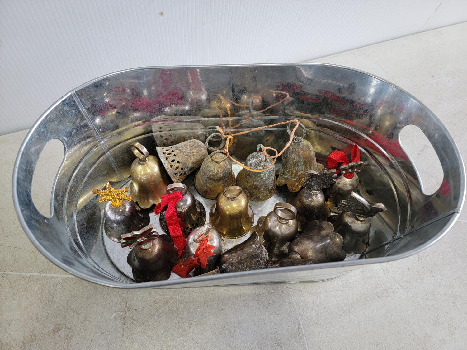 Brass bells, silver teapots, flour sifter, egg beater, potato masher