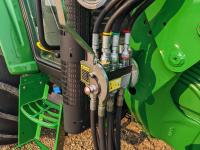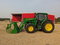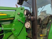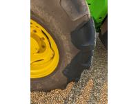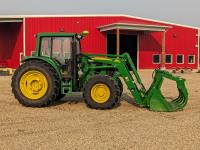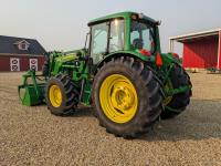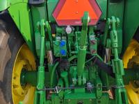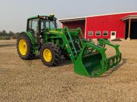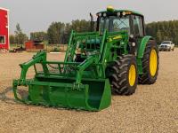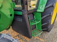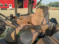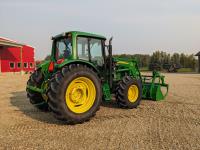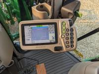 John Deere 673 loader, 84 inch bucket, grapple, mid mount hydraulic connection, John Deere 4.5 4 cylinder 115 HP, diesel engine, 95 PTO HP, IVT transmission, cab, left hand reverser, rear differential lock, joystick, A/C, radio, buddy seat, Star Fire 3000 GPS receiver & display, front axle suspension, 3 point hitch, 3 point hitch exterior control, 3 rear hydraulic outlets, rear wheel weights, 480/70R24 front tires, 520/70R38 rear tires