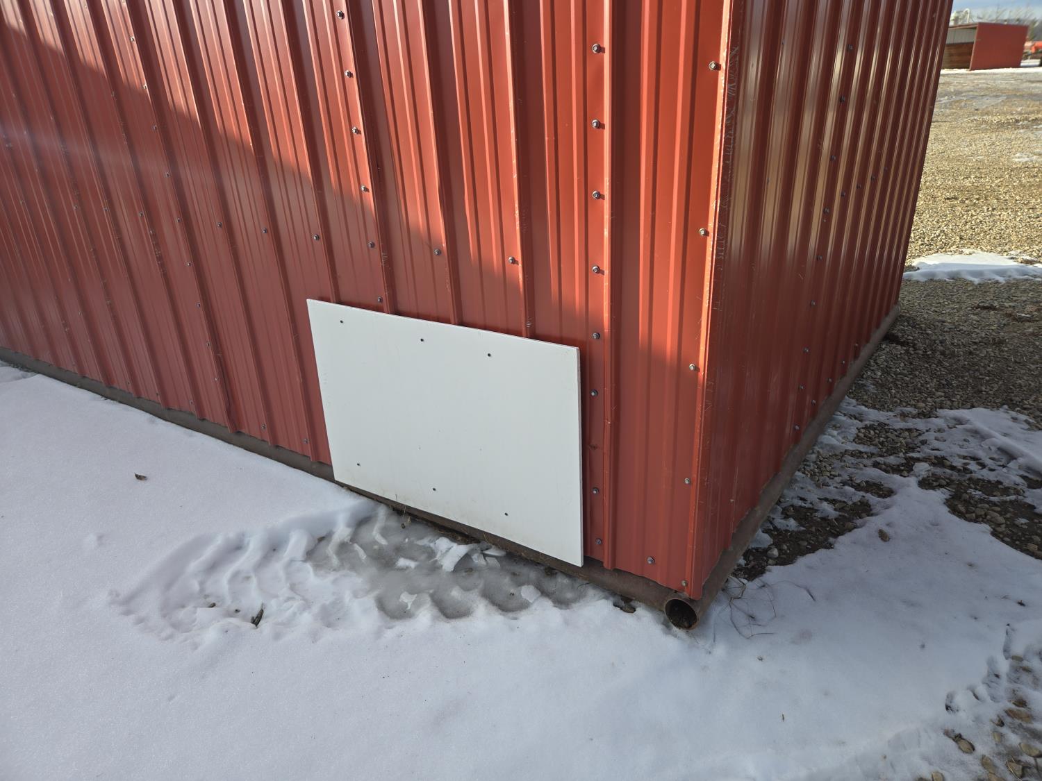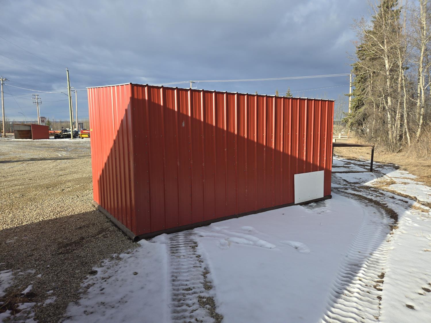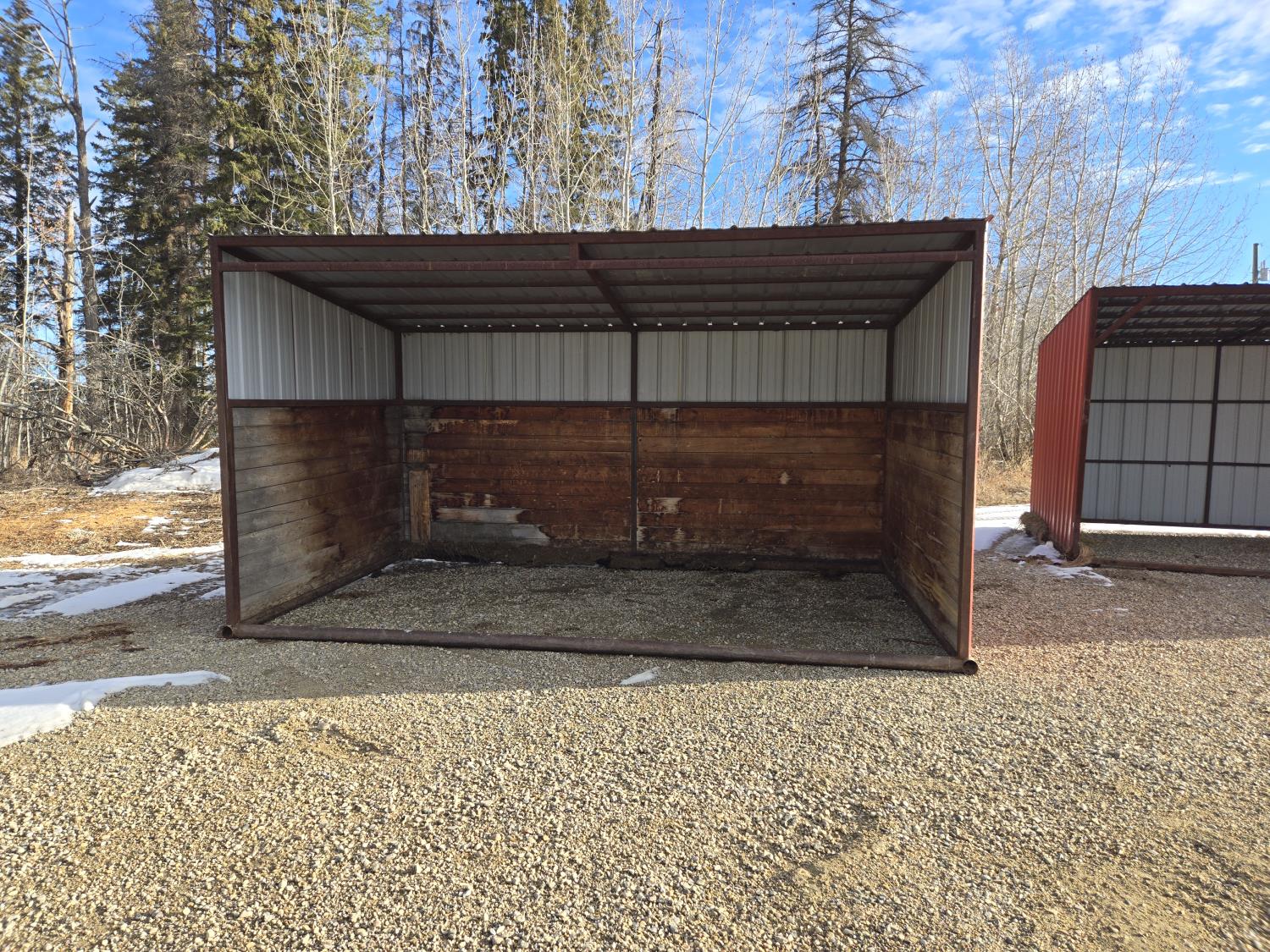 Square tube frame, metal roof and red side wall cladding, wood lined inside part way up, 8 ft high in front, 7 ft ft high at rear, no skids