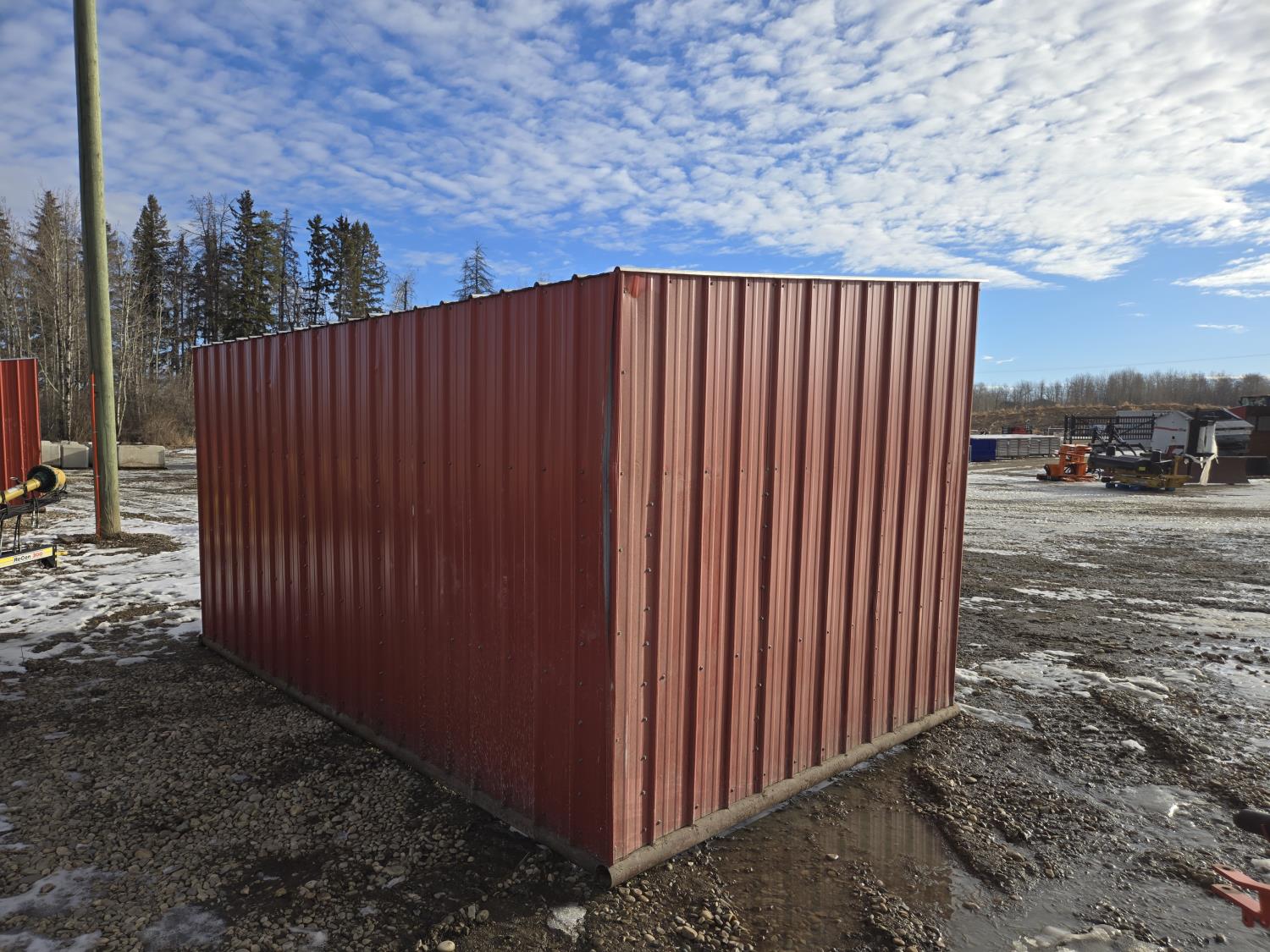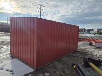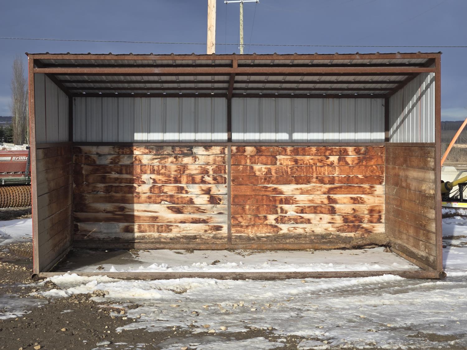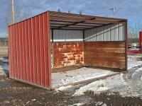 Square tube frame, metal roof and red side wall cladding, wood lined inside part way up, 8 ft high in front, 7 ft ft high at rear, no skids