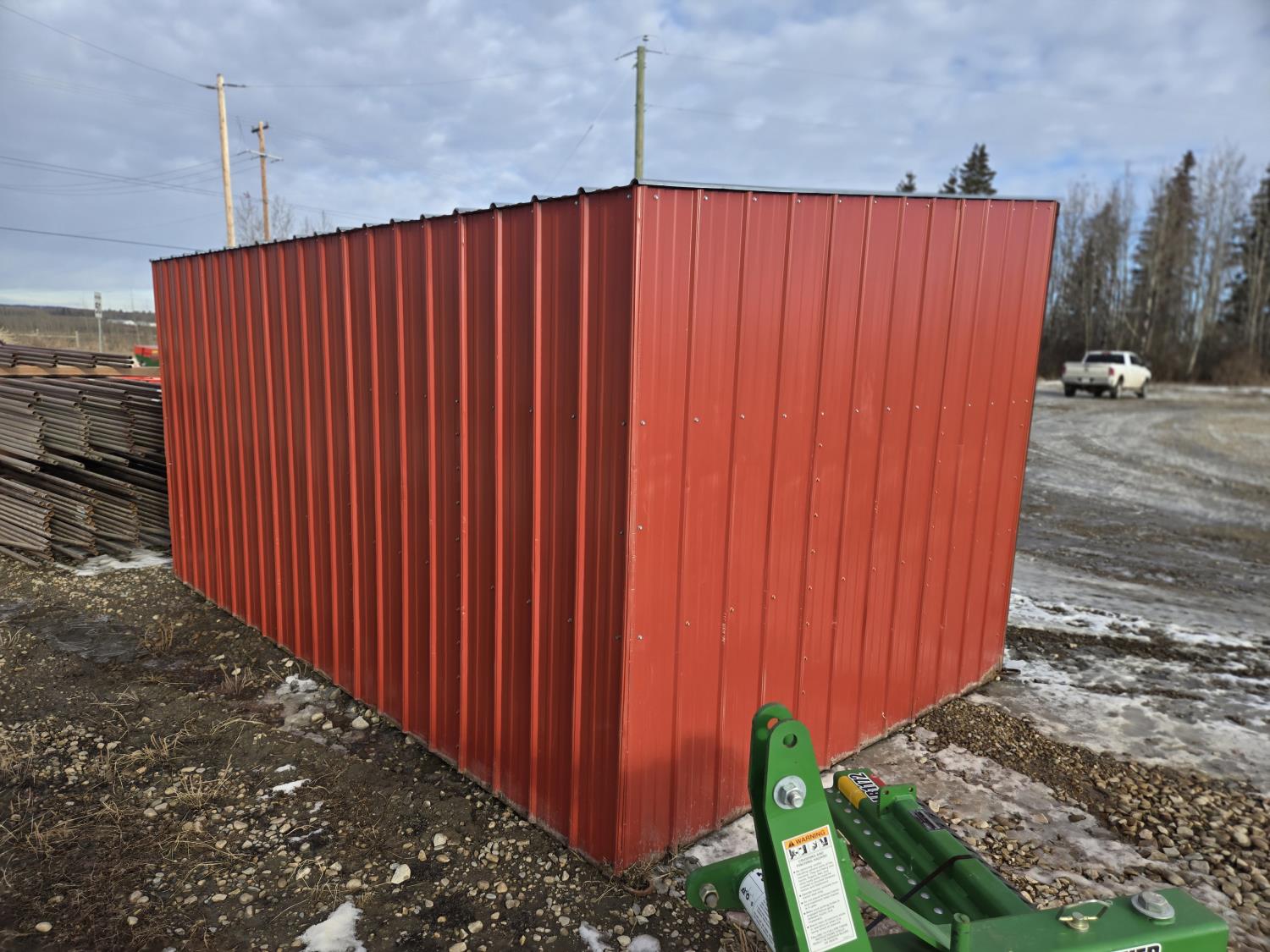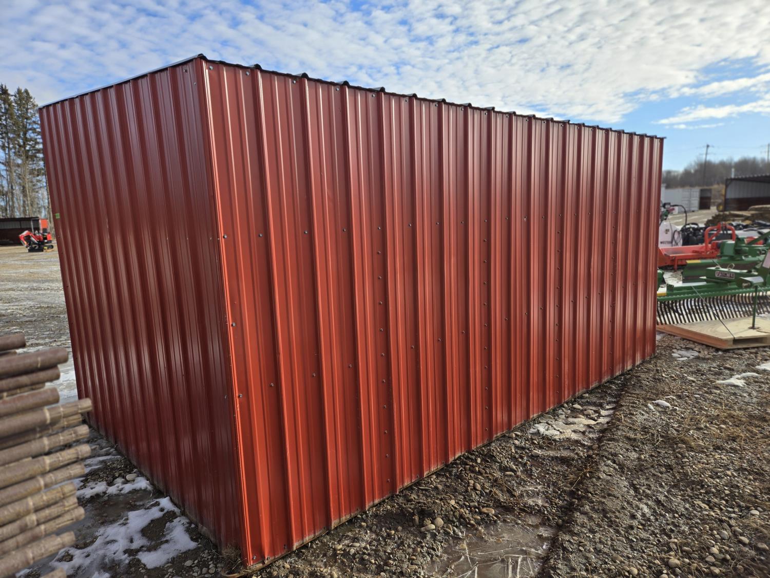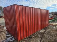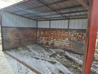 Square tube frame, metal roof and red side wall cladding, wood lined inside part way up, 8 ft high in front, 7 ft ft high at rear, no skids