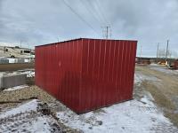 Square tube frame, metal roof and red side wall cladding, wood lined inside part way up, 8 ft high in front, 7 ft ft high at rear, no skids