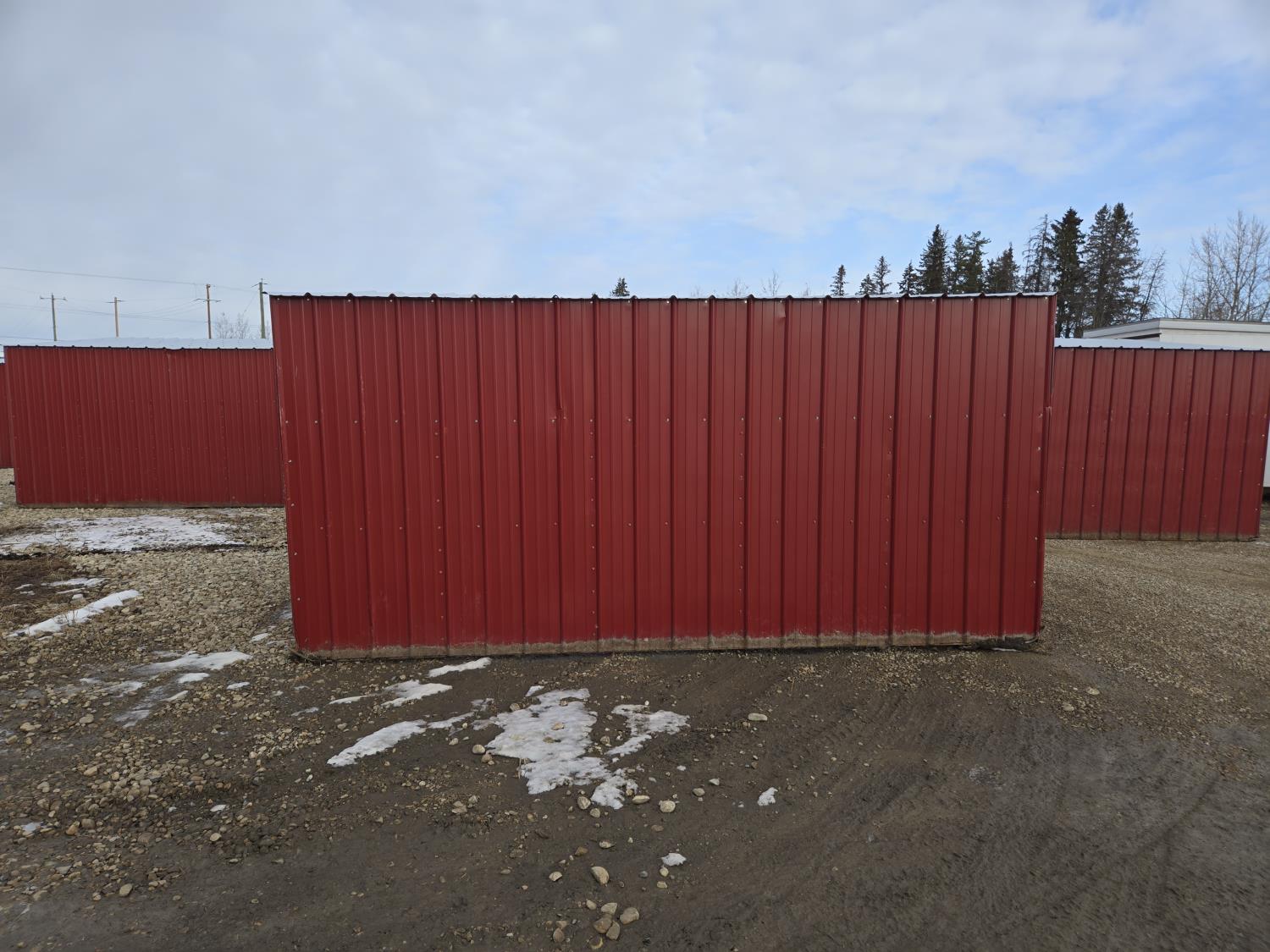 Square tube frame, metal roof and red side wall cladding, wood lined inside part way up, 8 ft high in front, 7 ft ft high at rear, no skids
