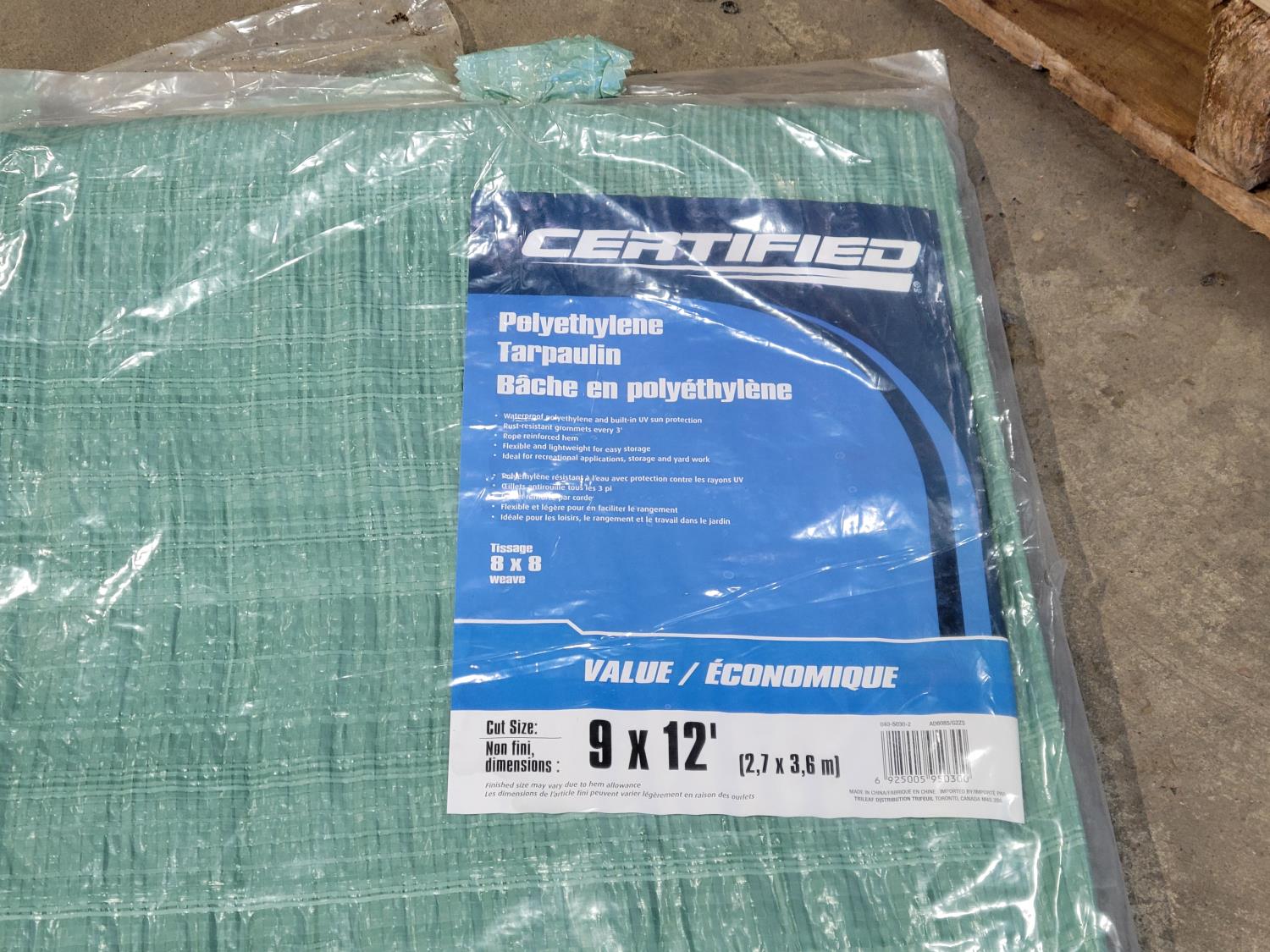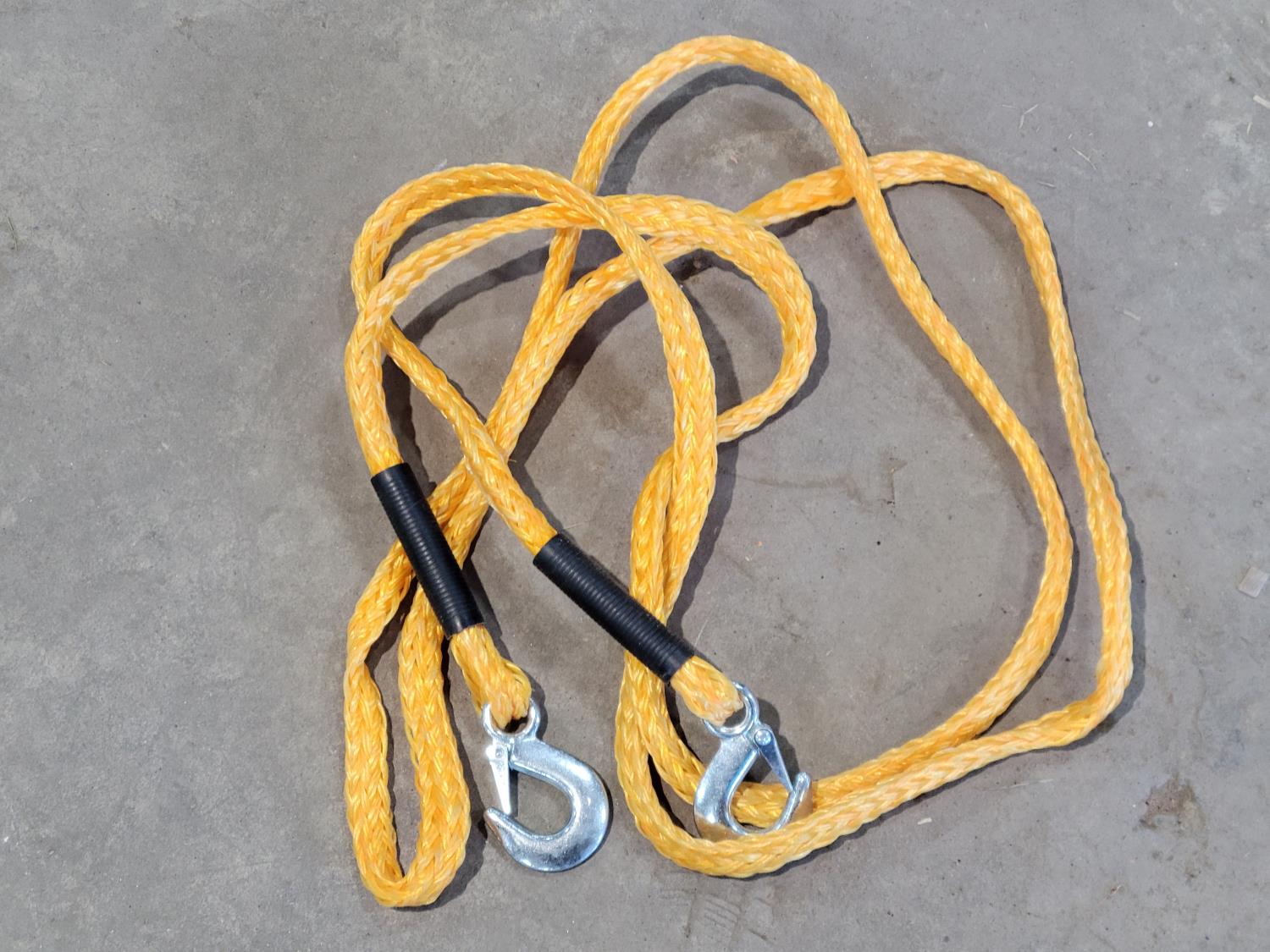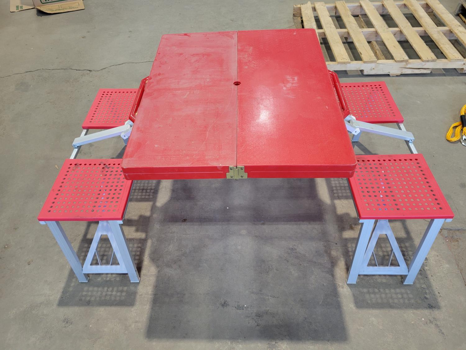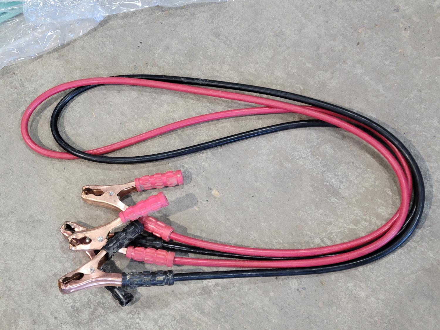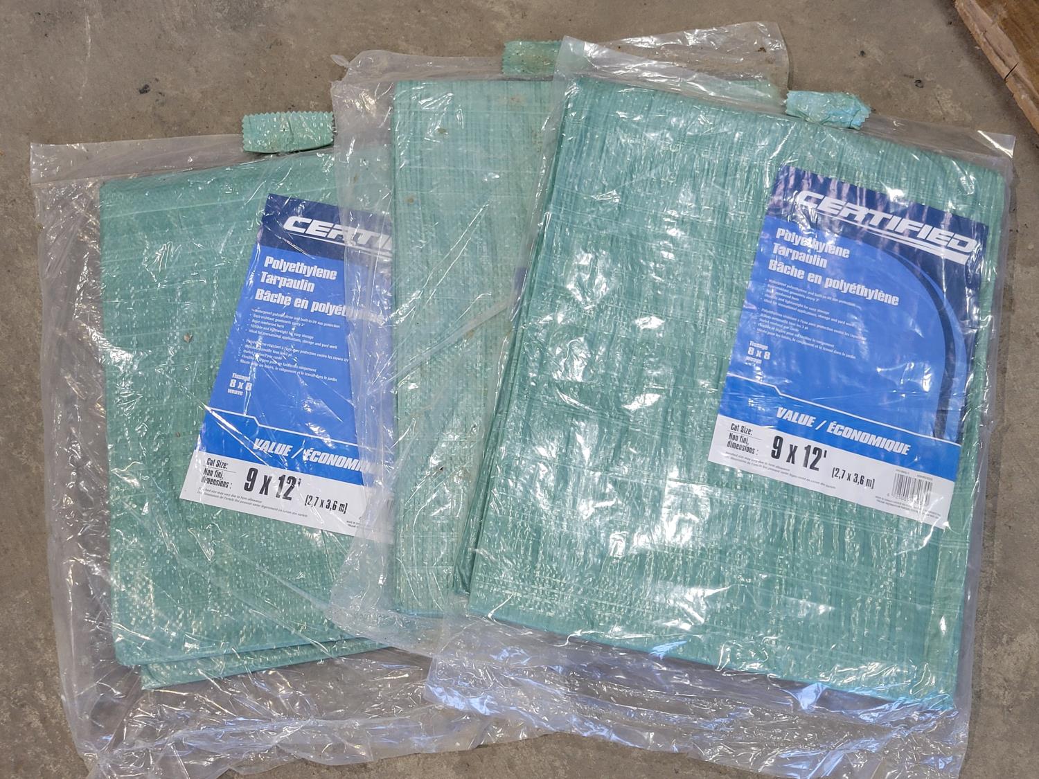 Folding picnic table, (2) jerry cans, (3) 9 ft x 12 ft poly tarps, ATV tow rope, booster cables