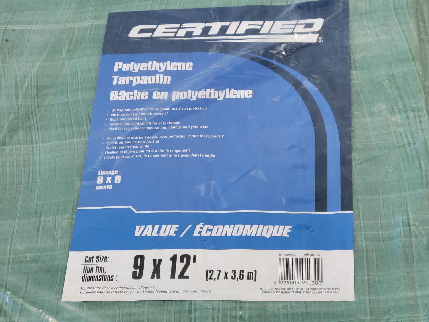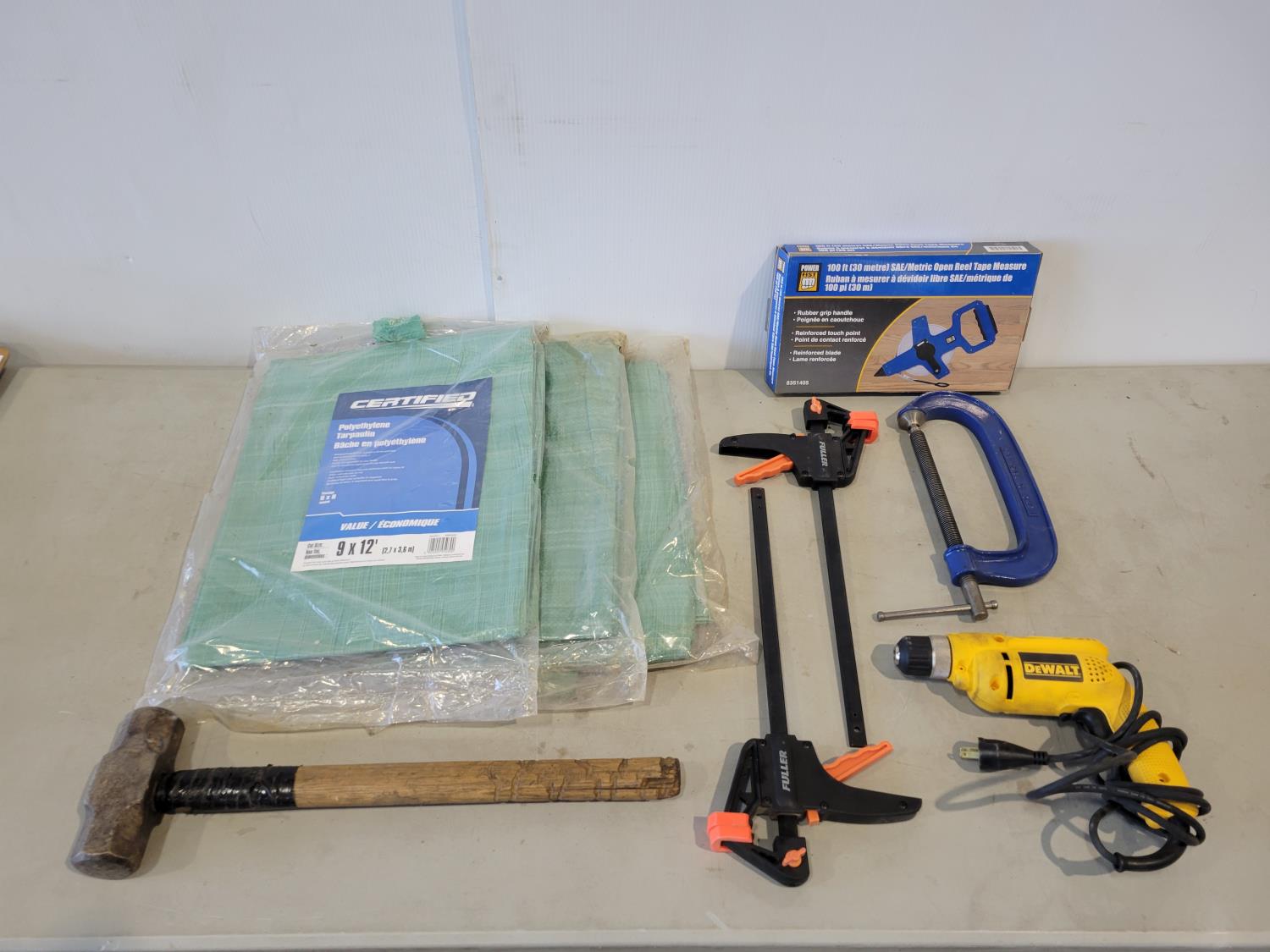(3) 9 ft x 12 ft poly tarps, (2) 12 inch Fuller wood clamps, 8 inch C-clamp, Power Fist 100 ft open reel tape measure, DeWalt 3/8 inch drill