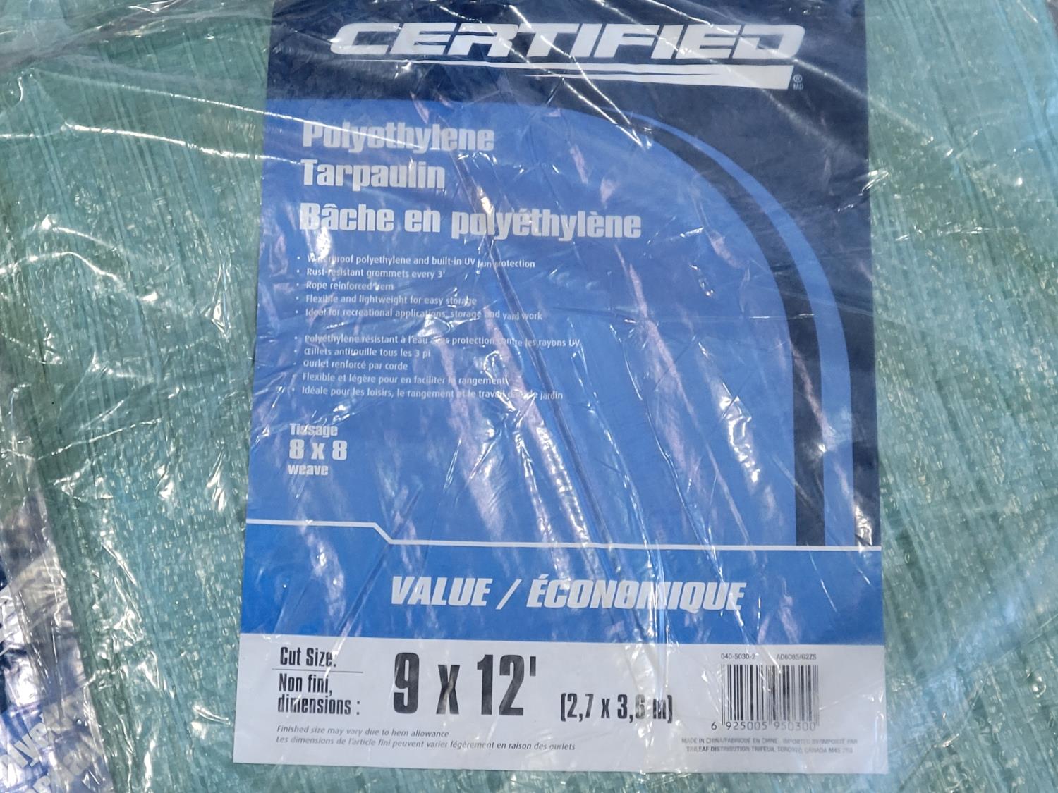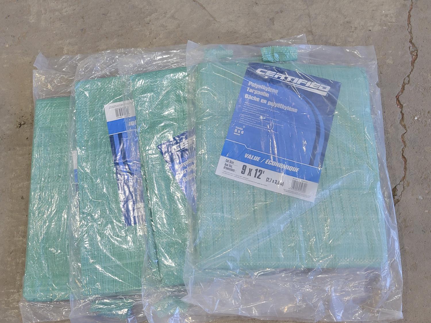 (2) 100 ft extension cords, Stanley FatMax 4 ft level, (4) 9 ft x 12 ft poly tarps