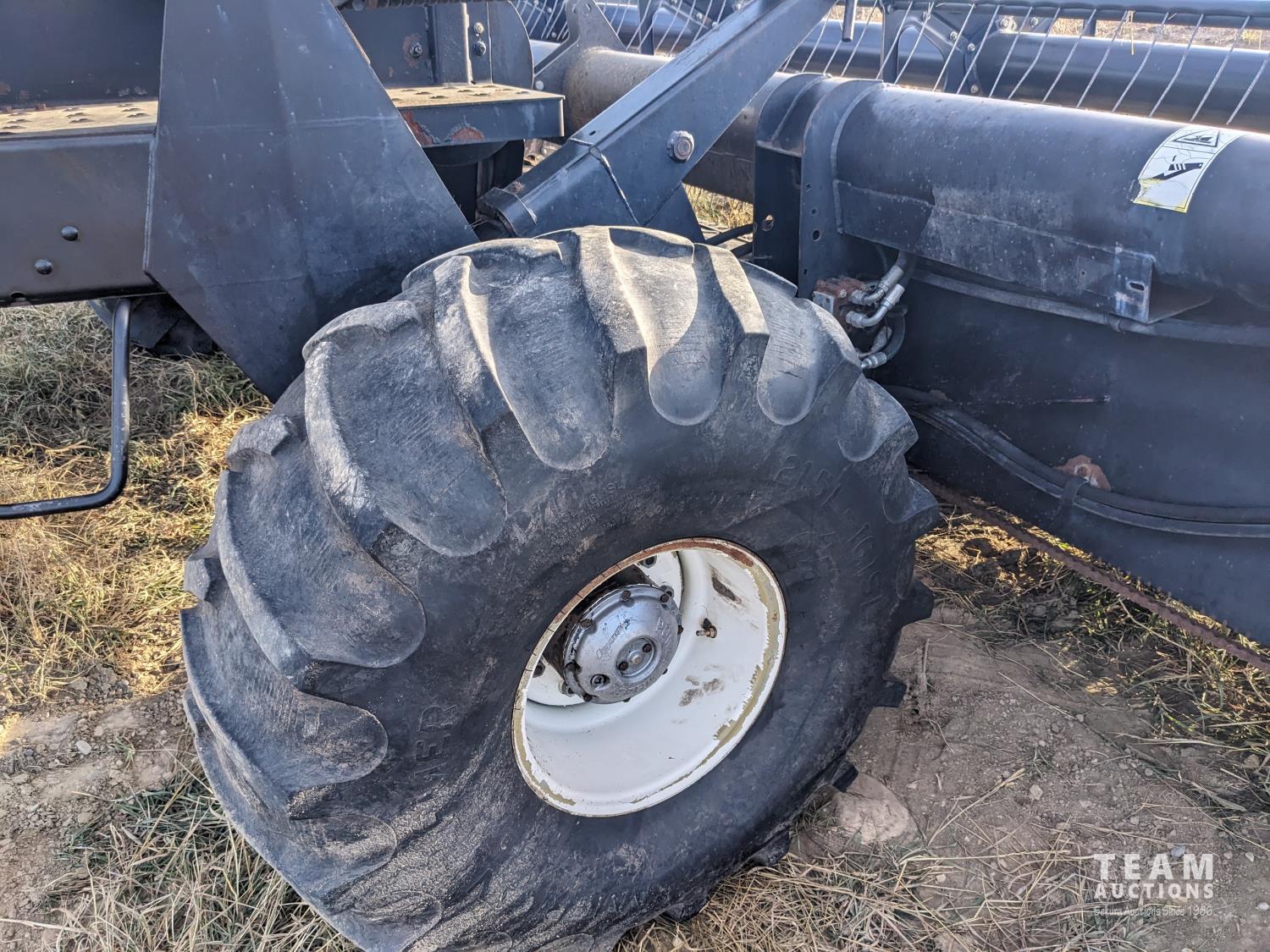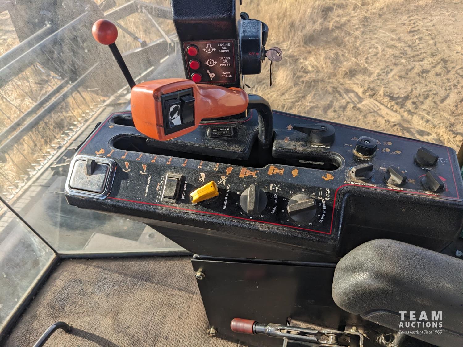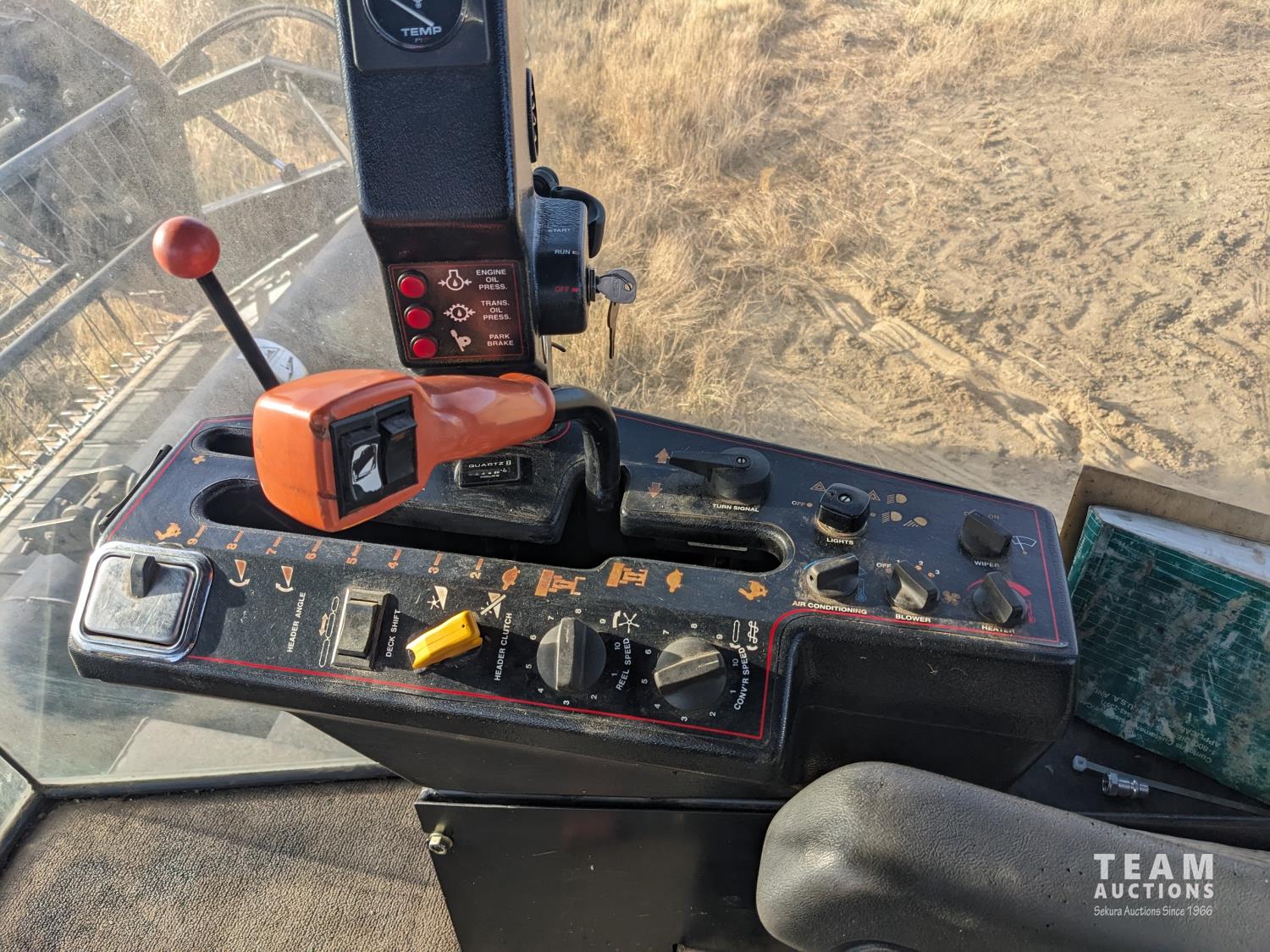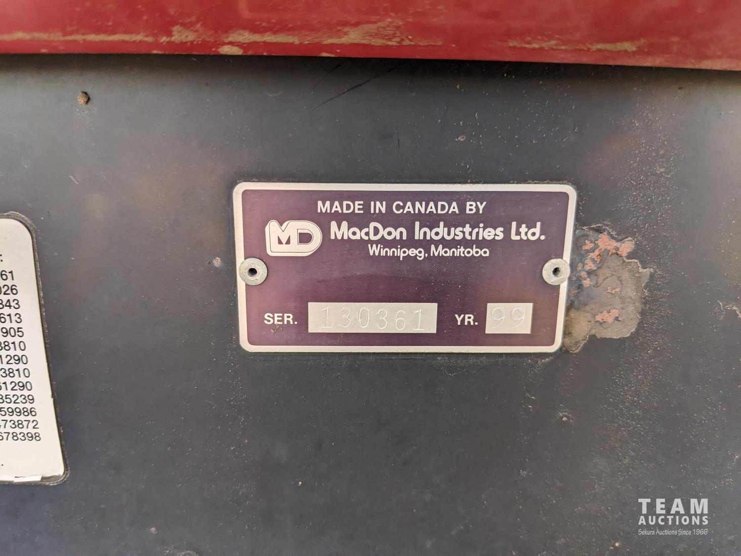 1999 Macdon 972 triple delivery rigid draper header, pickup reel, Cummins 3.9 L 4 cylinder diesel engine, A/C, radio, 21.5-16.1 front tires