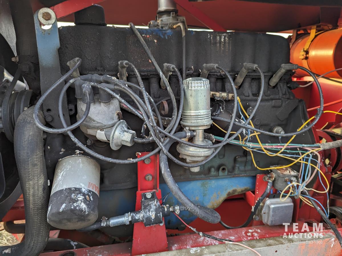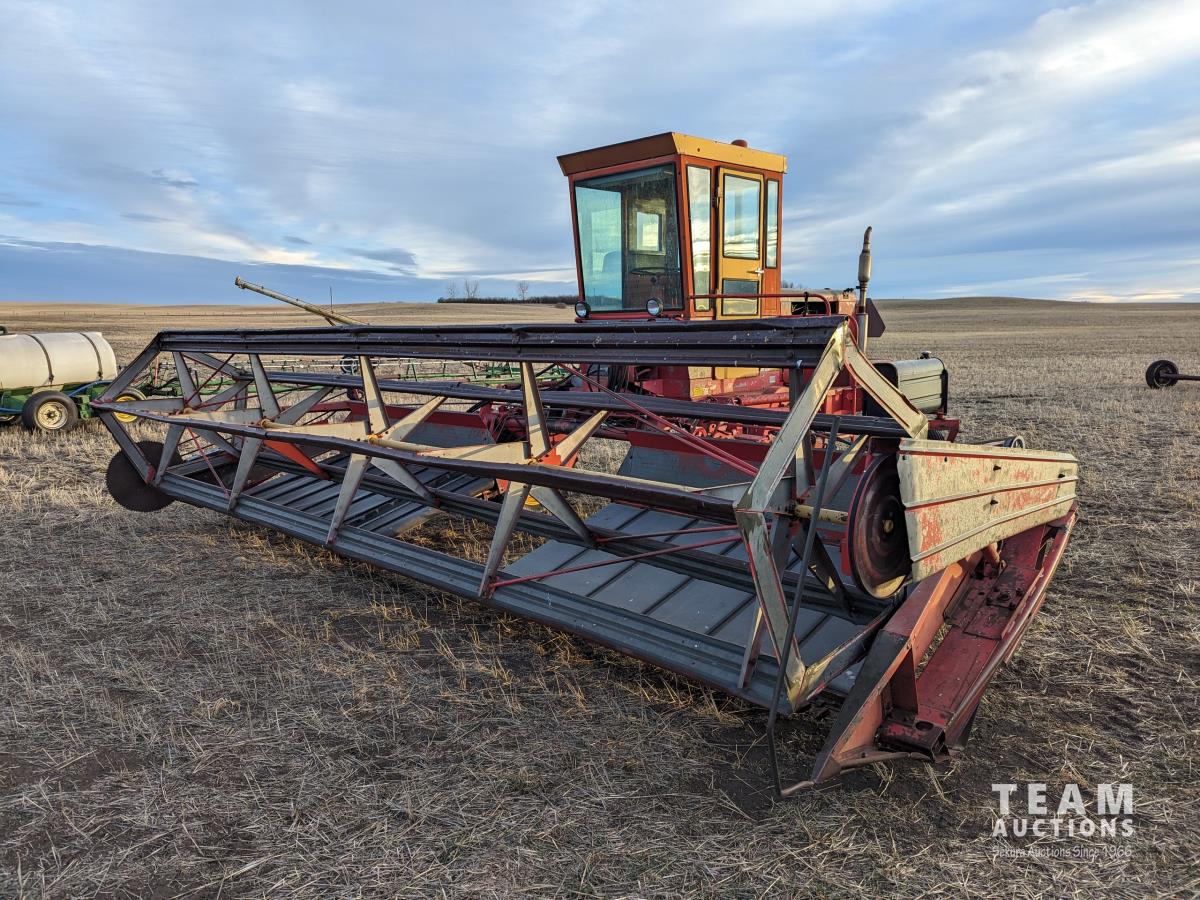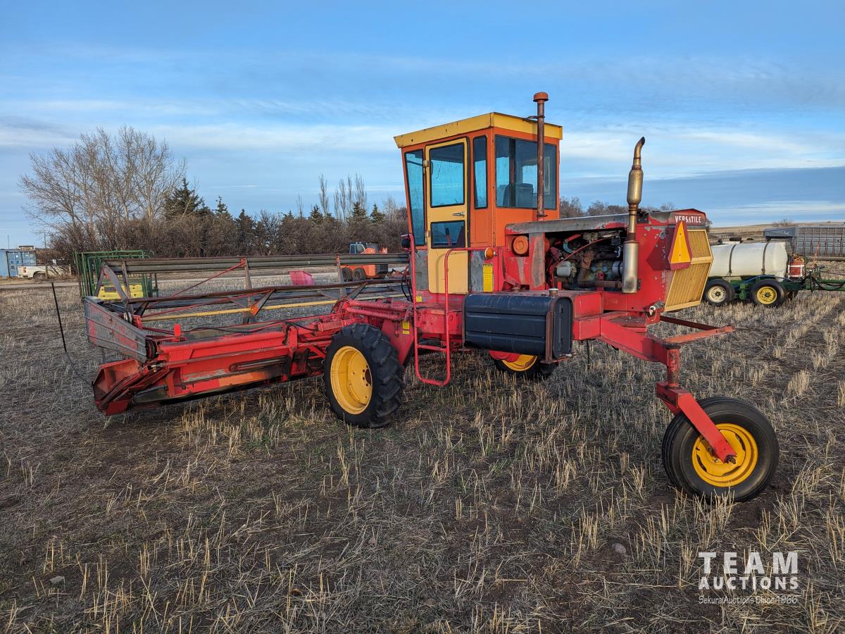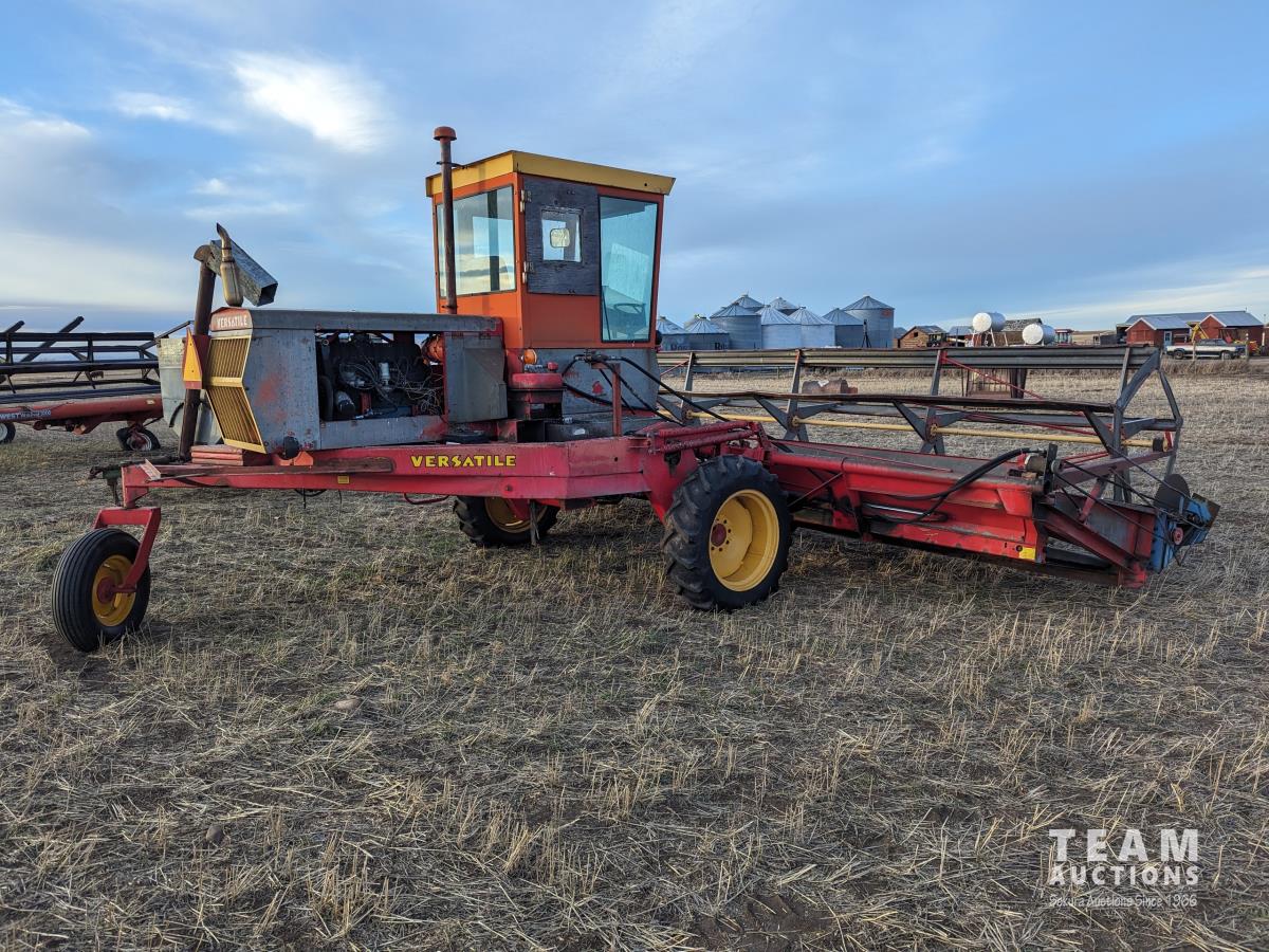 1979 Versatile 400 center delivery rigid draper header, batt reel, crop dividers, Ford 6 cylinder diesel engine, 11.2/10-24 front tires, 7.6-15SL rear tires