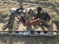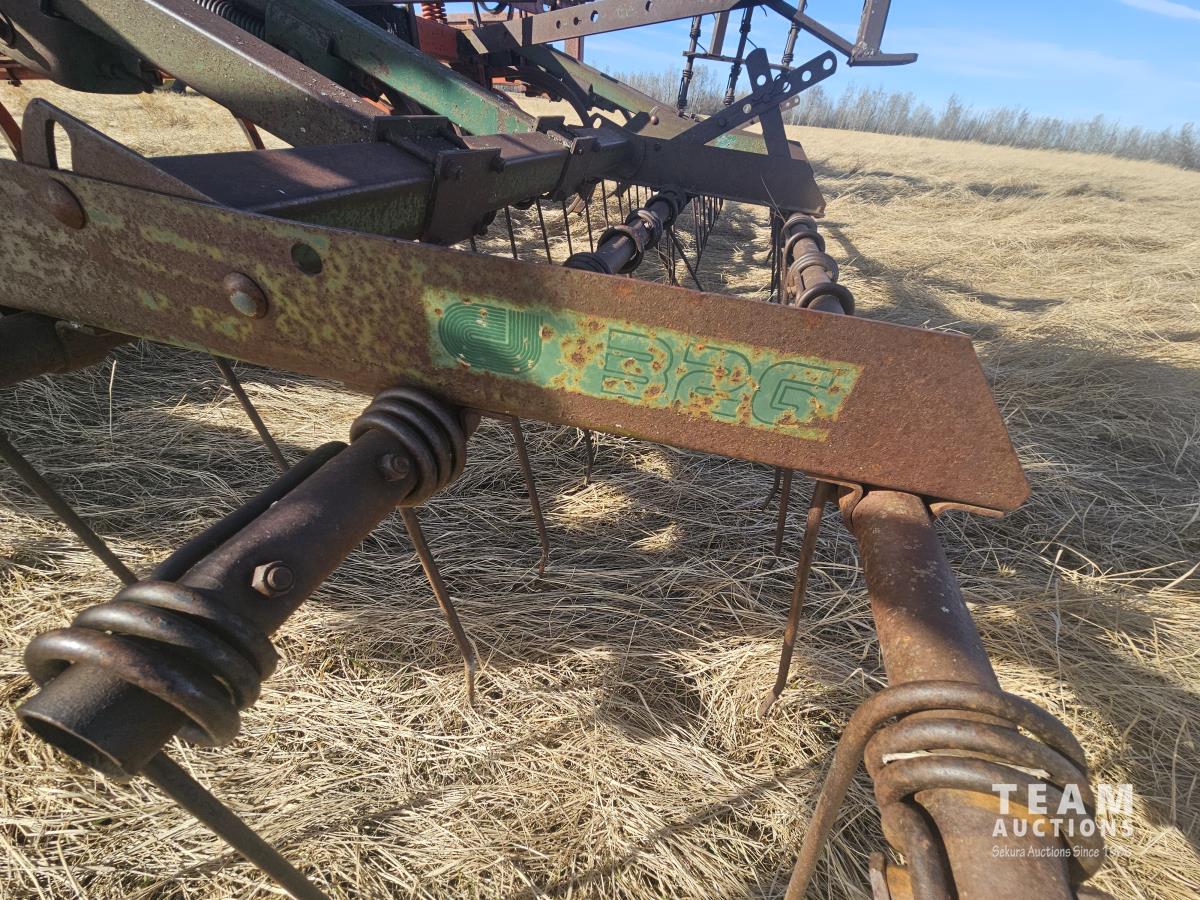 12 inch spacing, spikes, B2G 3 bar spring tooth harrows, walking axles on main frame, walking axles on wings, (33) 16 inch sweeps, (31) 4 inch spoons, 7.60-15 tires