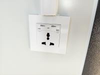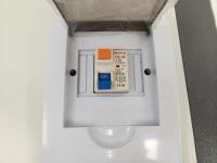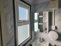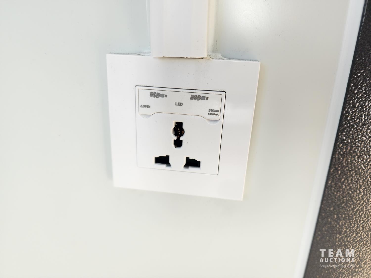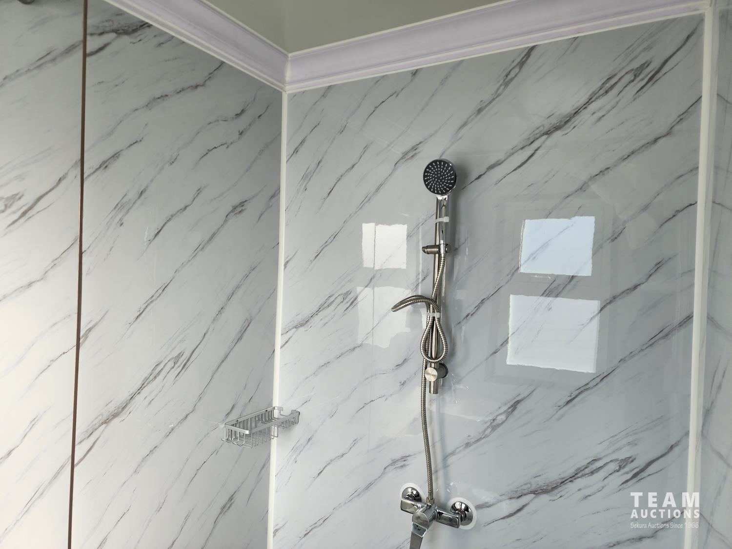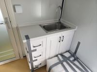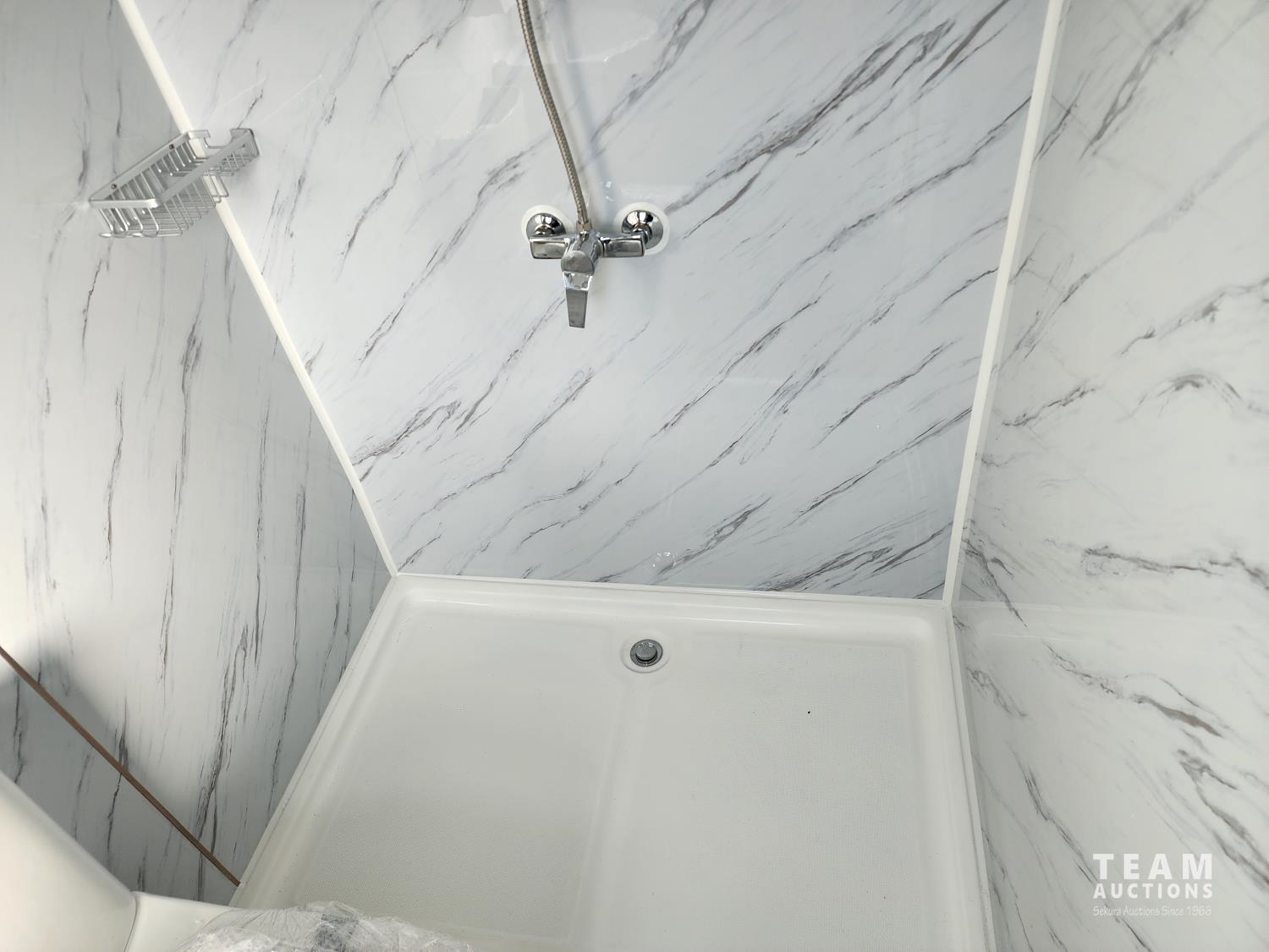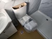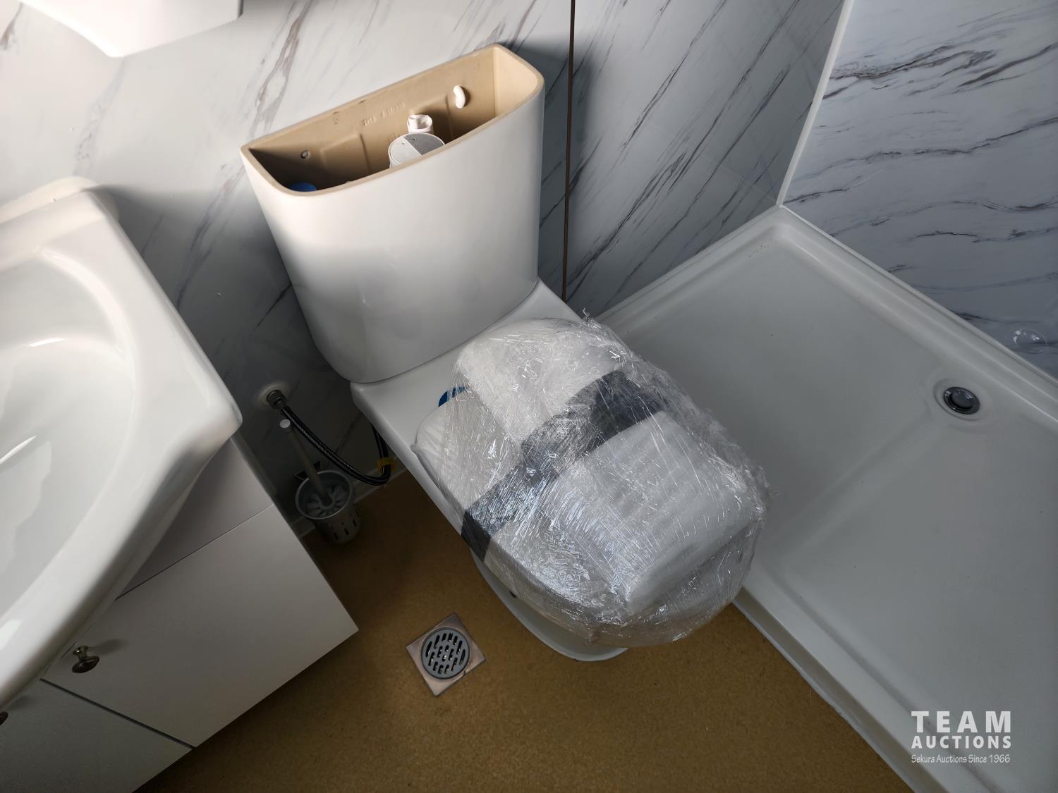 110v, bathroom with sink, toilet and shower, wash station sink and cupboards