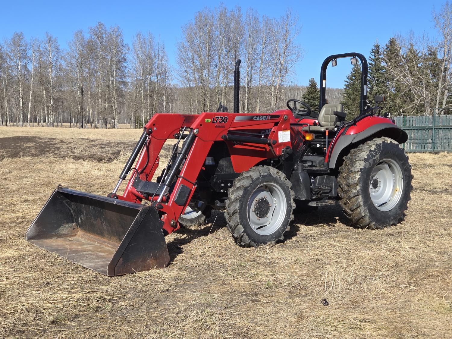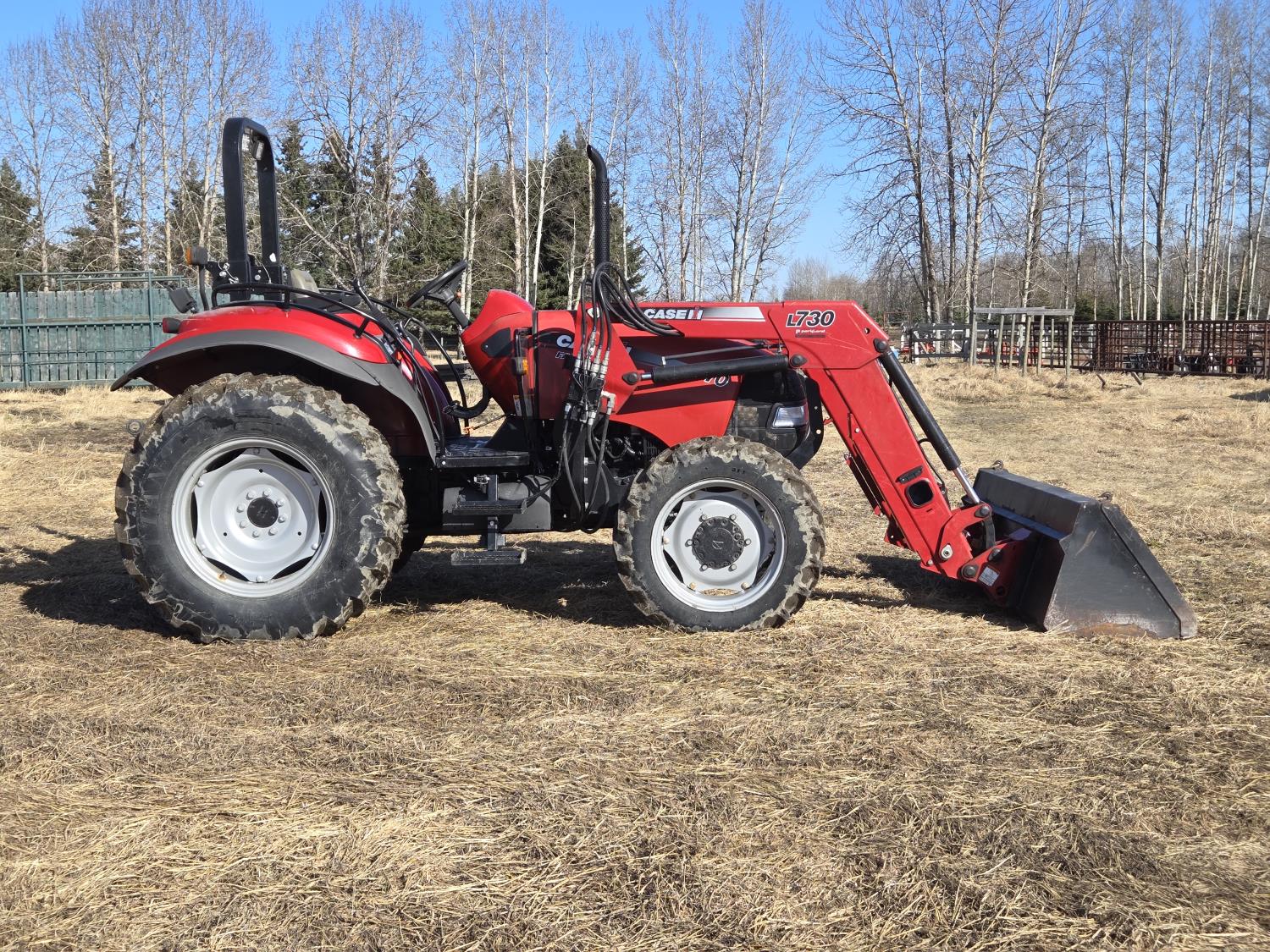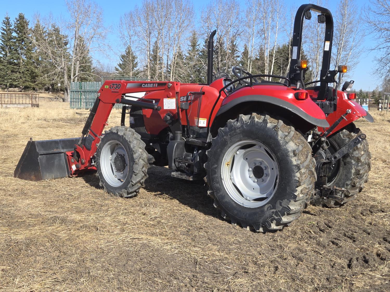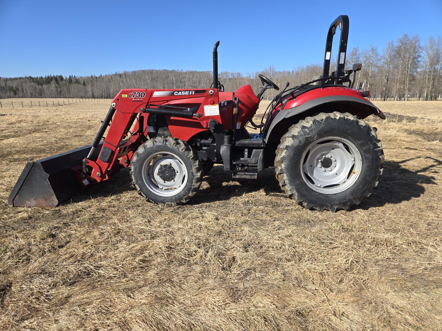 Case IH L730 loader, Q/A, 84 inch bucket, mid mount hydraulic connection, FTP 3.2 L 4 cylinder 65 HP, diesel engine, 52 PTO HP, 12 speed manual transmission, open station platform, mechanical shuttle shift, skid steer Q/A, 540 PTO, 3 point hitch, 3 rear hydraulic outlets, 9.5-24 front tires, 14.9-28 rear tires