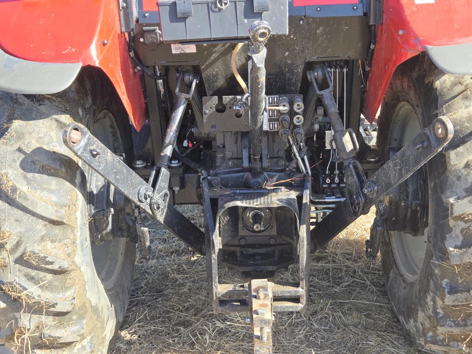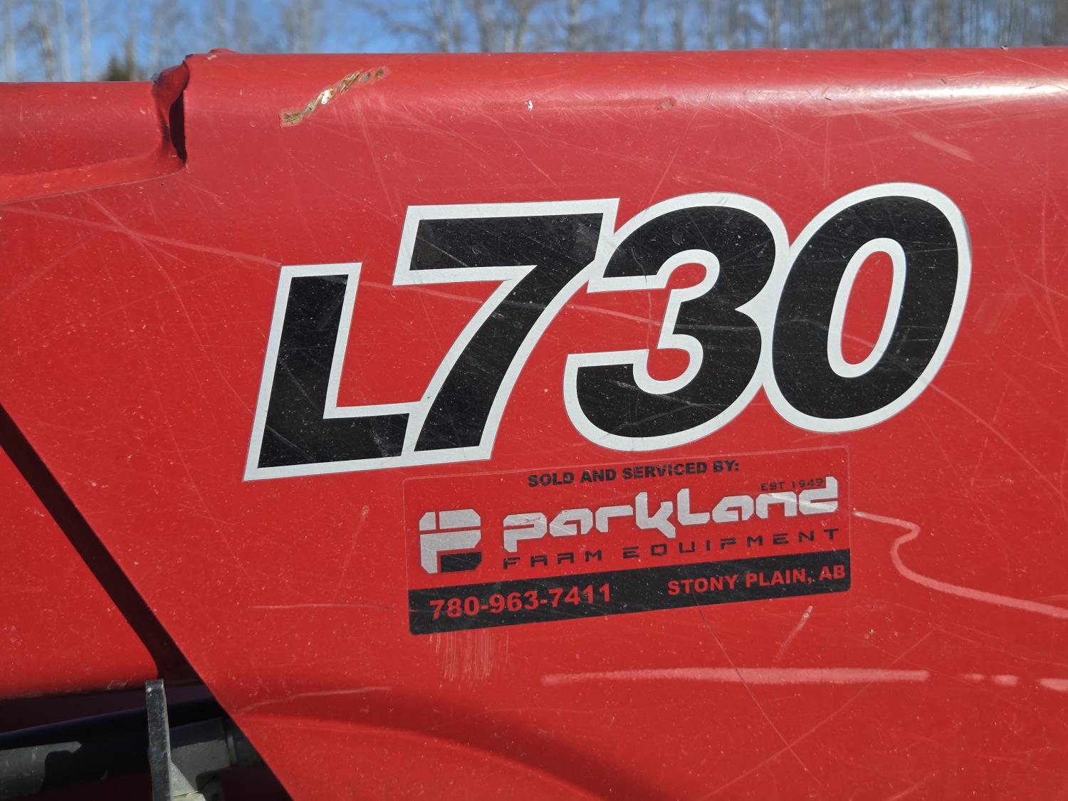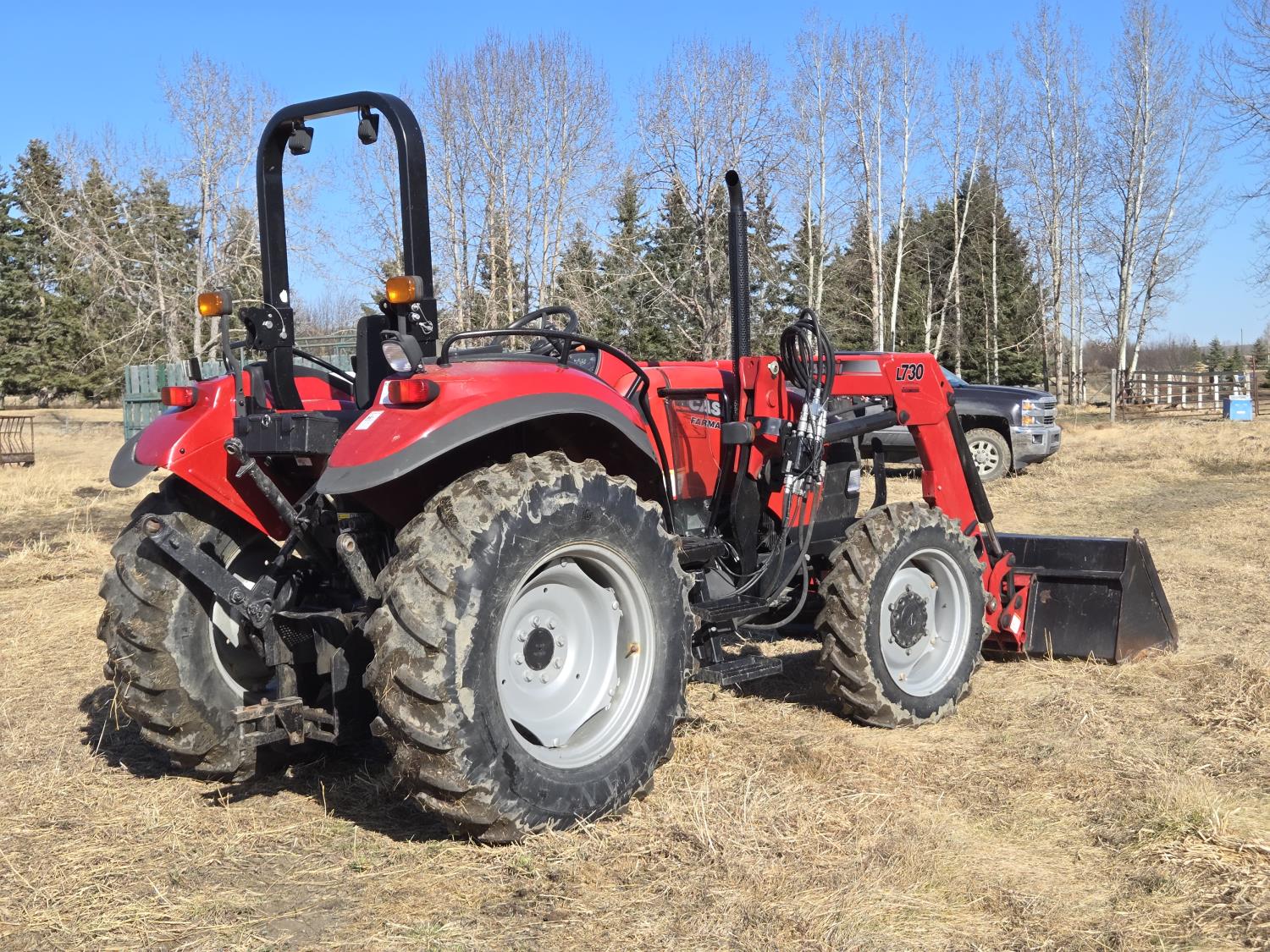 Case IH L730 loader, Q/A, 84 inch bucket, mid mount hydraulic connection, FTP 3.2 L 4 cylinder 65 HP, diesel engine, 52 PTO HP, 12 speed manual transmission, open station platform, mechanical shuttle shift, skid steer Q/A, 540 PTO, 3 point hitch, 3 rear hydraulic outlets, 9.5-24 front tires, 14.9-28 rear tires