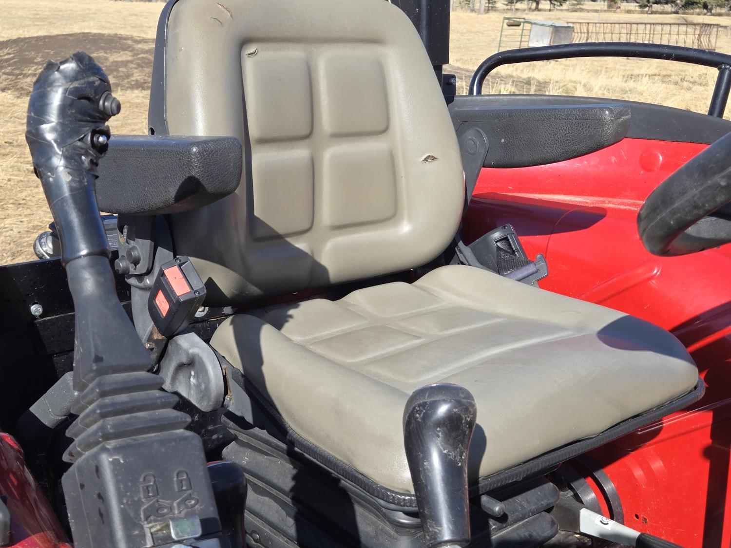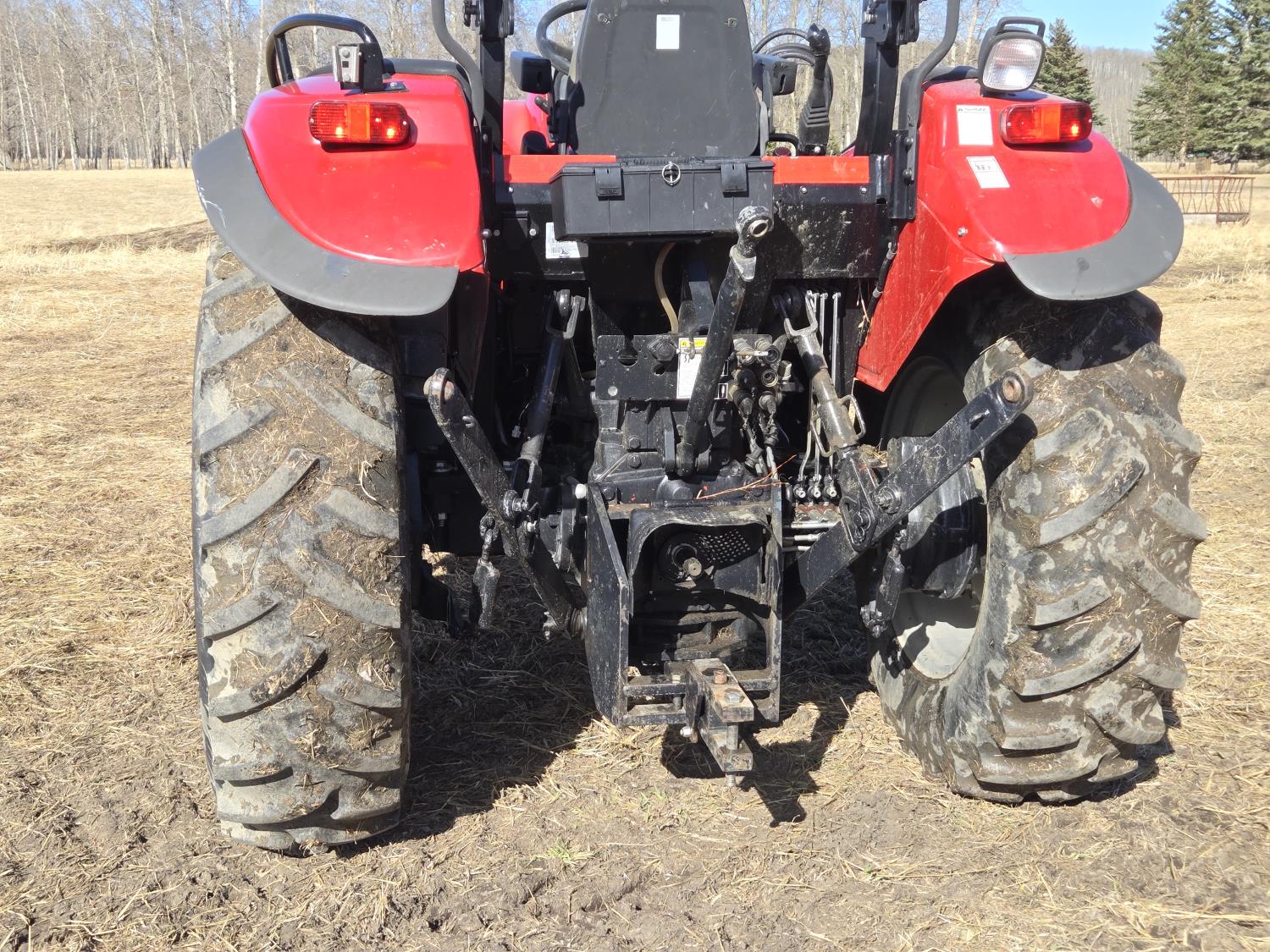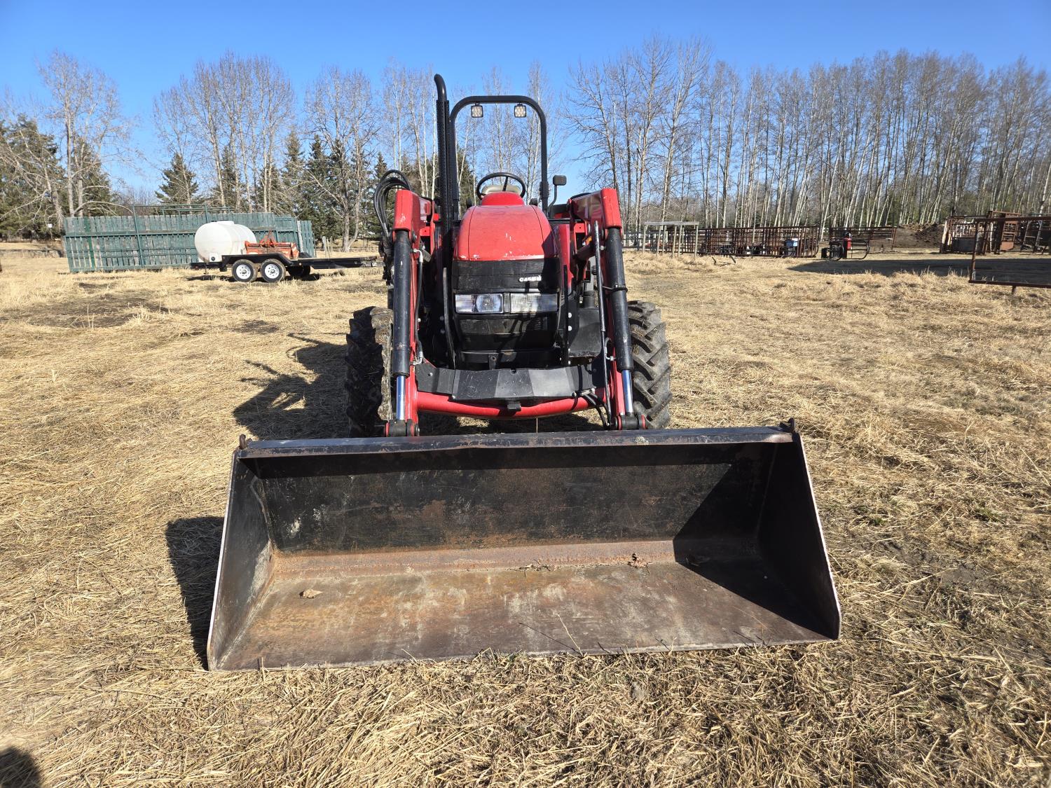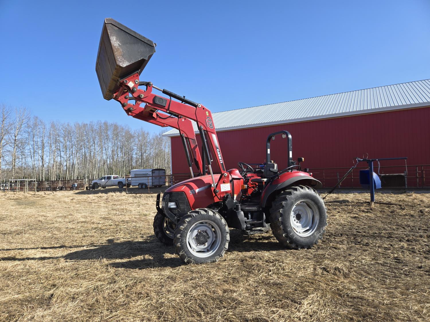 Case IH L730 loader, Q/A, 84 inch bucket, mid mount hydraulic connection, FTP 3.2 L 4 cylinder 65 HP, diesel engine, 52 PTO HP, 12 speed manual transmission, open station platform, mechanical shuttle shift, skid steer Q/A, 540 PTO, 3 point hitch, 3 rear hydraulic outlets, 9.5-24 front tires, 14.9-28 rear tires