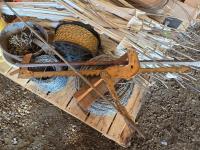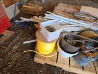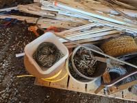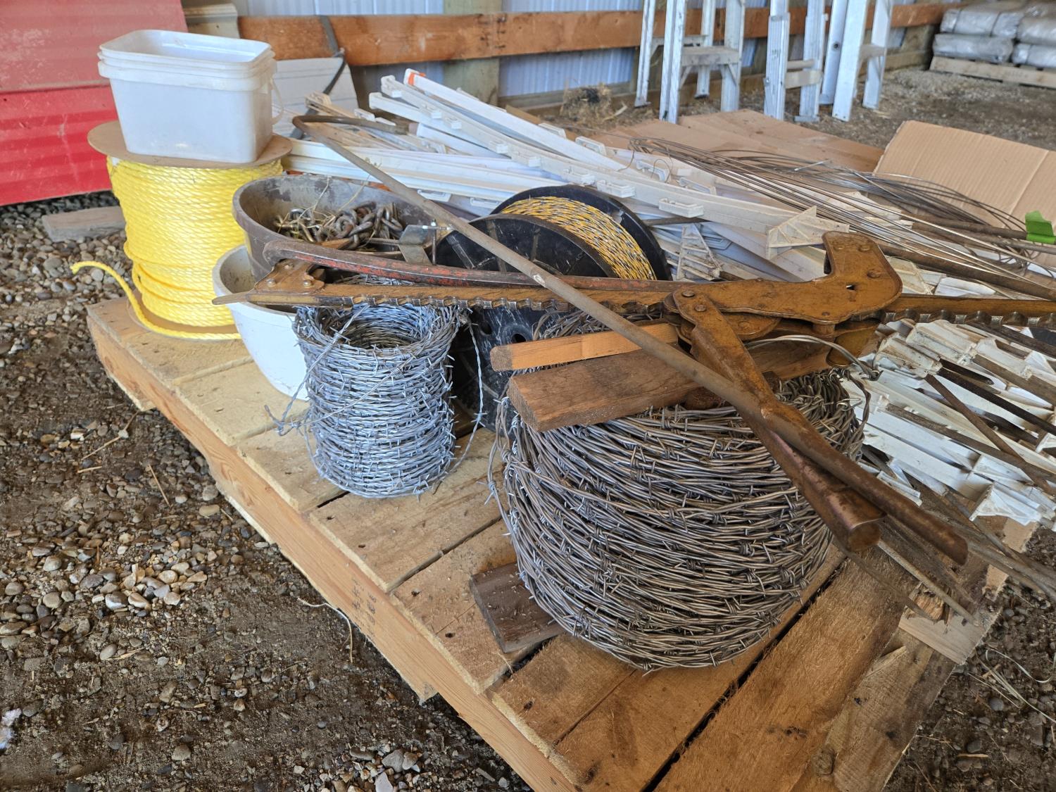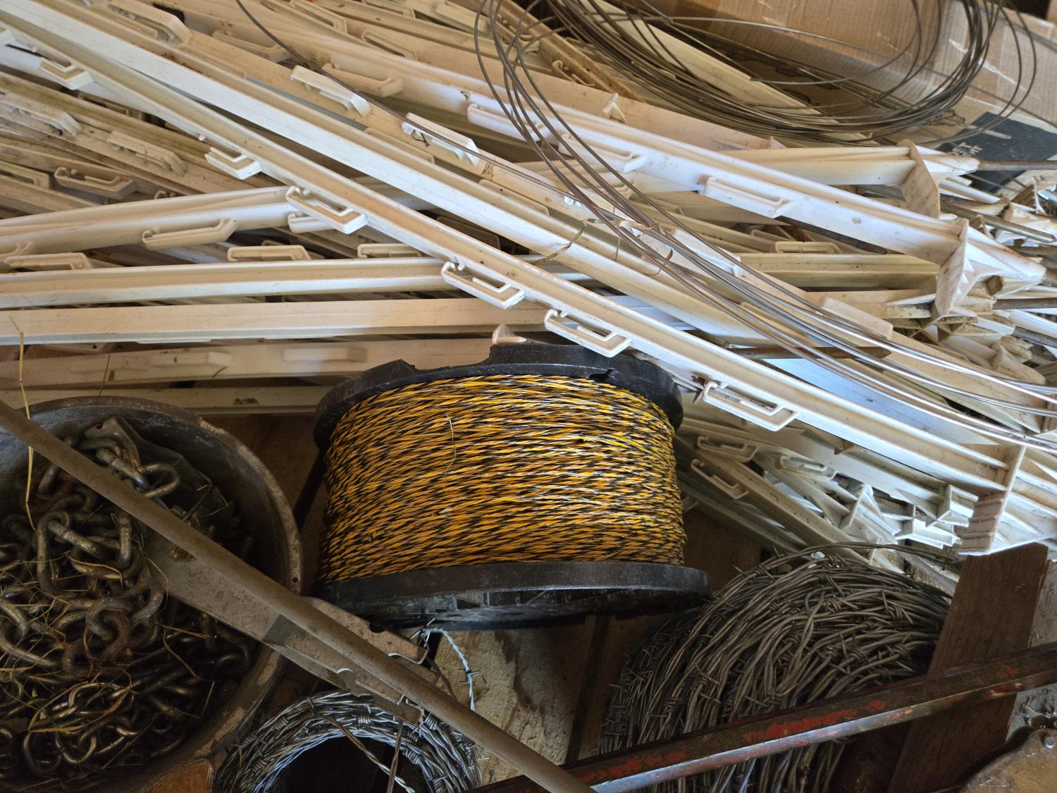 Step in electric fence posts, (1) unused roll of barb wire, (1) roll unused electric fence wire, lever wire stretcher, bar, roll of unused rope