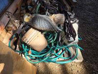 (6) garden hoses and connections, (18) hanging flower baskets, Qty of garden tools, (2) Solar light owl ornaments, plastic owl, (3) plant pots