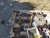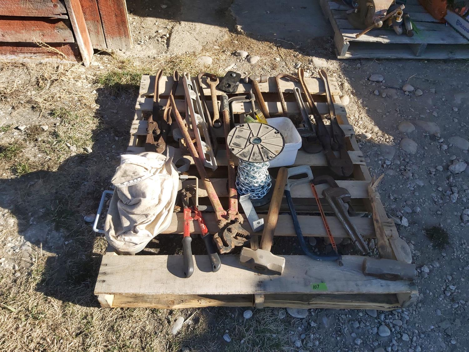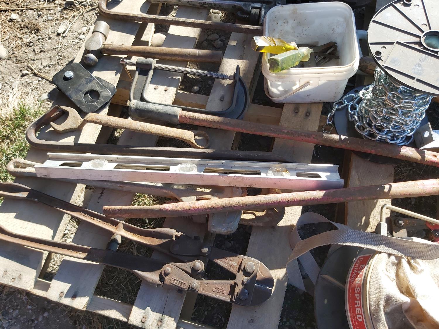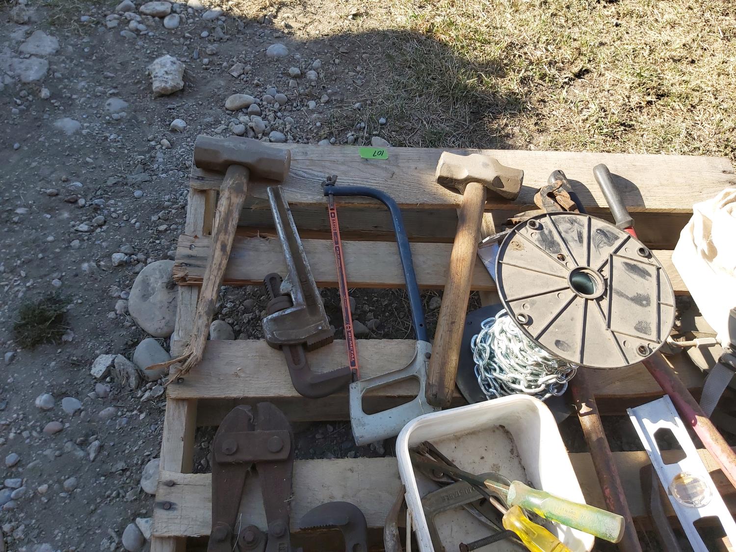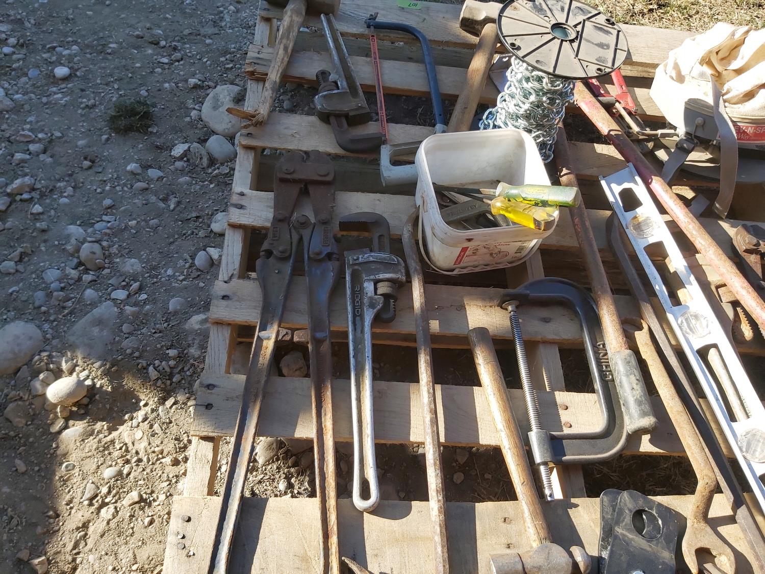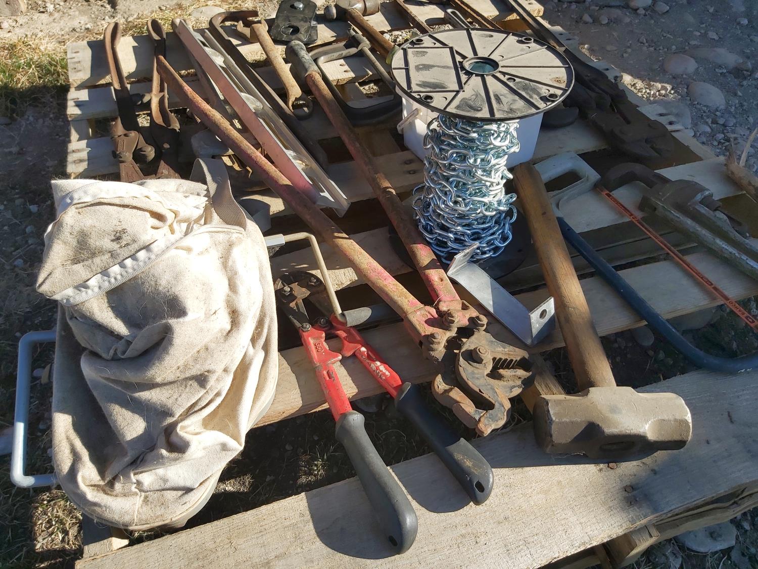 bolt cutters, pipe wrenches, hacksaw, clamp, part roll of chain, hand seeder, pry bars, hammers, truck chain plier, miscellaneous tools