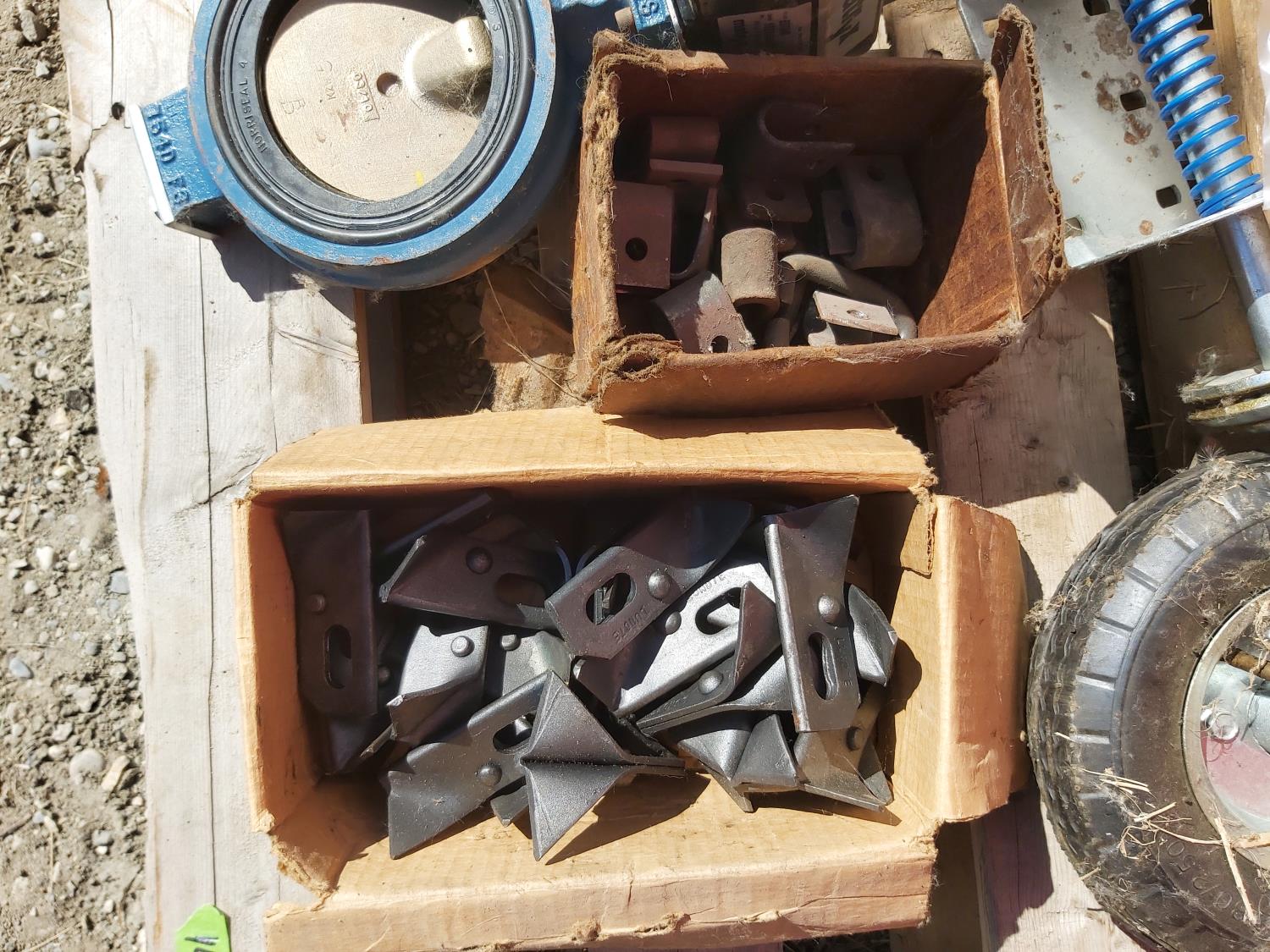 (2) funnels, oil catch pan, miscellaneous hardware, (3) actuators, (2) gate wheels, belting, baler pickup parts