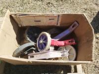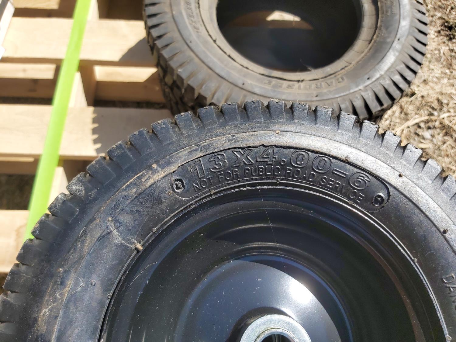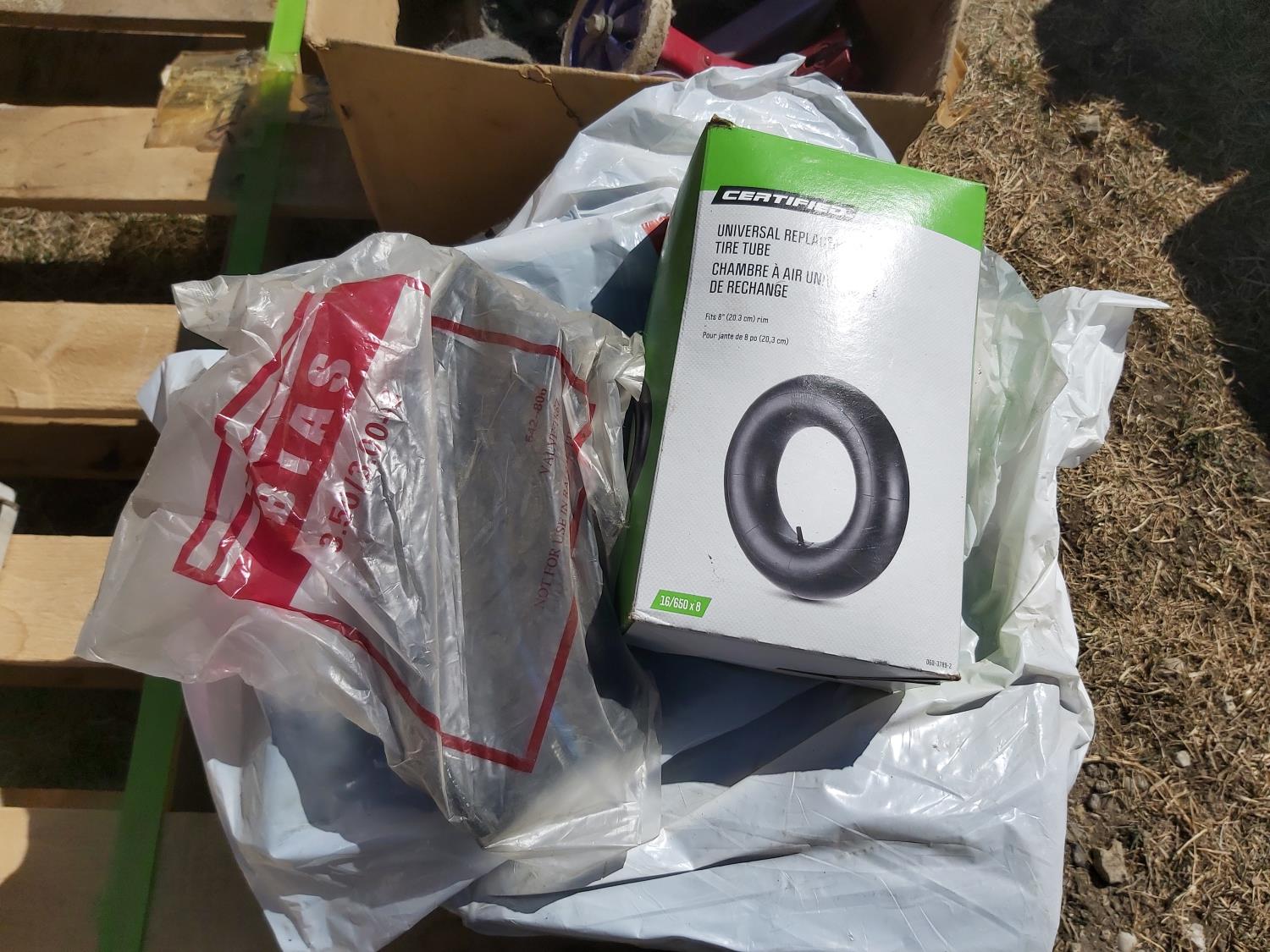 (3) 13X4.00-6 tires with rims (unused), (1) 16X650-8 tire, various inner tubes, (5) kids bike training wheels