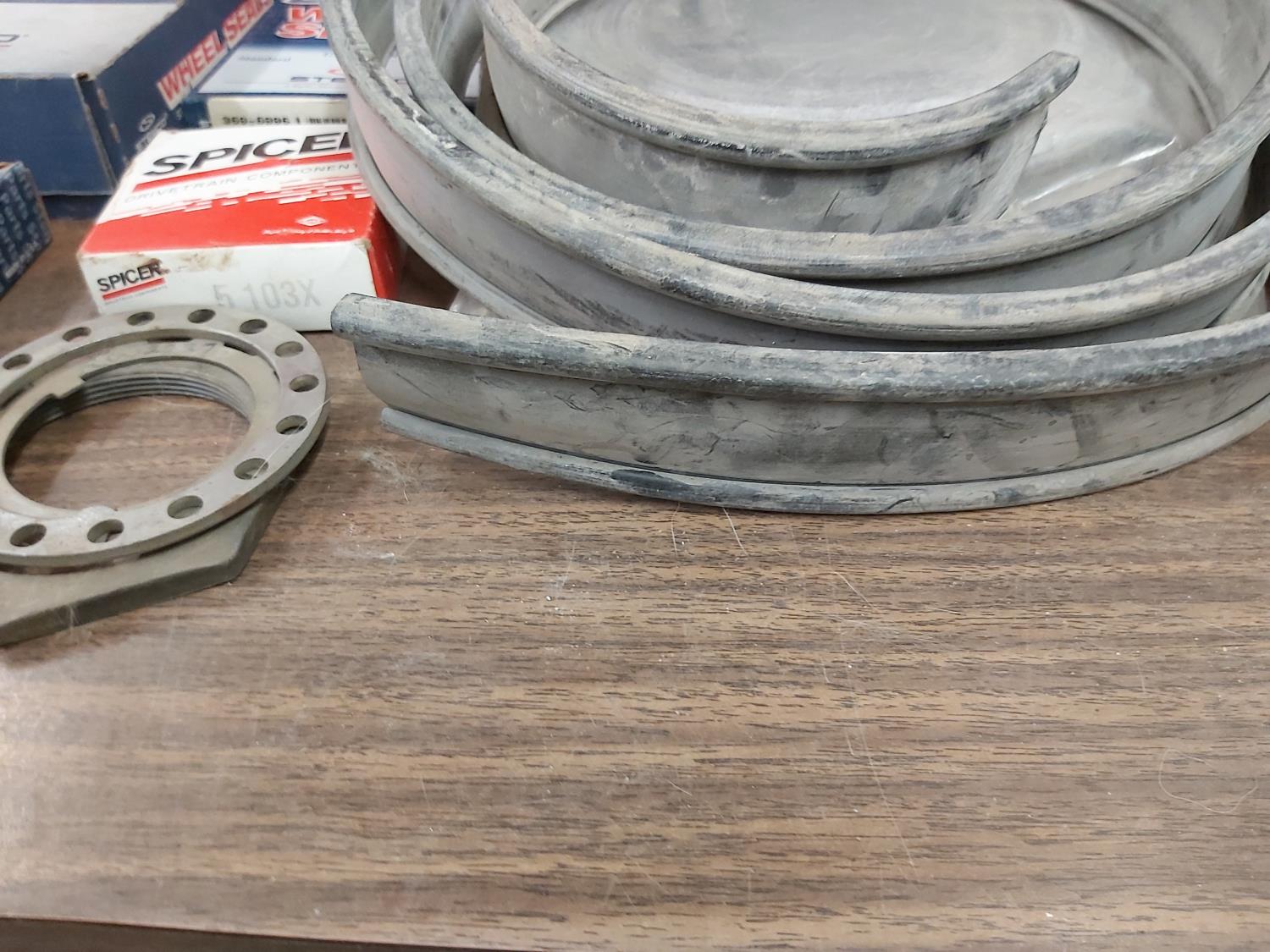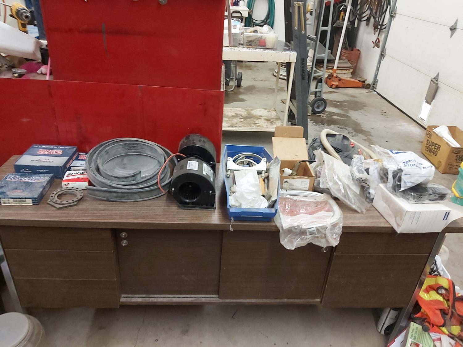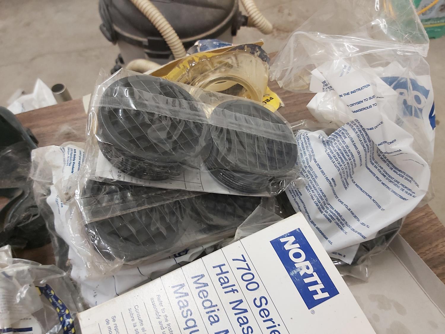(2) mask respirators with filters, miscellaneous goggles, blower, miscellaneous truck wheel seals, (2) garage door seals, miscellaneous parts