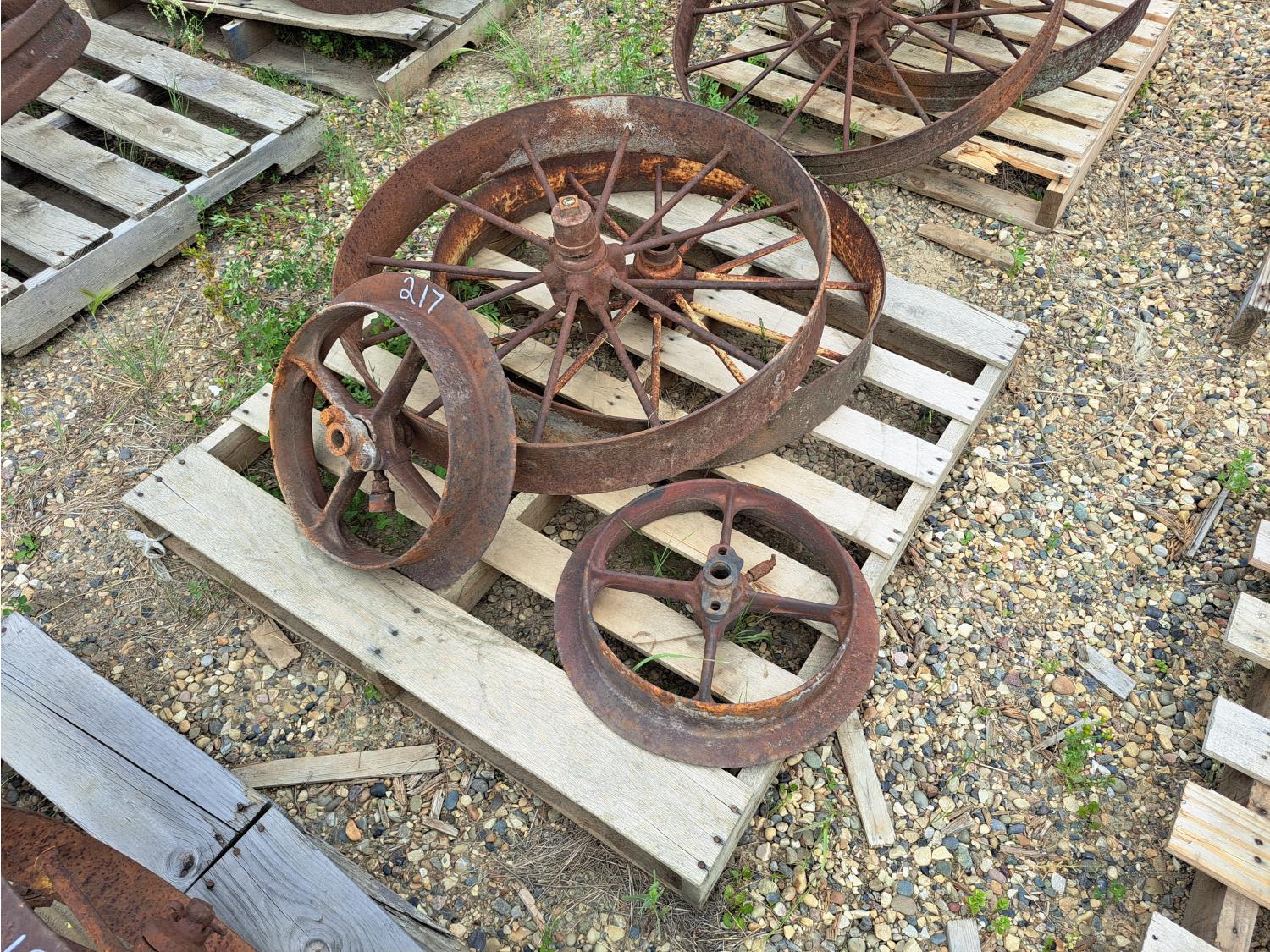 217 (2) Vintage Steel Wheels and (2) Vintage Pulleys